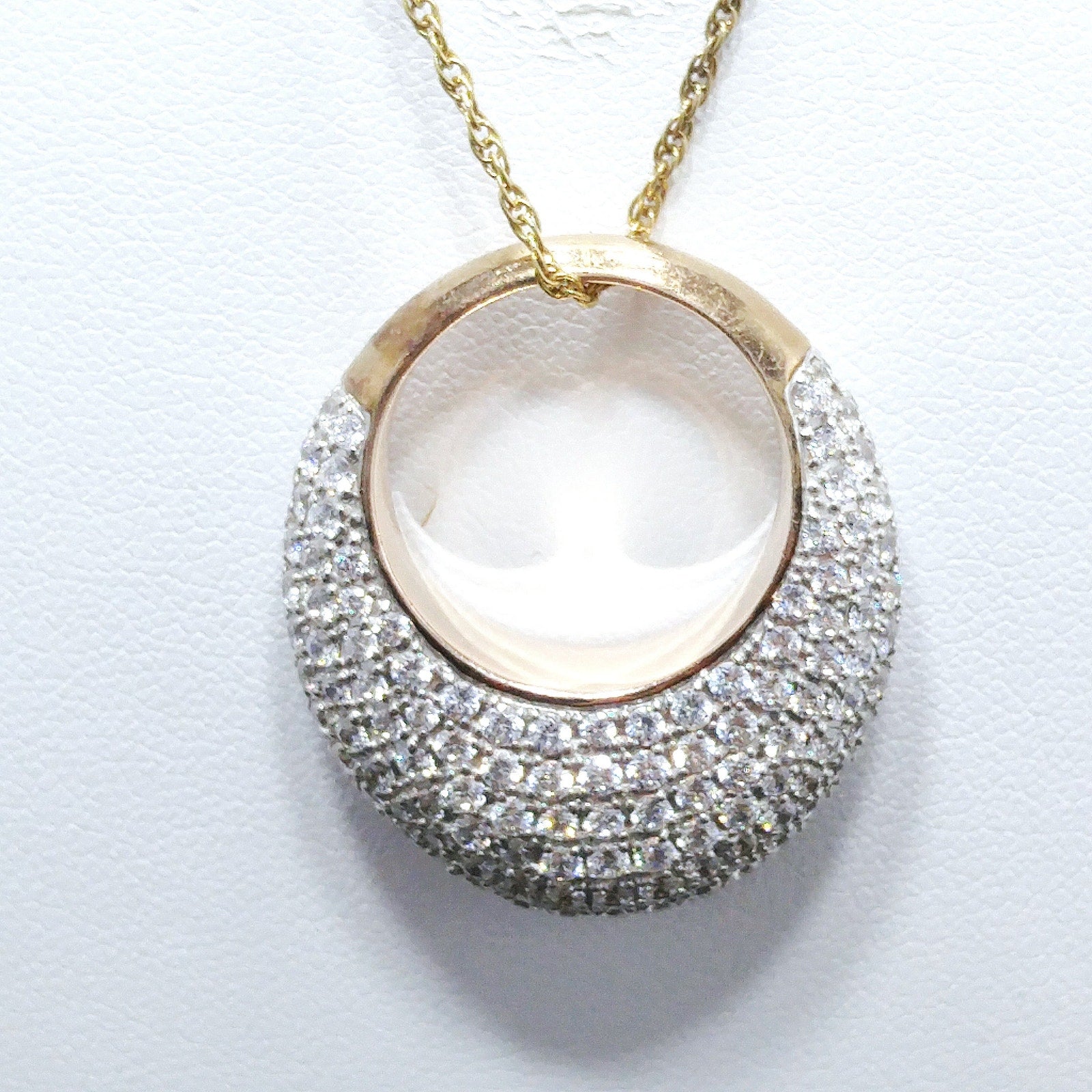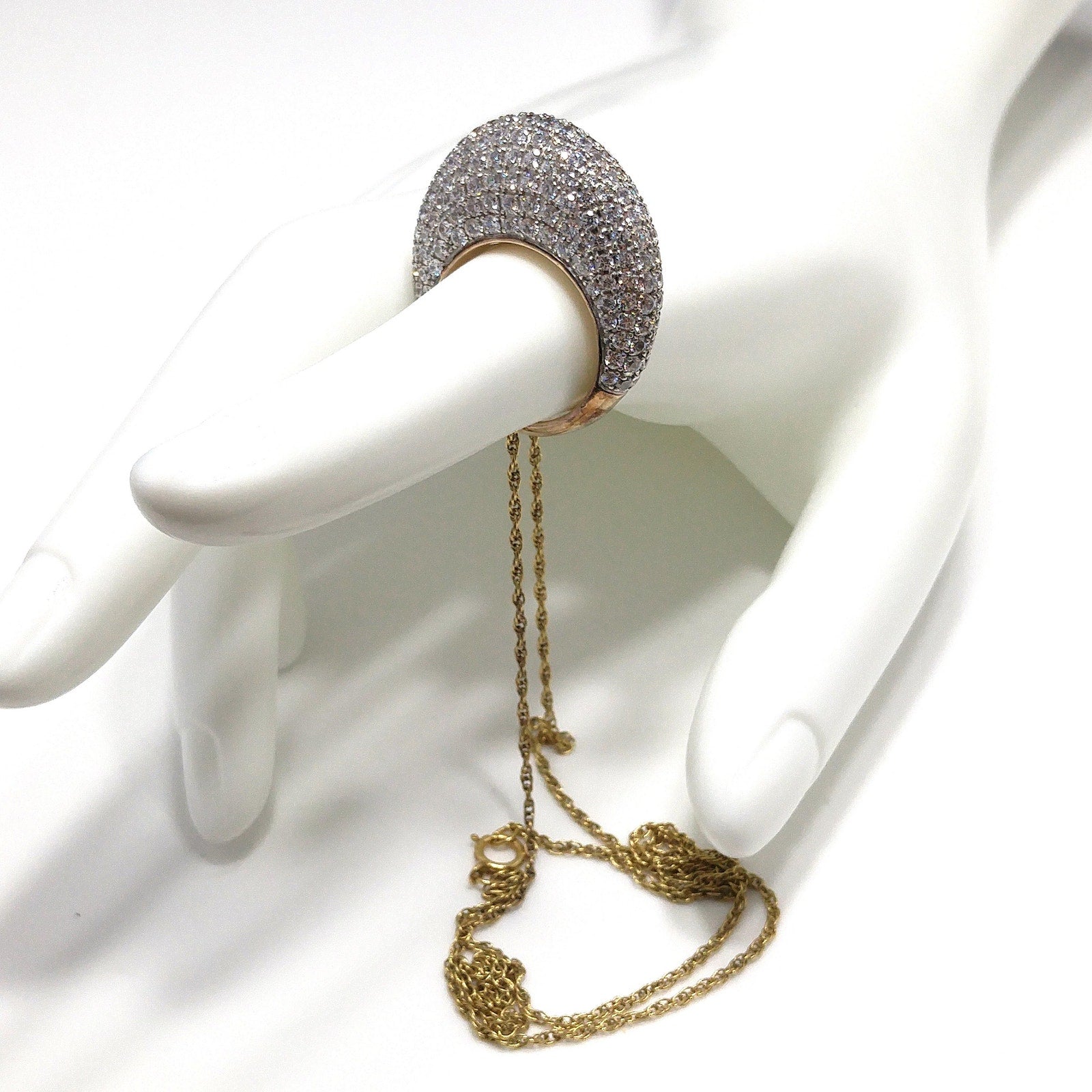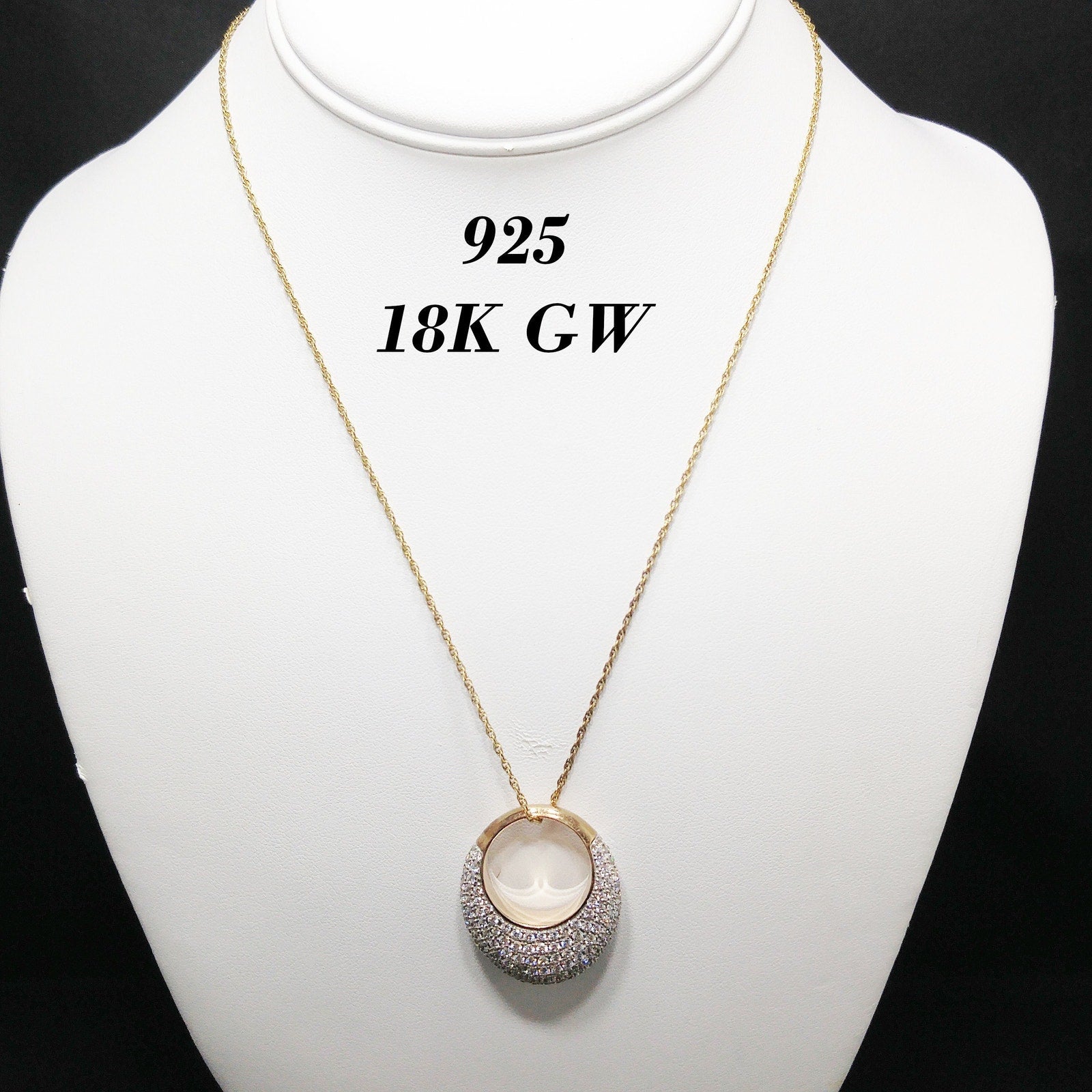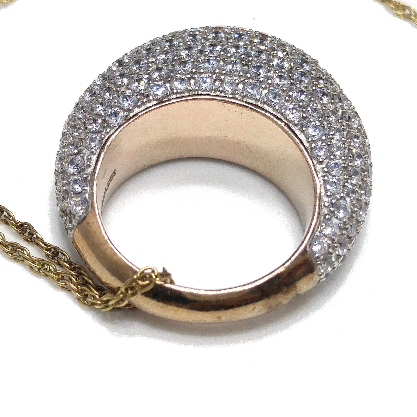 *Description: This is a beautiful oval clear rhinestone pendant necklace which is stamped 925 and 18KGW from the 1990s or before. The vermeil over sterling is covered with clear pave rhinestones which sparkle like CZs. The pendant reminds me of a ring so I took the inside measurements and it measured US Size 6 3/4 as I believe the pendant could also be worn as a domed ring. The rope chain is also marked at 925 and additional markings which are too worn for me to read. This is a beautiful pendant necklace which would be a great addition to your vintage jewelry collection or make a great vintage gift!