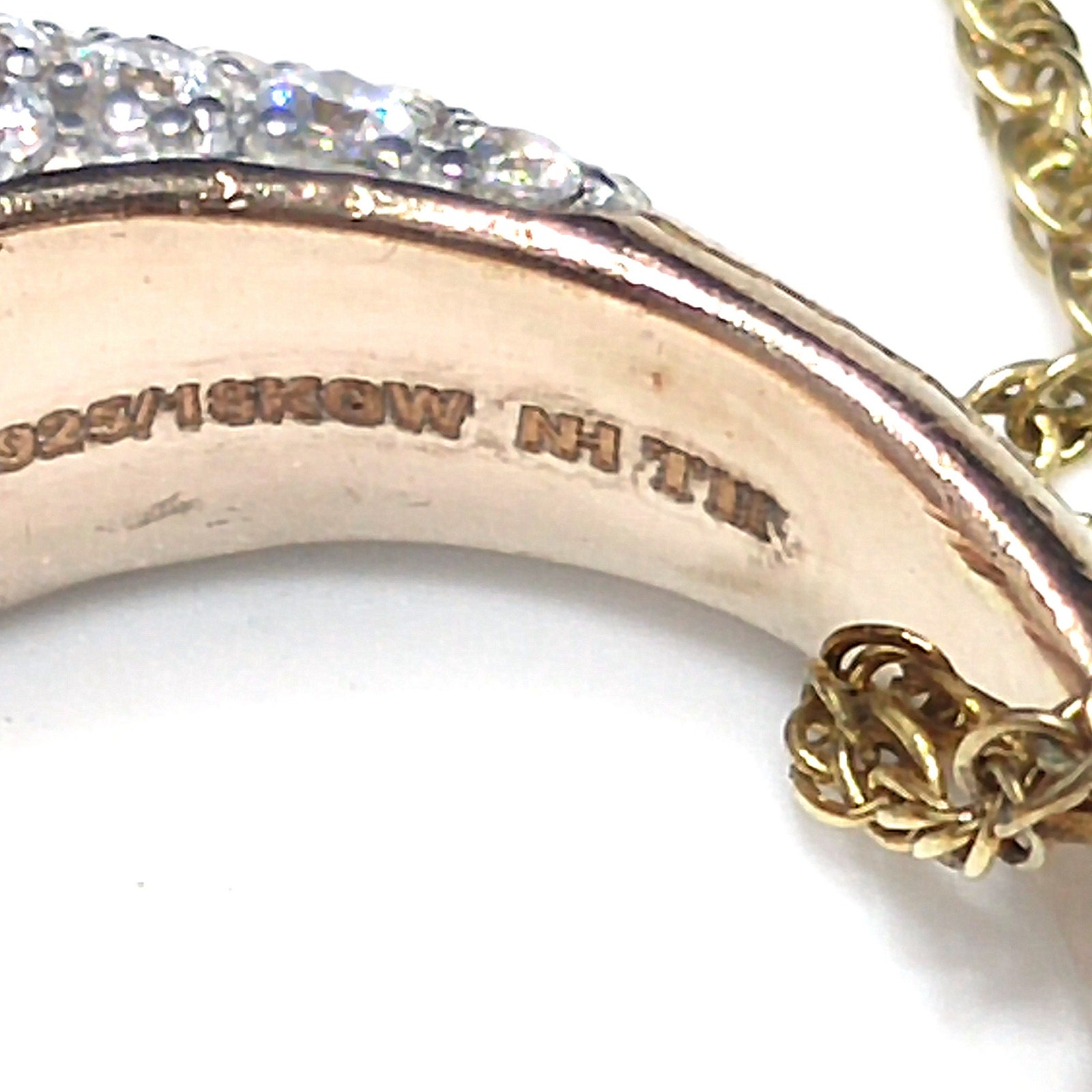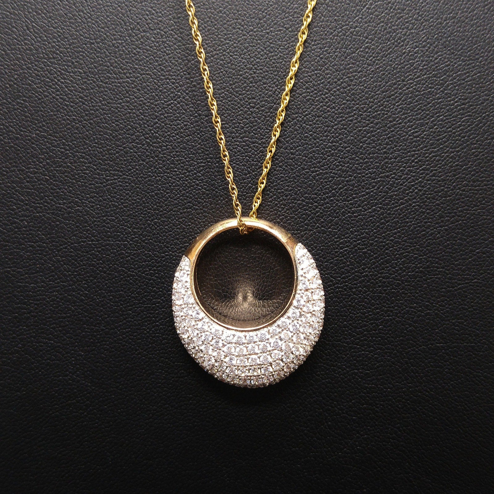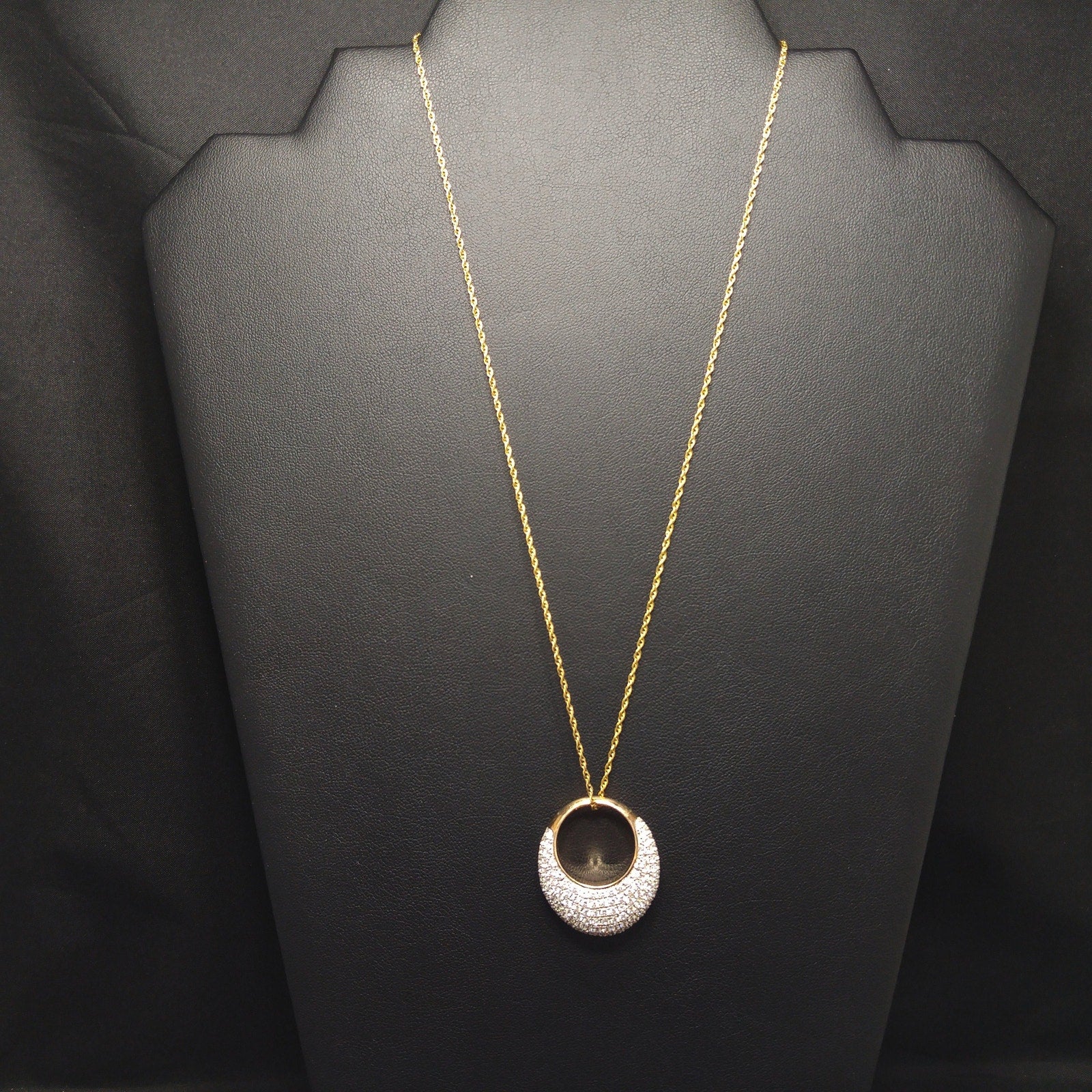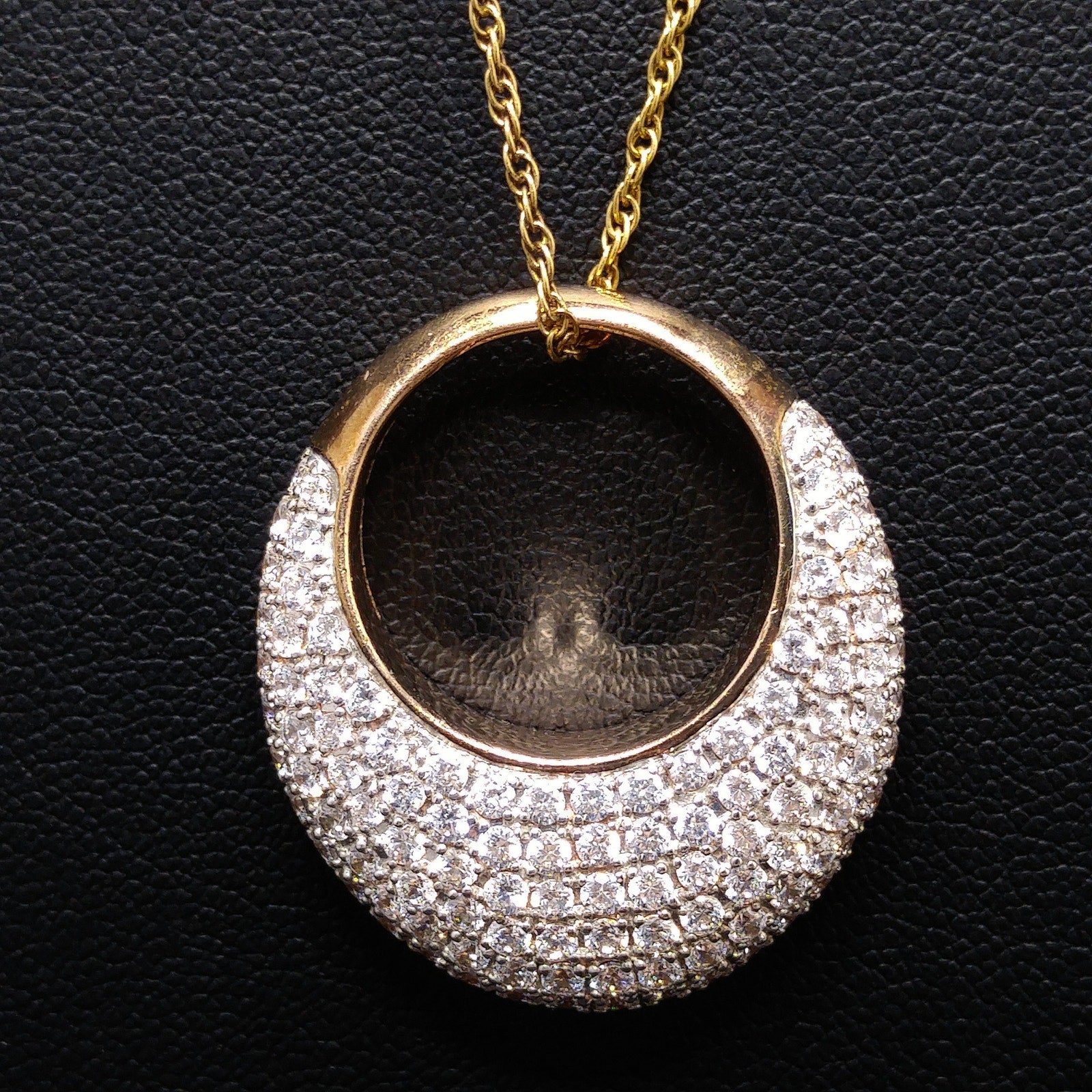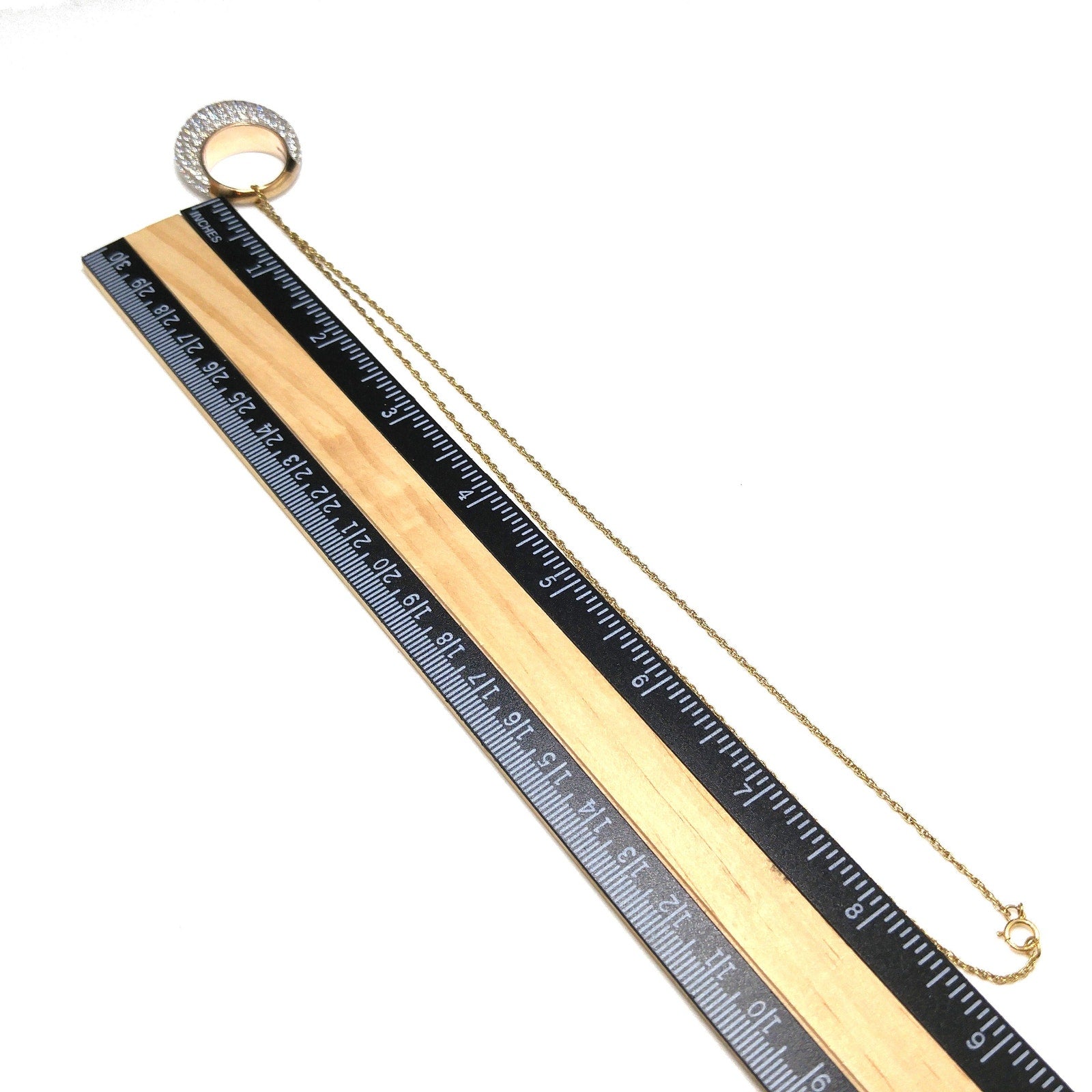 *Description: This is a beautiful oval clear rhinestone pendant necklace which is stamped 925 and 18KGW from the 1990s or before. The vermeil over sterling is covered with clear pave rhinestones which sparkle like CZs. The pendant reminds me of a ring so I took the inside measurements and it measured US Size 6 3/4 as I believe the pendant could also be worn as a domed ring. The rope chain is also marked at 925 and additional markings which are too worn for me to read. This is a beautiful pendant necklace which would be a great addition to your vintage jewelry collection or make a great vintage gift!