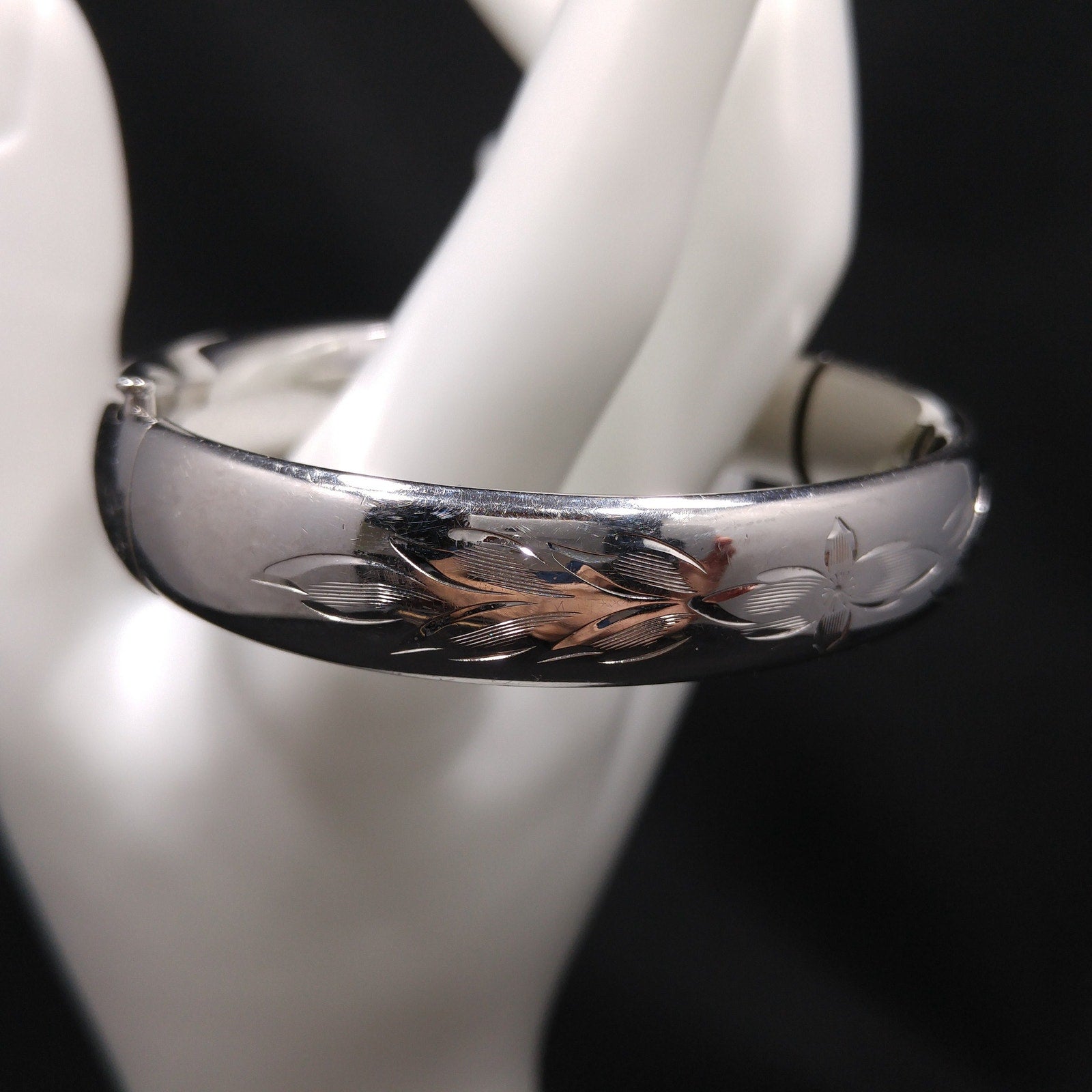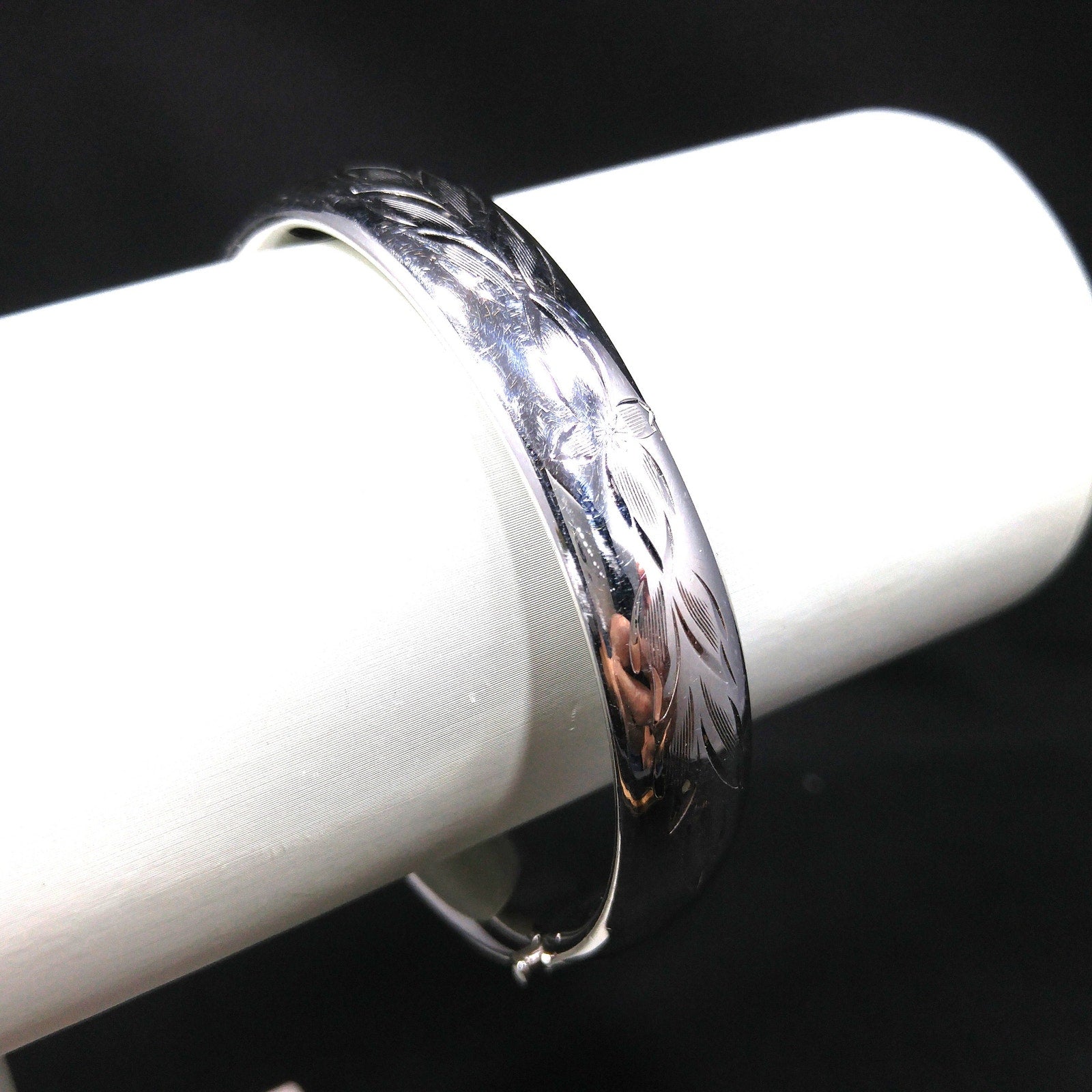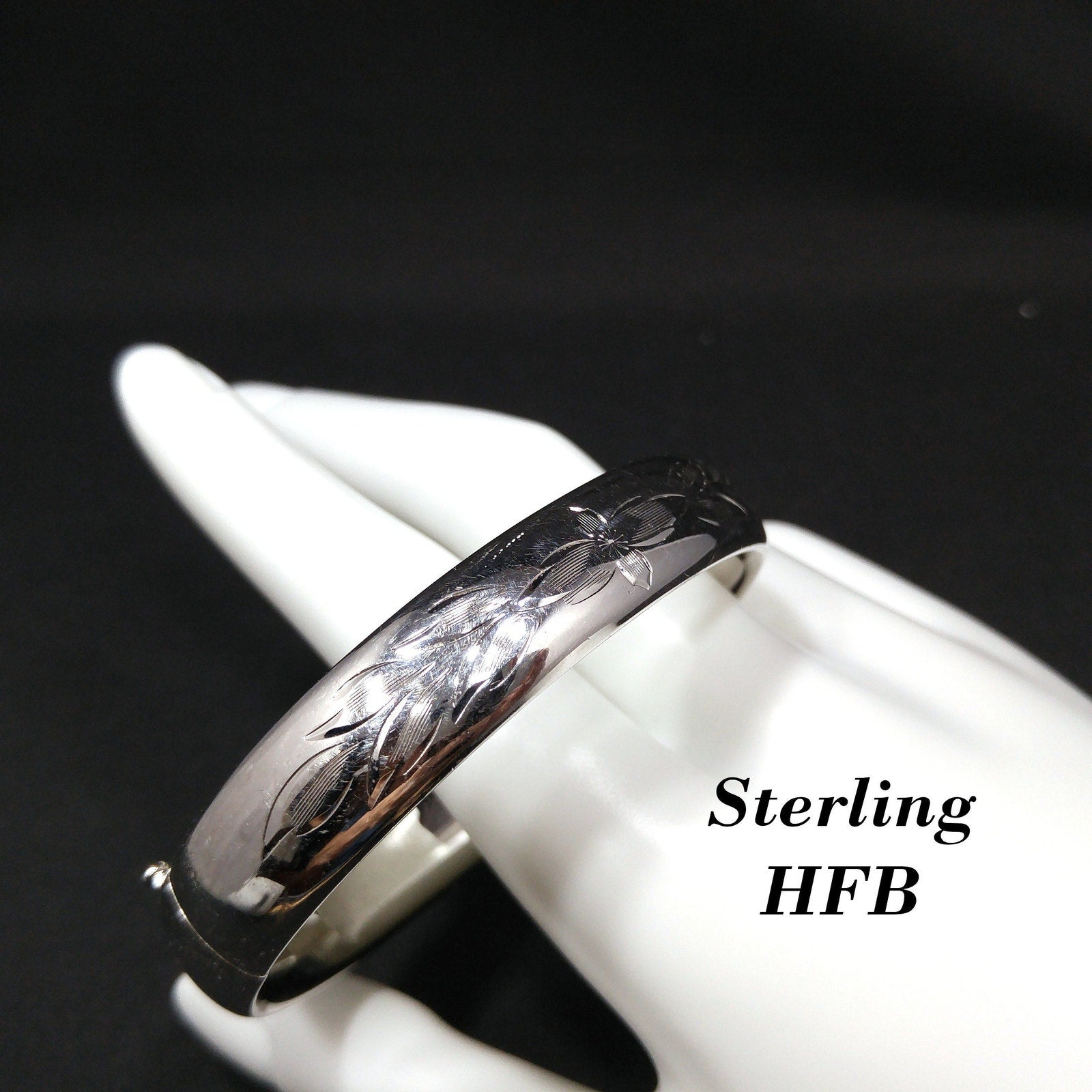 *Description: This is a beautiful HFB sterling silver hinged bracelet from the 1940s. The bracelet is etched in a floral design on the front. There is a long thin piece of metal that holds the bracelet together as it is opened and closed. On this piece of metal is where the bracelet is signed HFB and STERLING. When the bracelet is opened, there is almost a spring like feeling in that it closes partially on its own. I noticed when photographing that there is a little space at the hinged area when closed. Please see photos for details. It is more noticeable when the photos are magnified but not with the naked eye. This bracelet is in amazing condition. This would be a great addition to your vintage jewelry collection or make a great vintage gift!