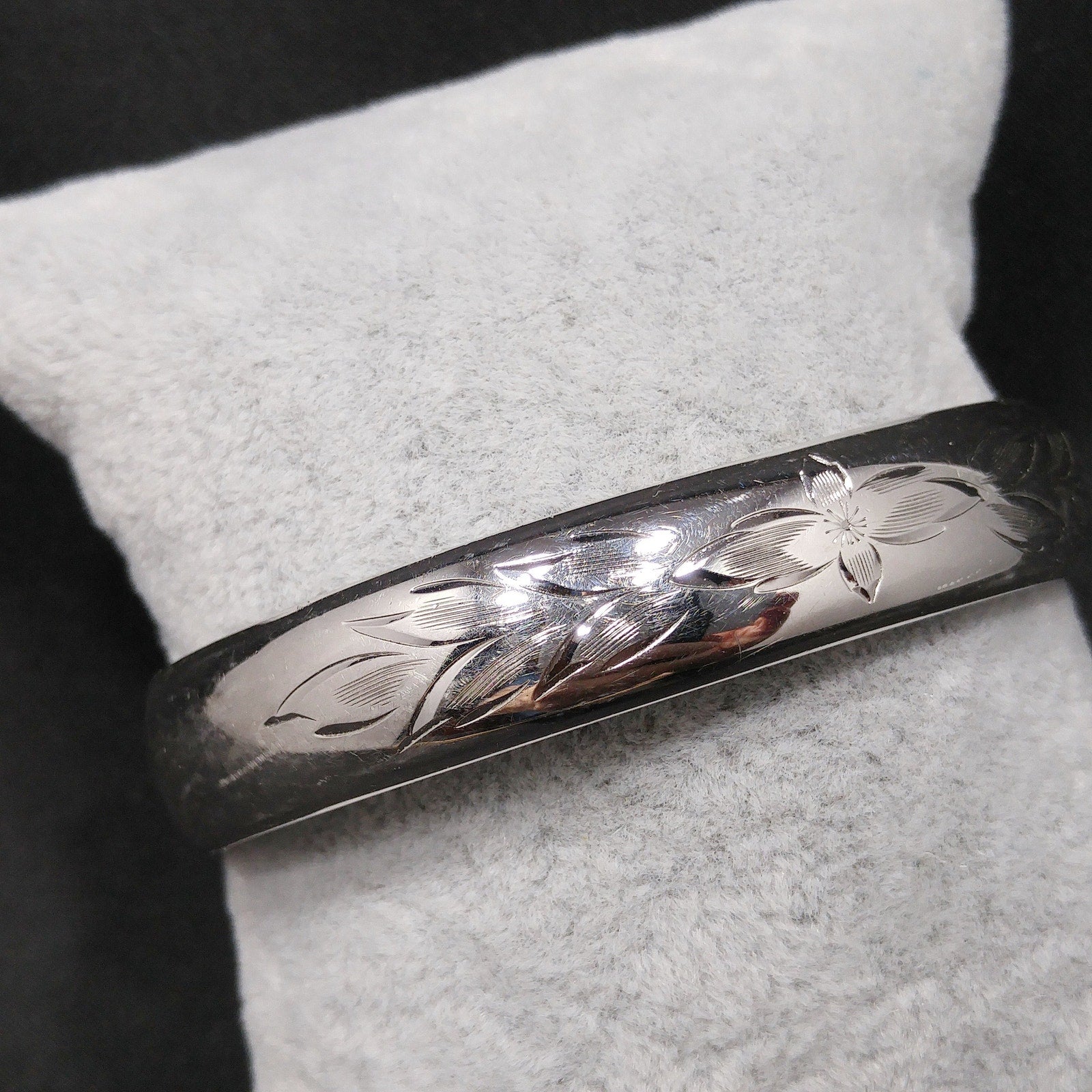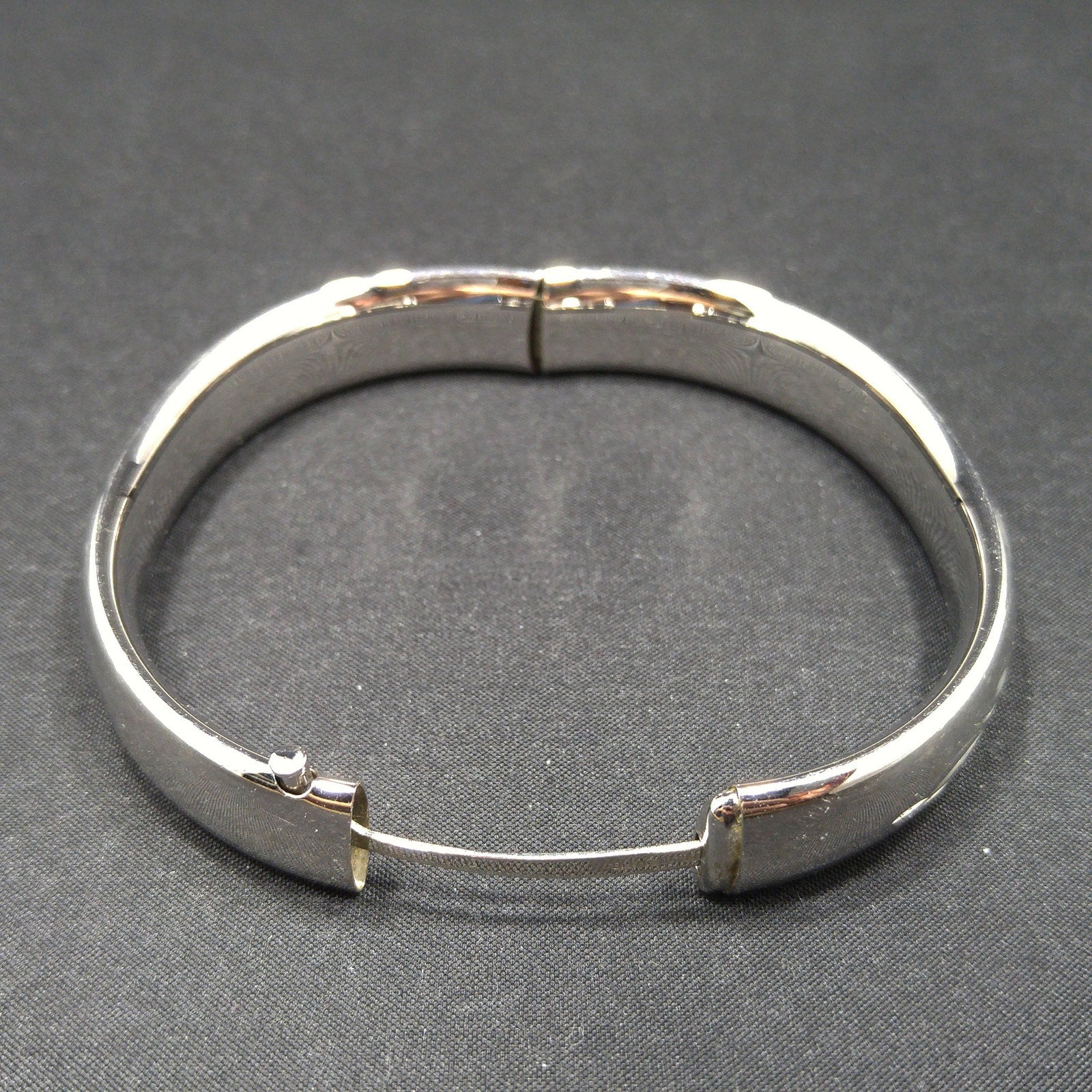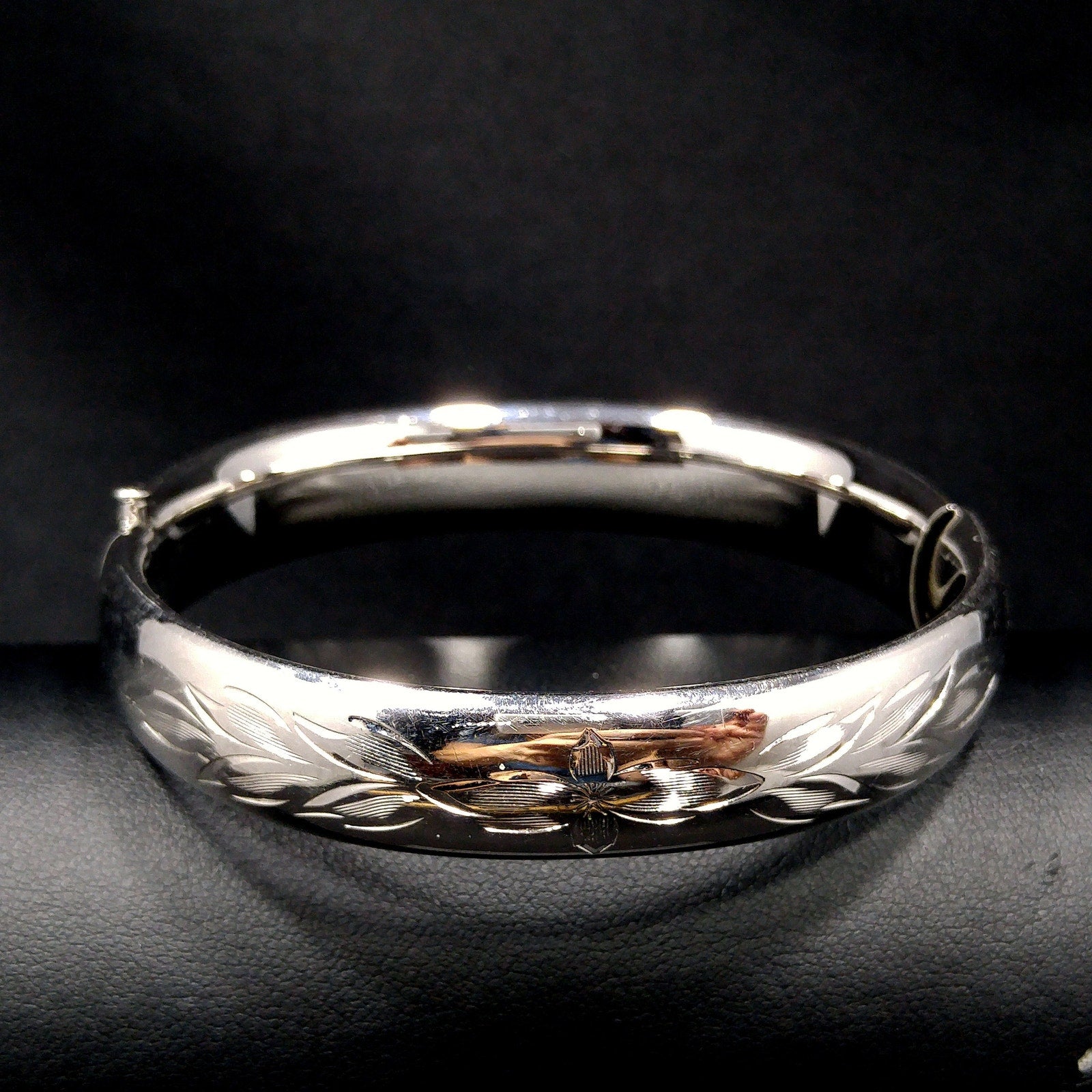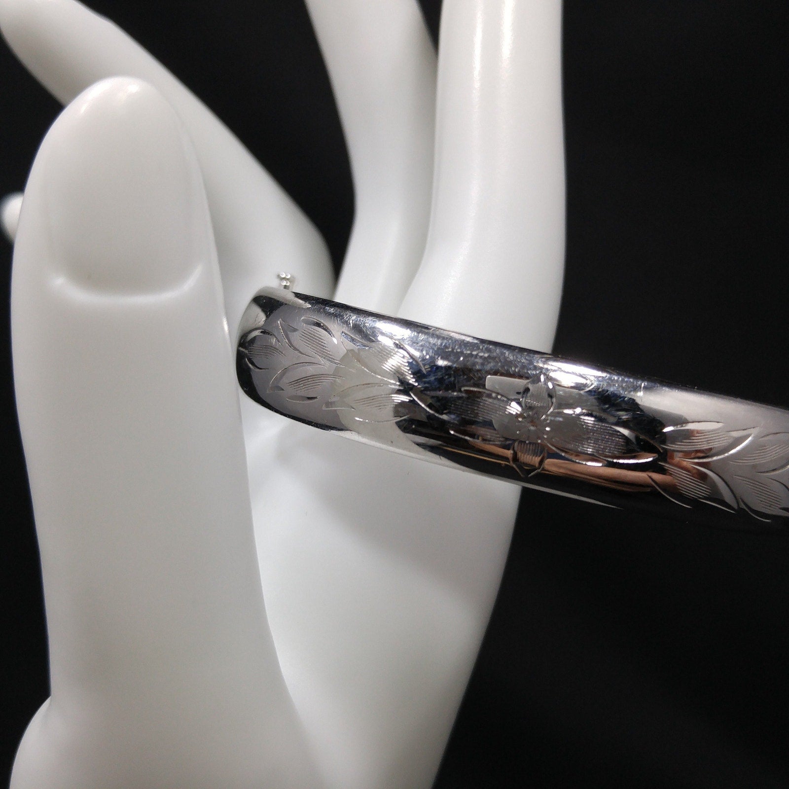 *Description: This is a beautiful HFB sterling silver hinged bracelet from the 1940s. The bracelet is etched in a floral design on the front. There is a long thin piece of metal that holds the bracelet together as it is opened and closed. On this piece of metal is where the bracelet is signed HFB and STERLING. When the bracelet is opened, there is almost a spring like feeling in that it closes partially on its own. I noticed when photographing that there is a little space at the hinged area when closed. Please see photos for details. It is more noticeable when the photos are magnified but not with the naked eye. This bracelet is in amazing condition. This would be a great addition to your vintage jewelry collection or make a great vintage gift!