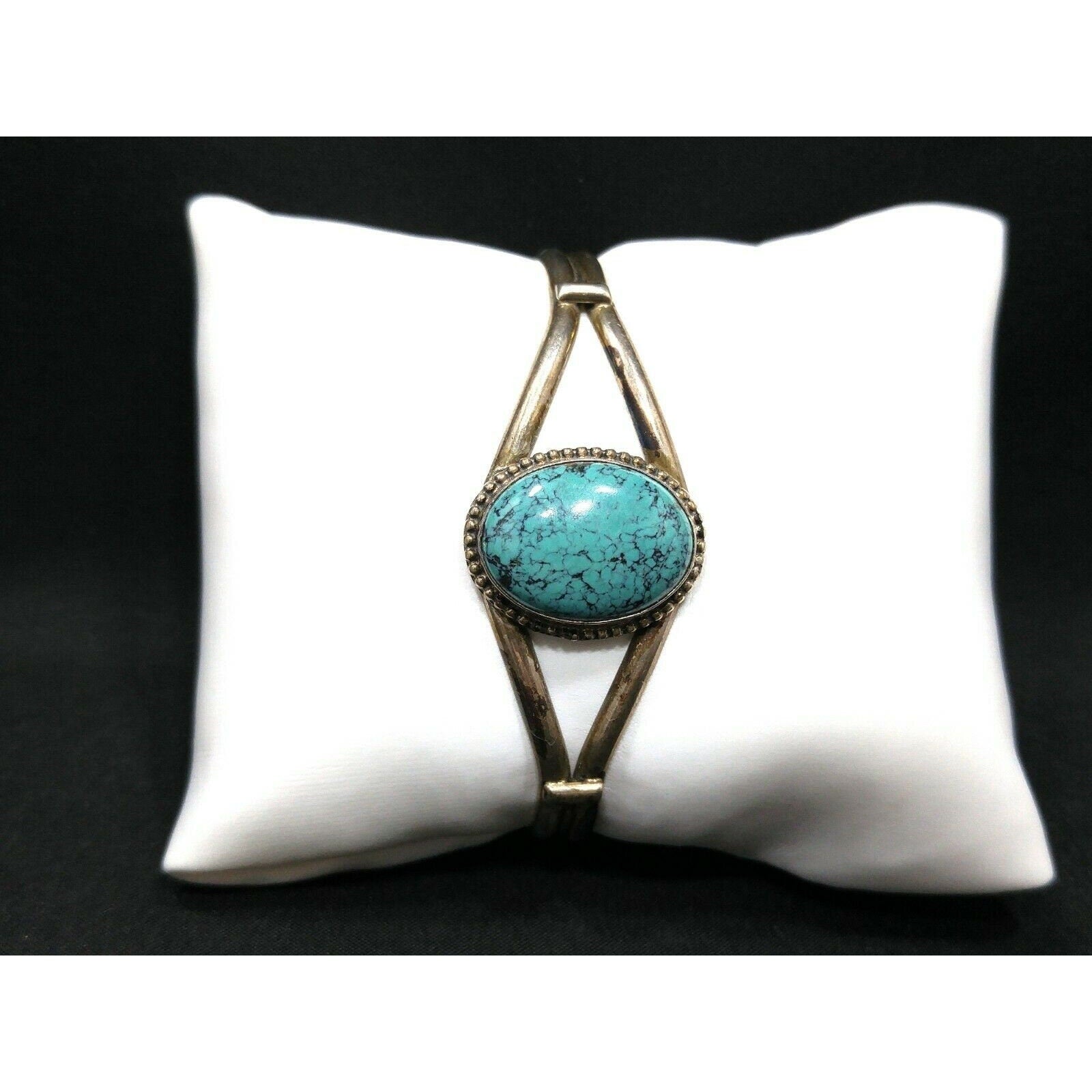 *Description: This is a great sterling silver turquoise cabochon "Sterling B" cuff bracelet from the 1970s. The B on the signature has a slight shadow trailing from the letter. The sterling has patina and has not been polished. It is a great cuff bracelet! This would be a great addition to your vintage jewelry collection or make a great vintage gift!