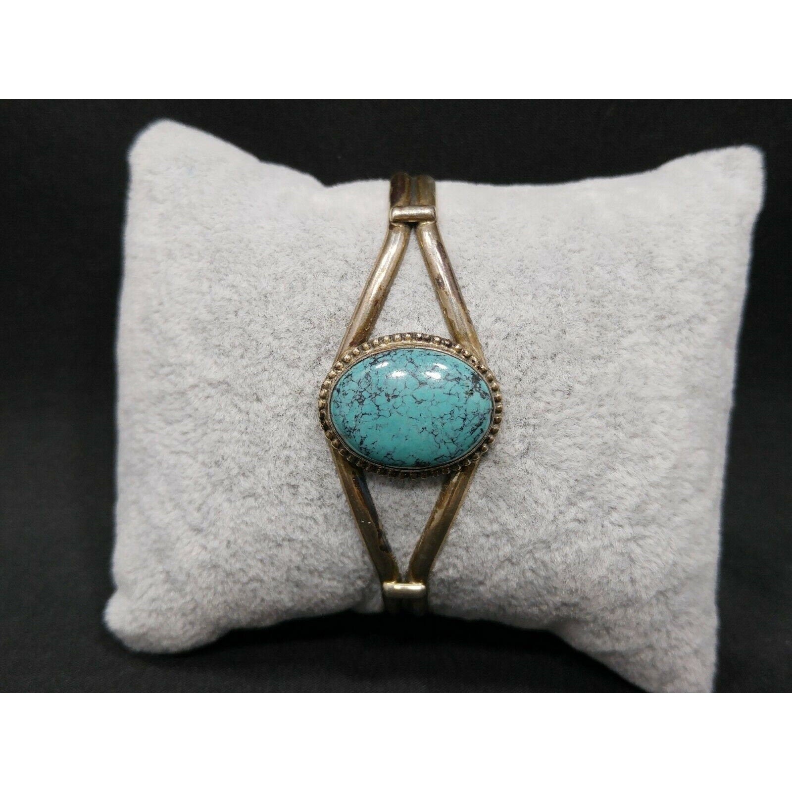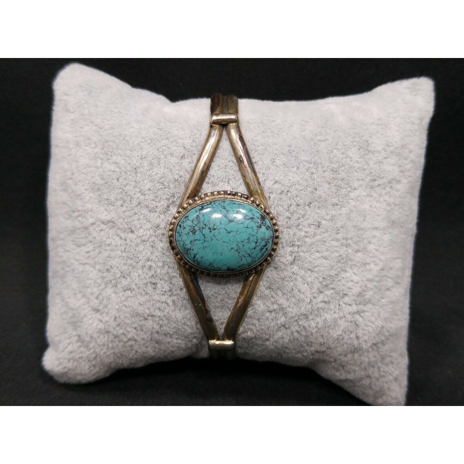 *Approximate Measurements: Length inside tip to tip - 5 1/4 Inches, Width at Widest Point - 1 Inch, Oval Turquoise Cabochon - 20mm x 14mm