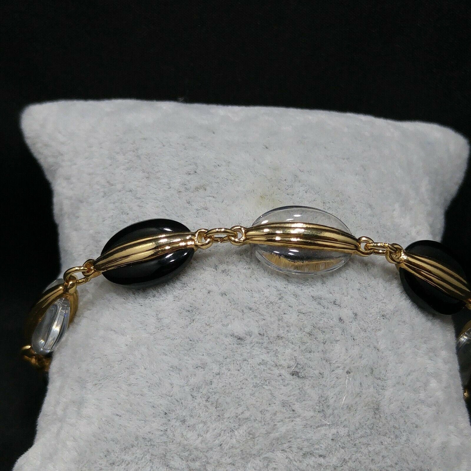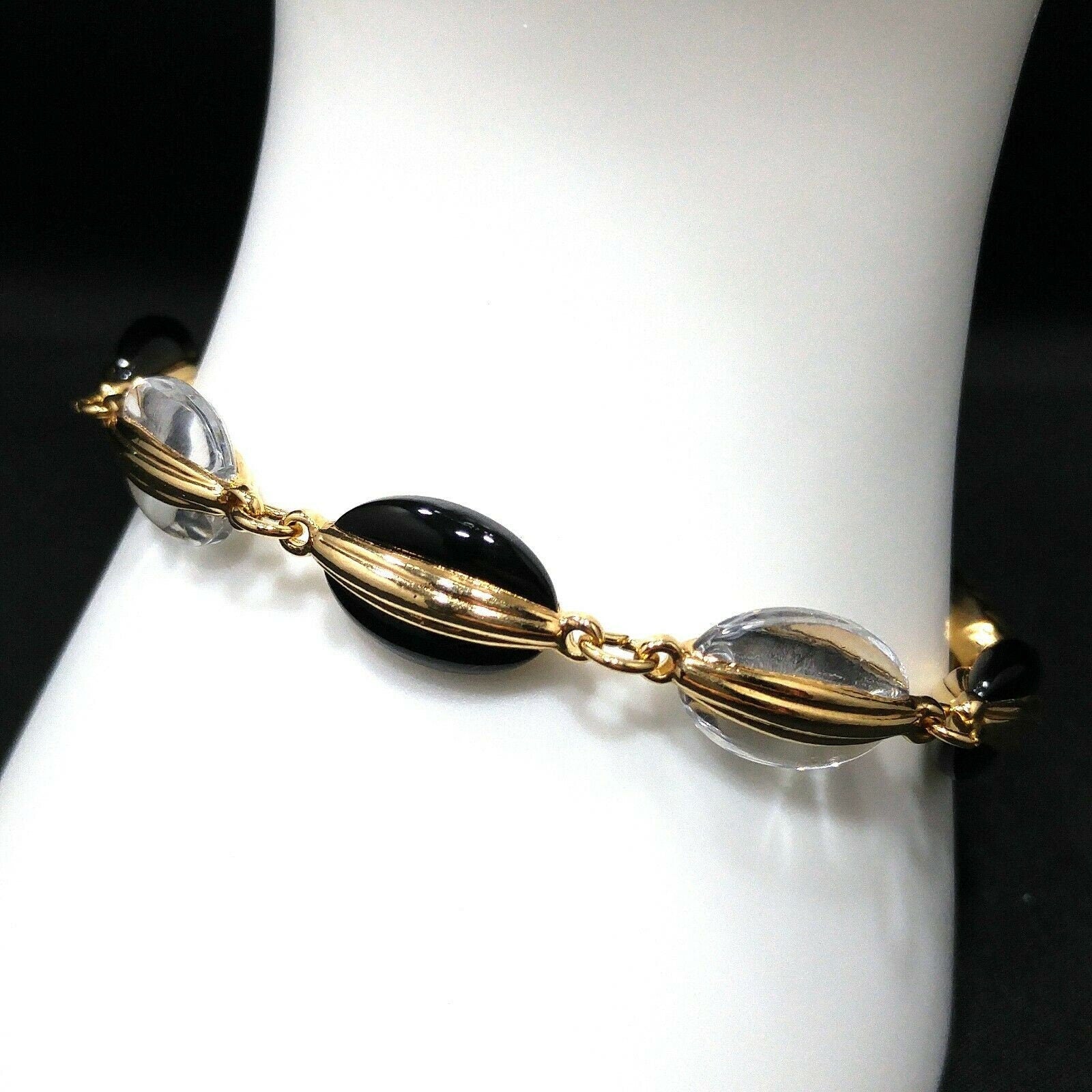 *Description: This is a beautiful Swarovski black and clear crystal beaded bracelet with a gold plated box clasp from the 1980s to 1990s. The bracelet is stamped with the swan logo and is 7 3/4 Inches in length. It is a classic style and colors to wear for years to come. This would be a great addition to your vintage jewelry collection or make a great vintage gift!