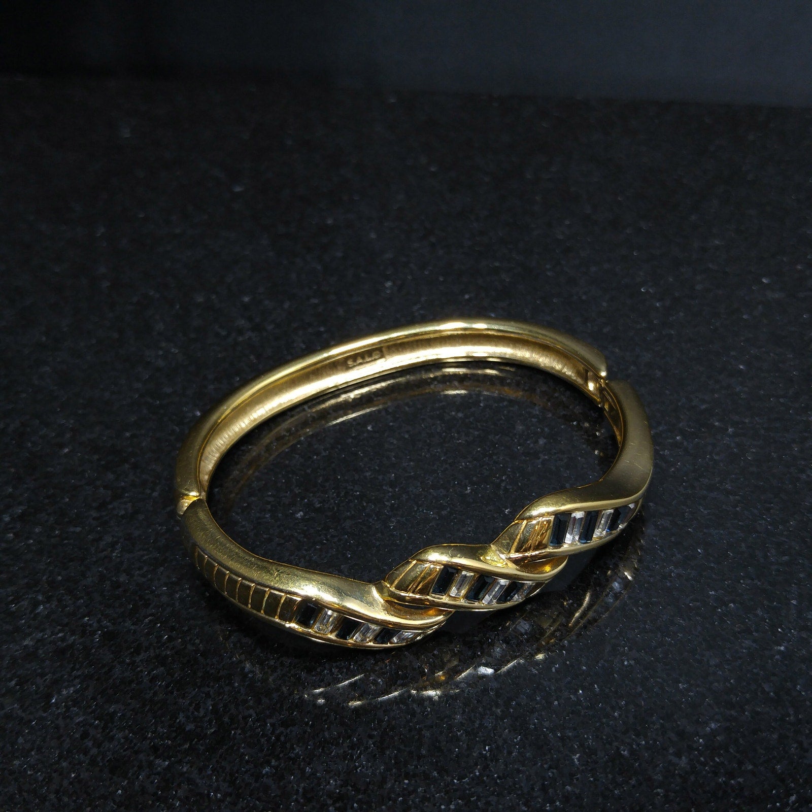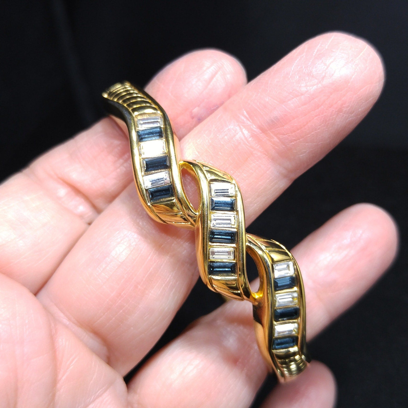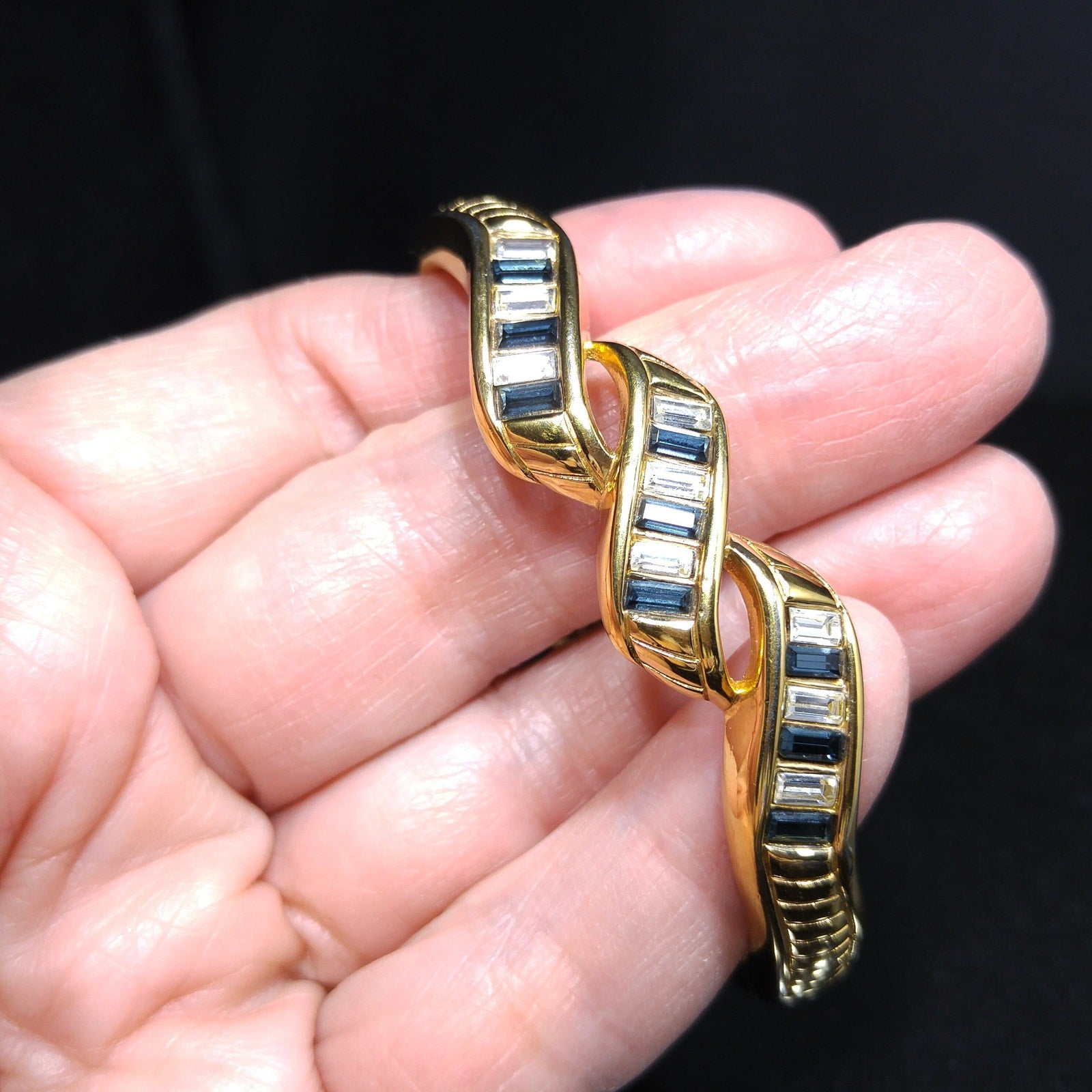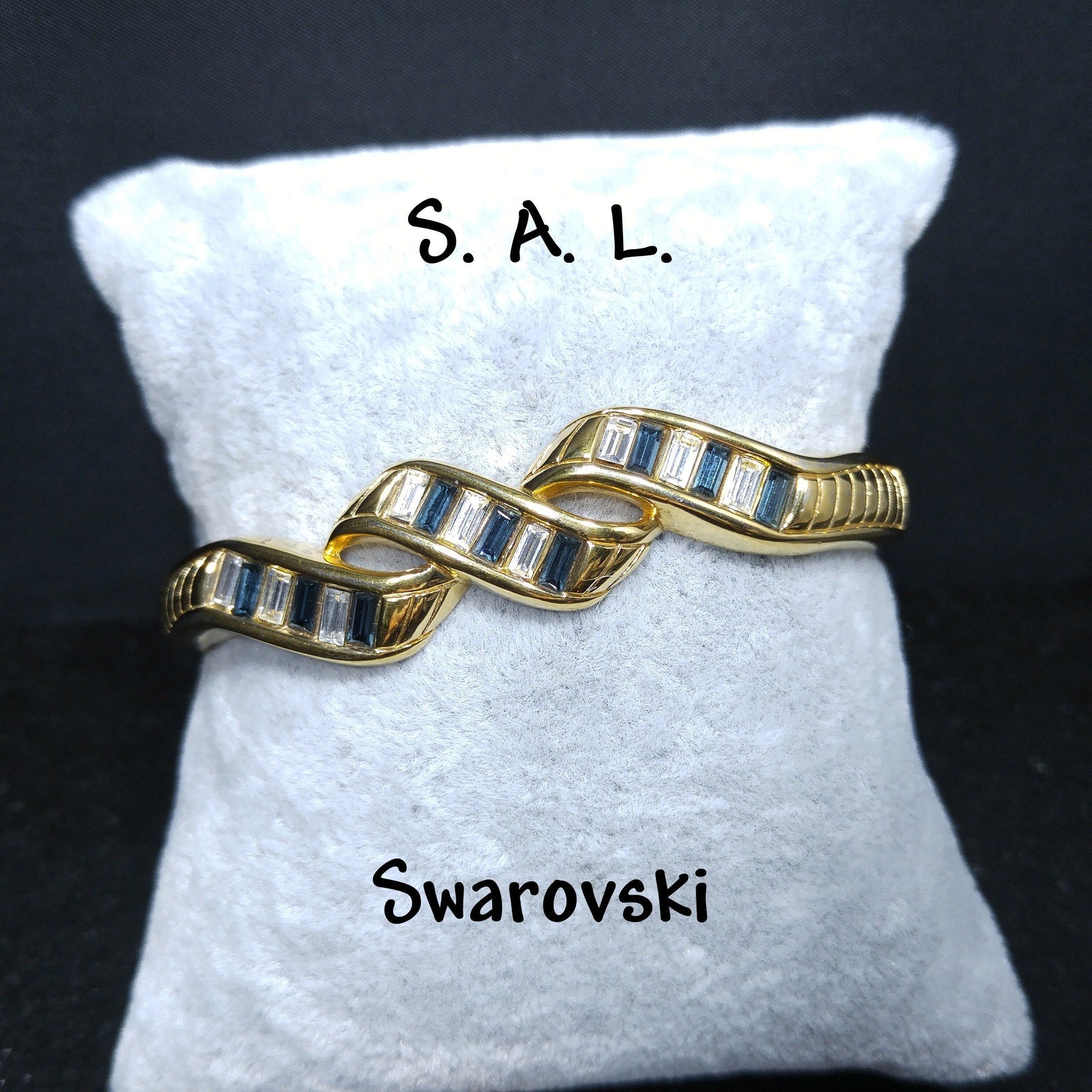 *Description: This is a beautiful Swarovski hinged bracelet with blue and clear baguette rhinestones in a gold plated bangle. This bracelet has an oval shape and is very comfortable on the arm. The inside is stamped with the older Swarovski label, S.A.L., which was used prior to 1988. This bracelet would make an excellent vintage gift or a wonderful addition to your vintage jewelry collection.