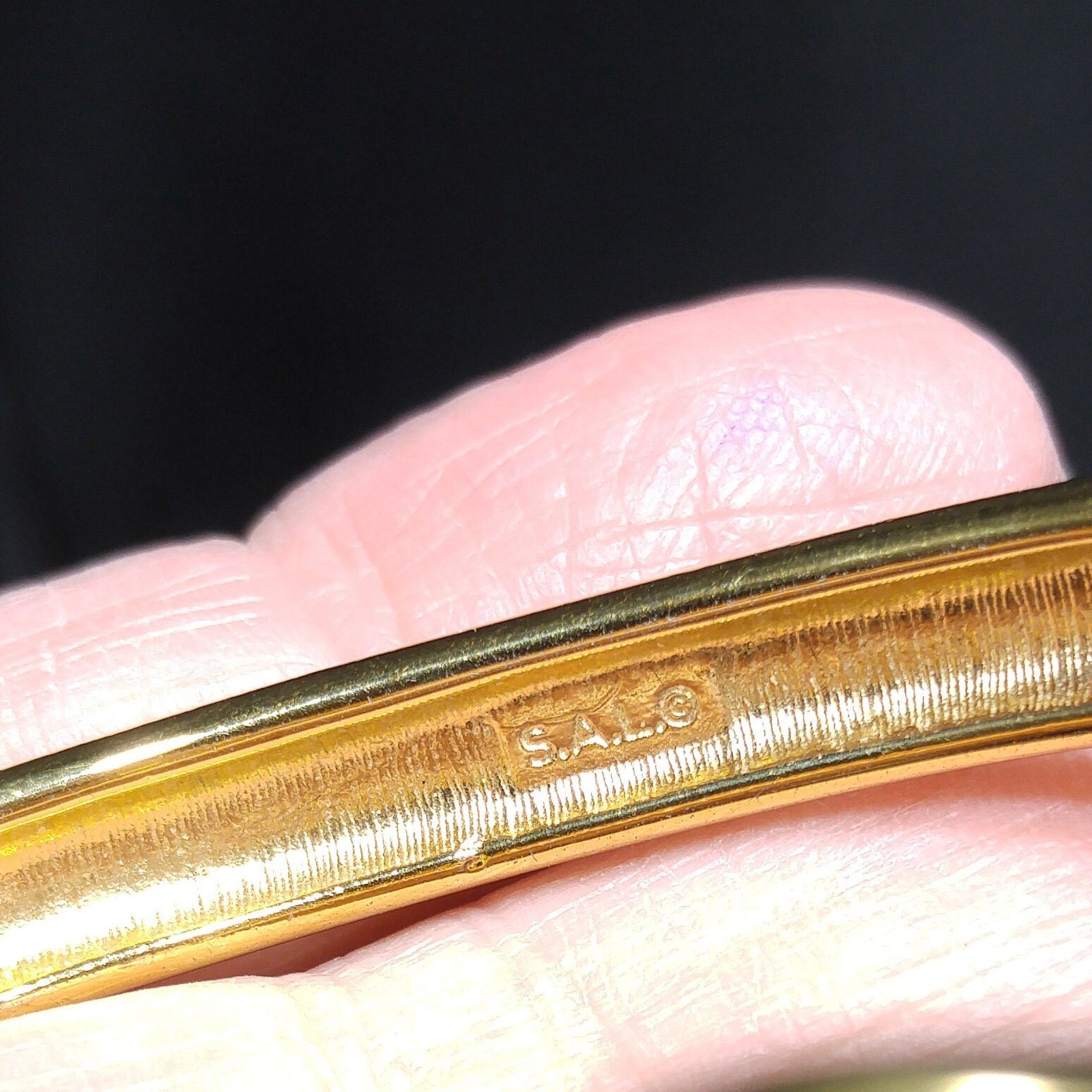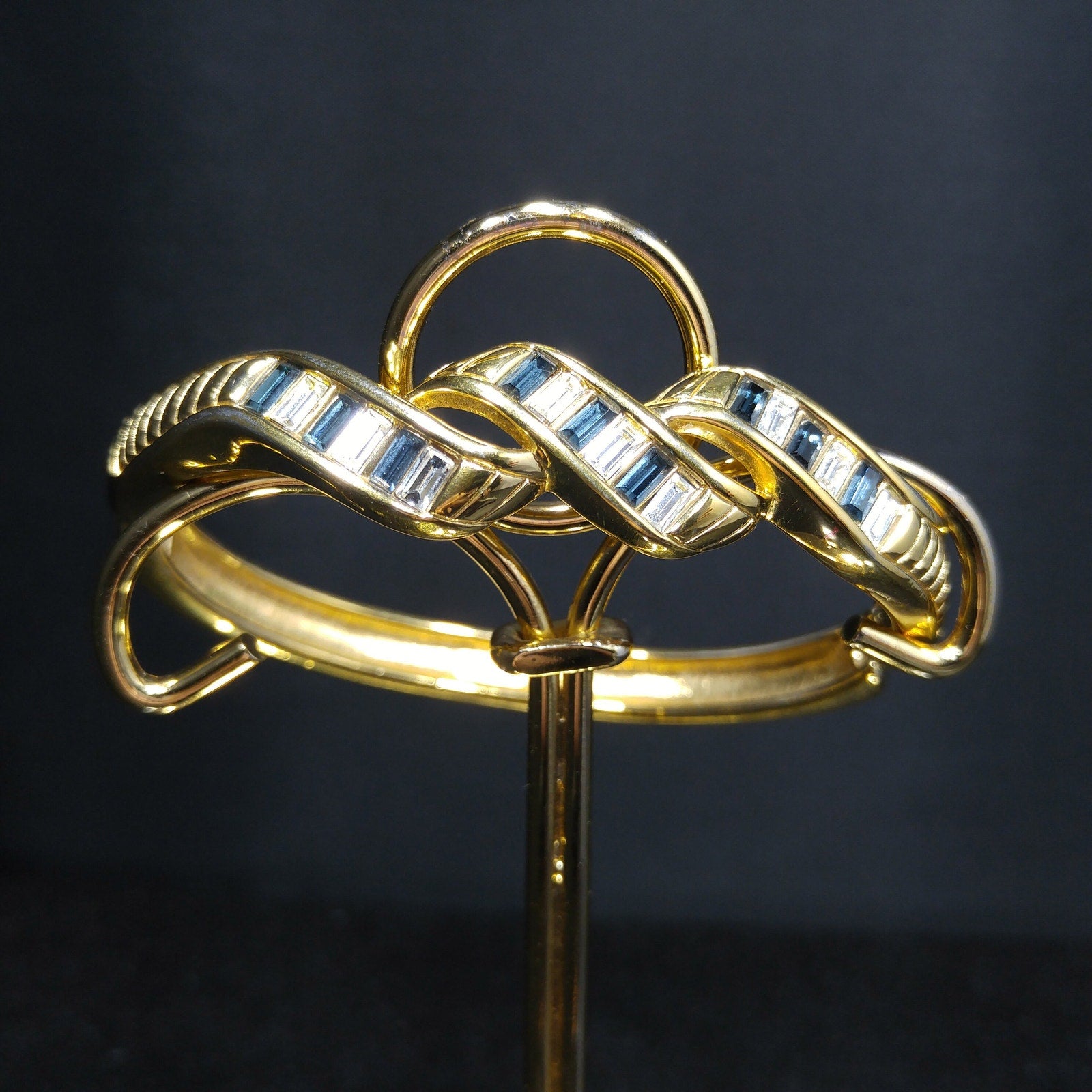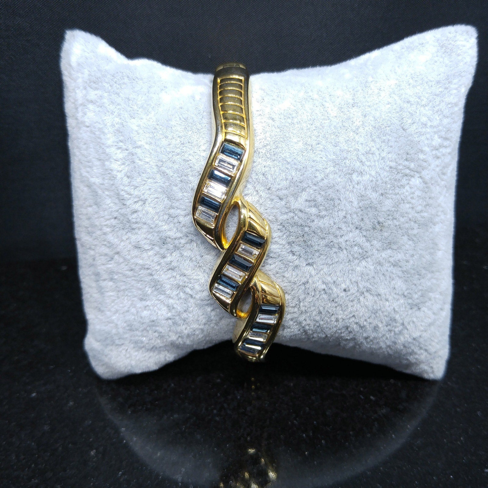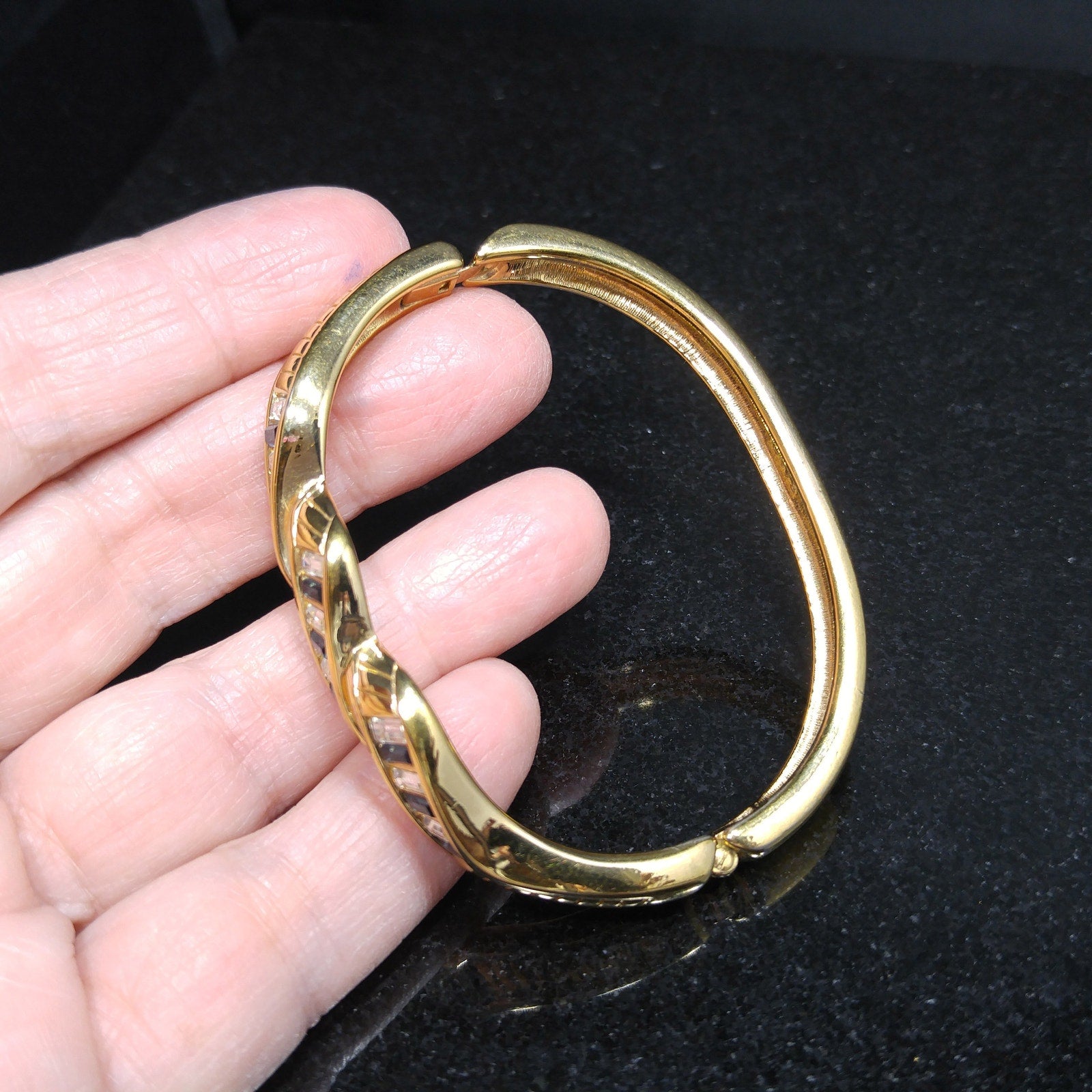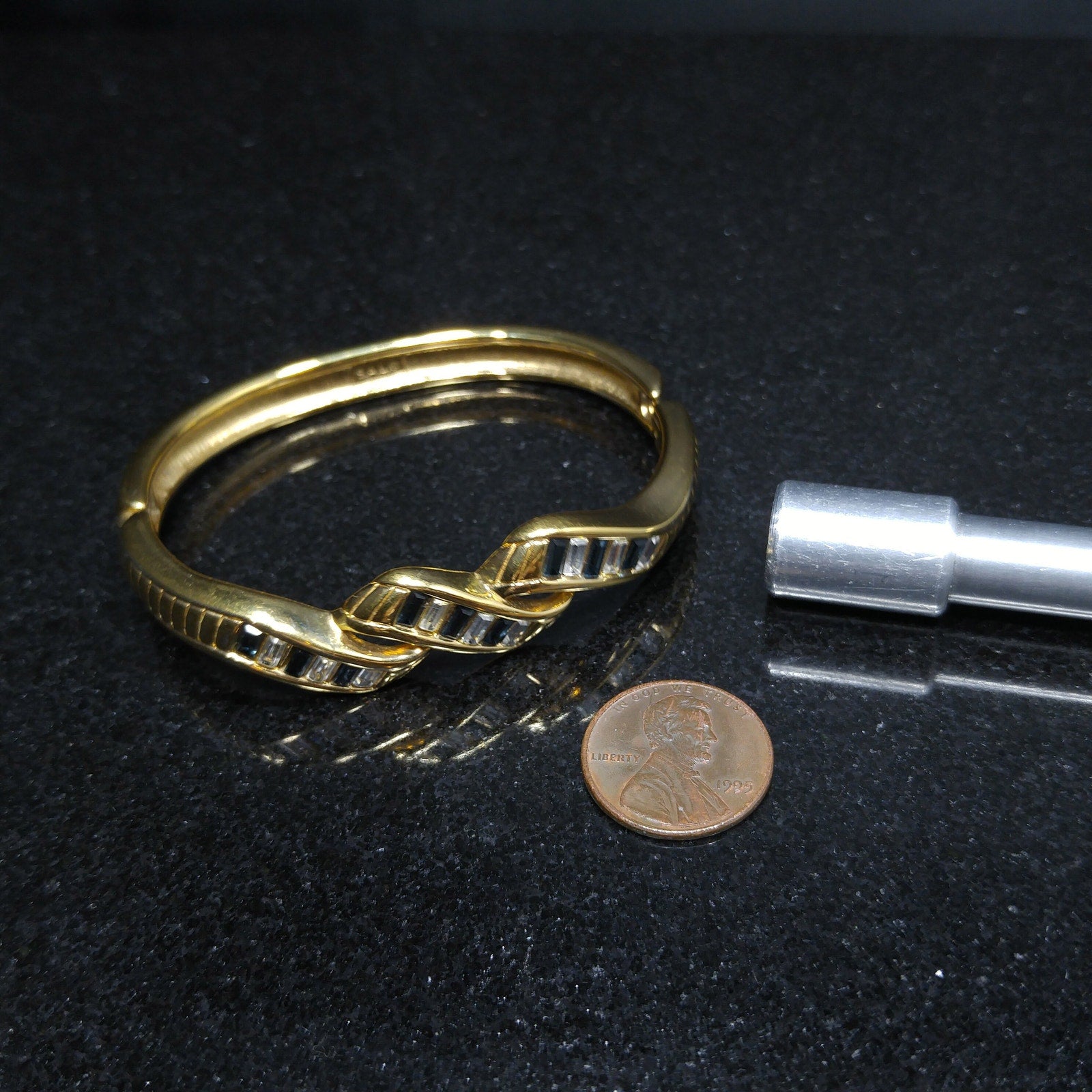 *Description: This is a beautiful Swarovski hinged bracelet with blue and clear baguette rhinestones in a gold plated bangle. This bracelet has an oval shape and is very comfortable on the arm. The inside is stamped with the older Swarovski label, S.A.L., which was used prior to 1988. This bracelet would make an excellent vintage gift or a wonderful addition to your vintage jewelry collection.
