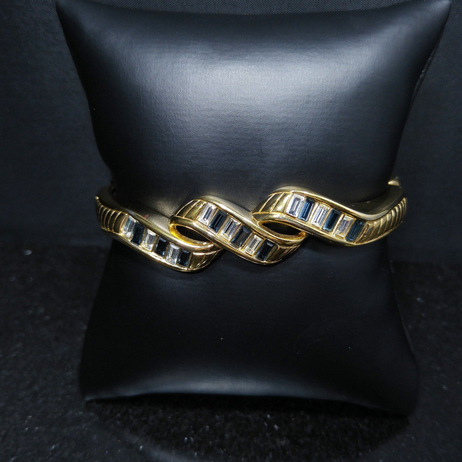 Swarovski Blue Rhinestone Hinged Bracelet, Gold Plated, 1970s Vintage Jewelry