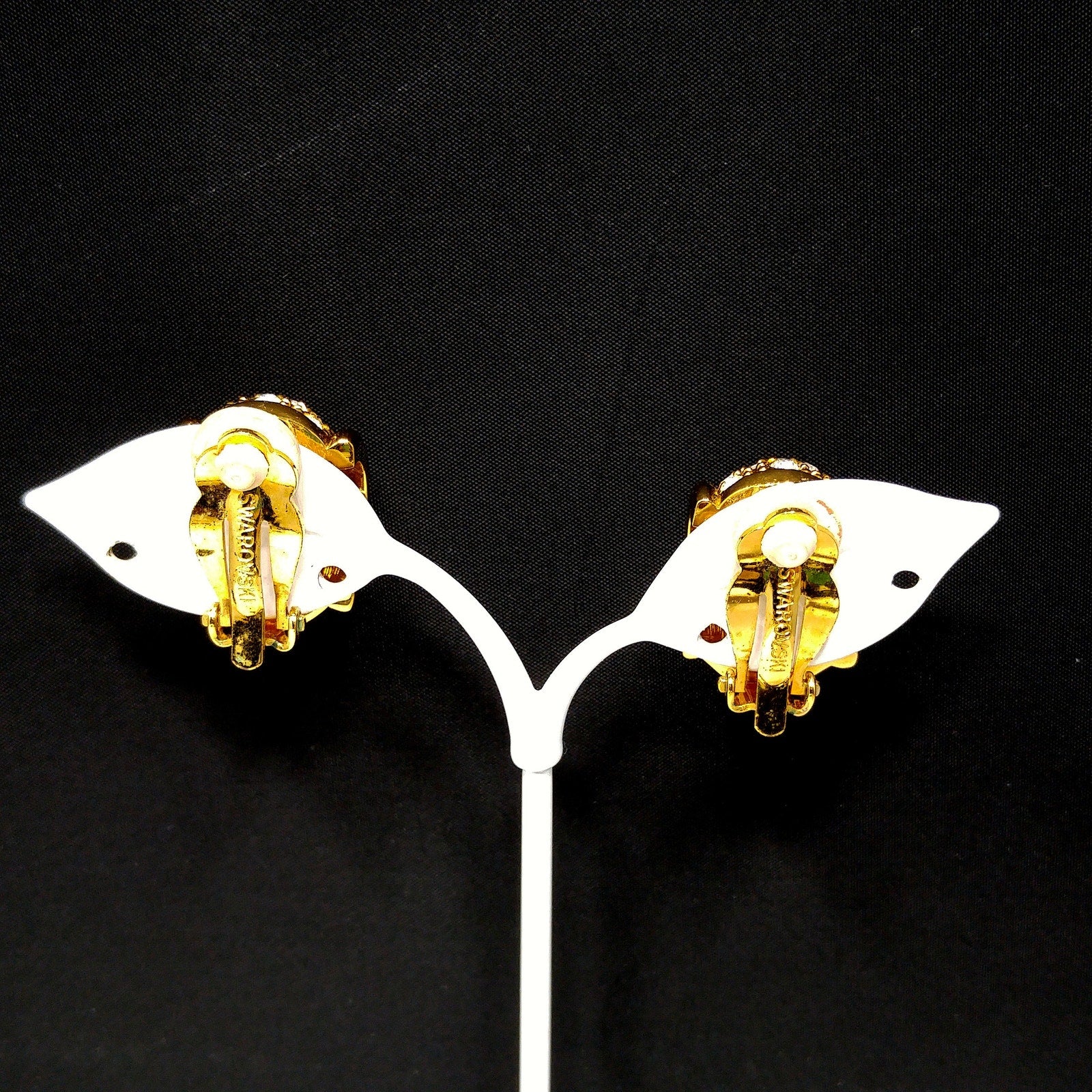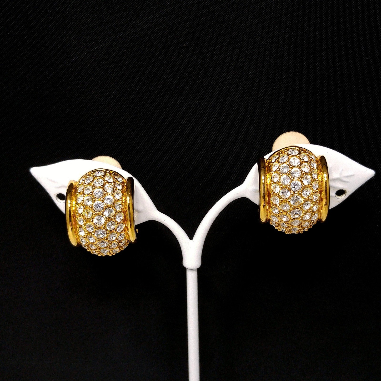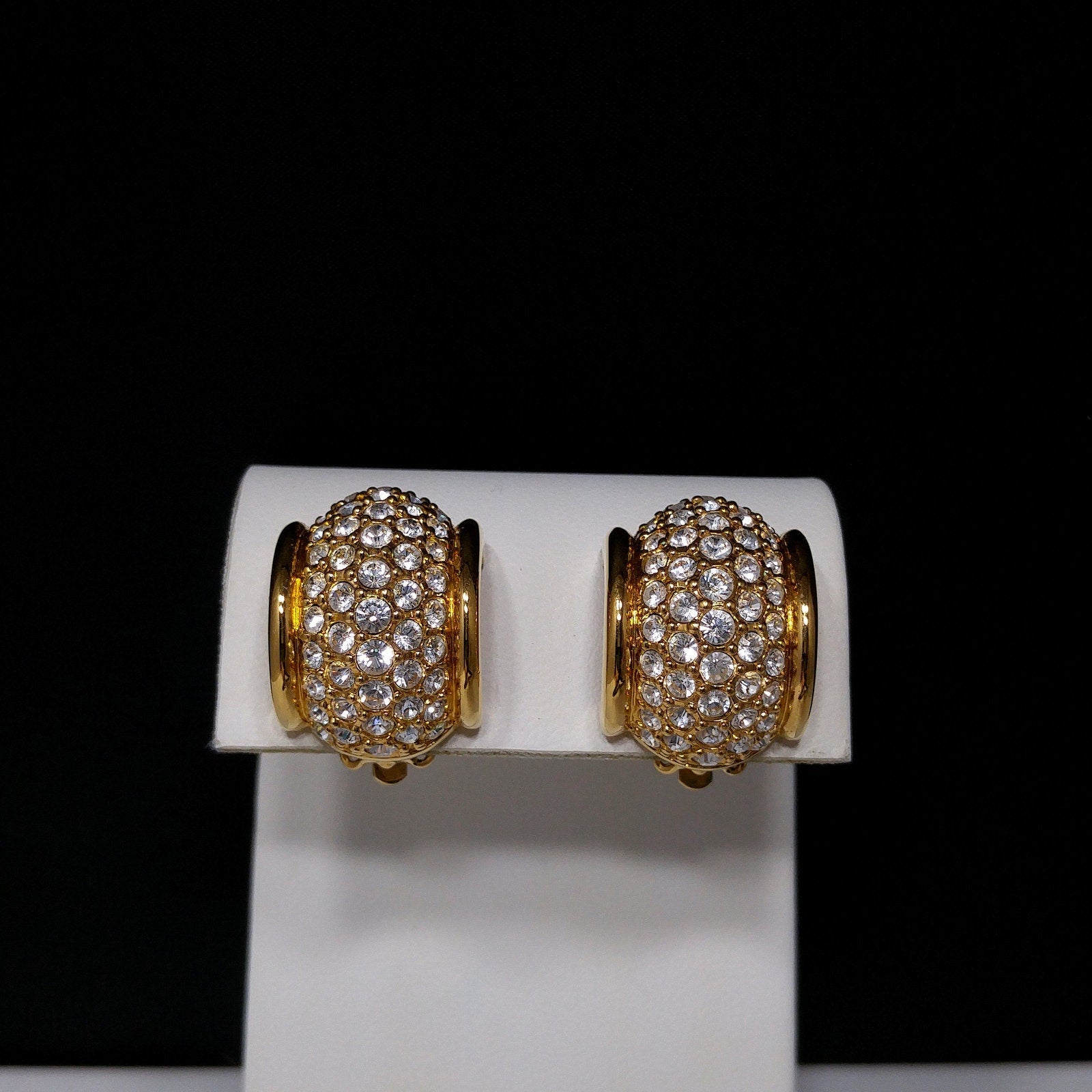 *Description: This is a beautiful pair of wide hoop rhinestone clip earrings from the 1990s. Each earring is gold plated and has gold rims on each side with clear pave rhinestones covering each hoop. The back of each earring has the swan logo and each clip is stamped Swarovski. This is a beautiful and classic pair of Swarovski earrings which would be a great addition to your vintage jewelry collection or make a great vintage gift!