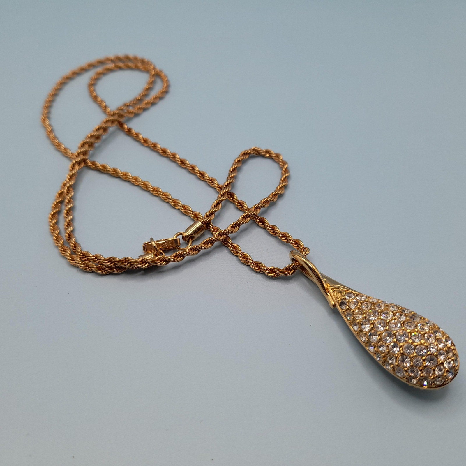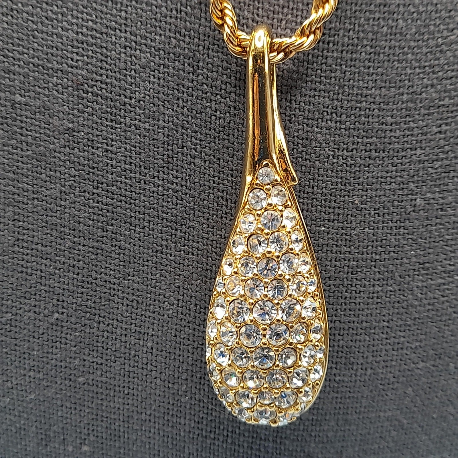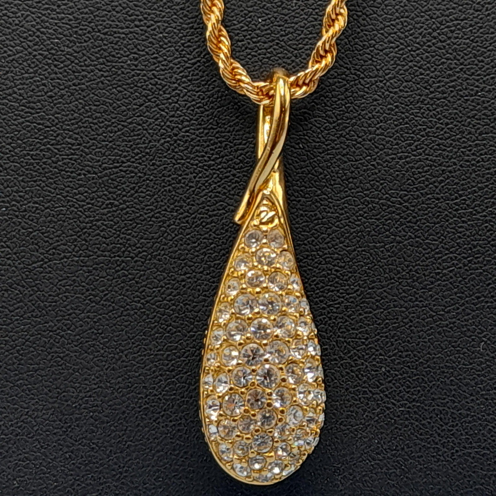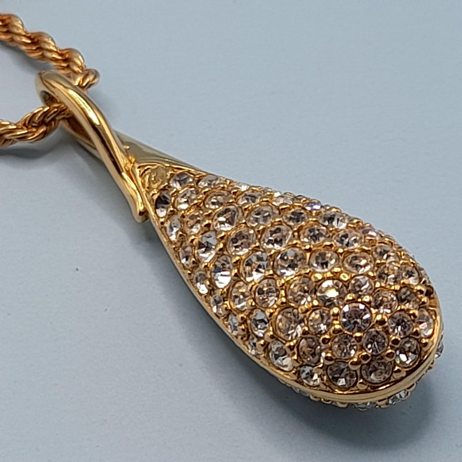 This striking vintage Swarovski necklace features a long 30-inch gold-plated rope chain with a brilliant teardrop pendant encrusted on both sides with clear Swarovski crystals. The pendant sparkles with the brand’s precision-cut stones, designed to mimic the brilliance of diamonds.