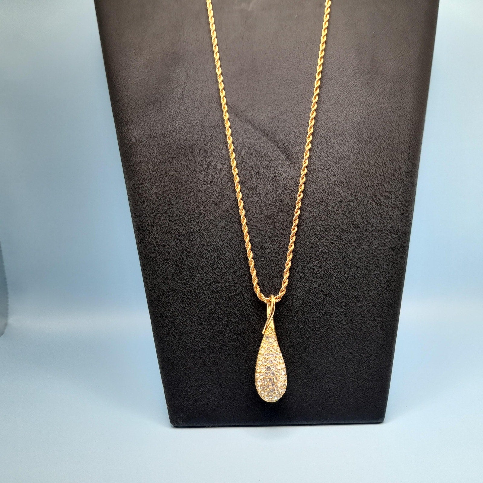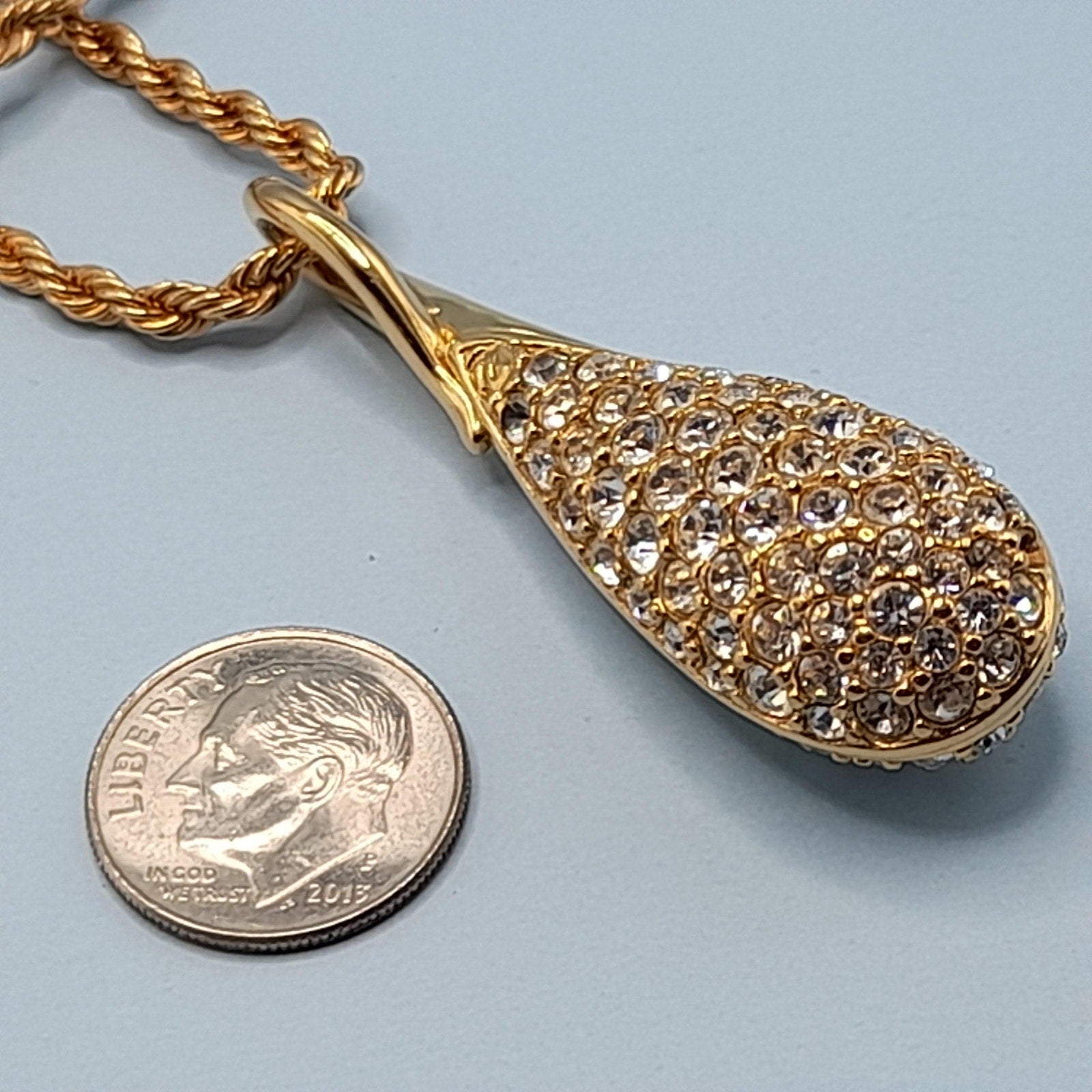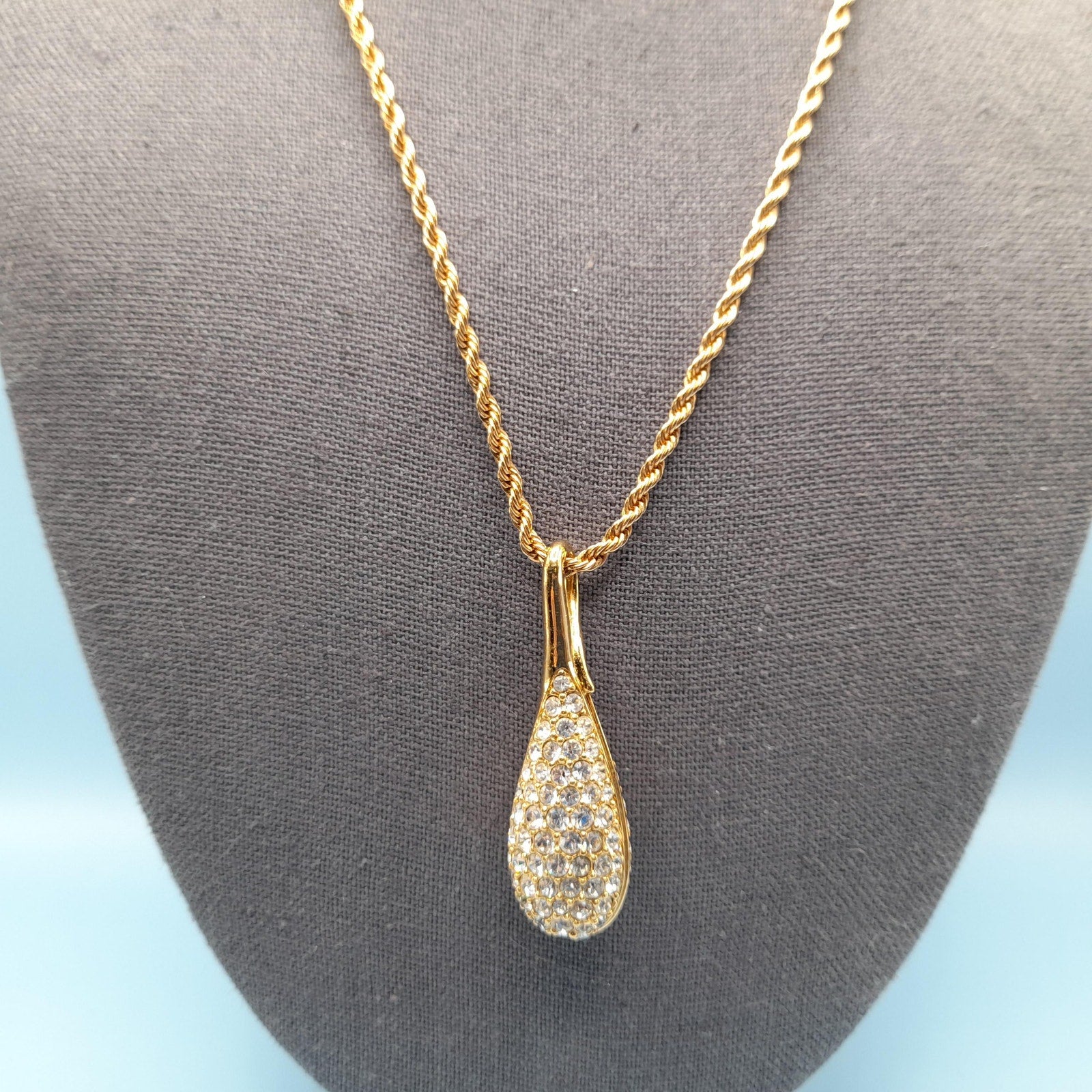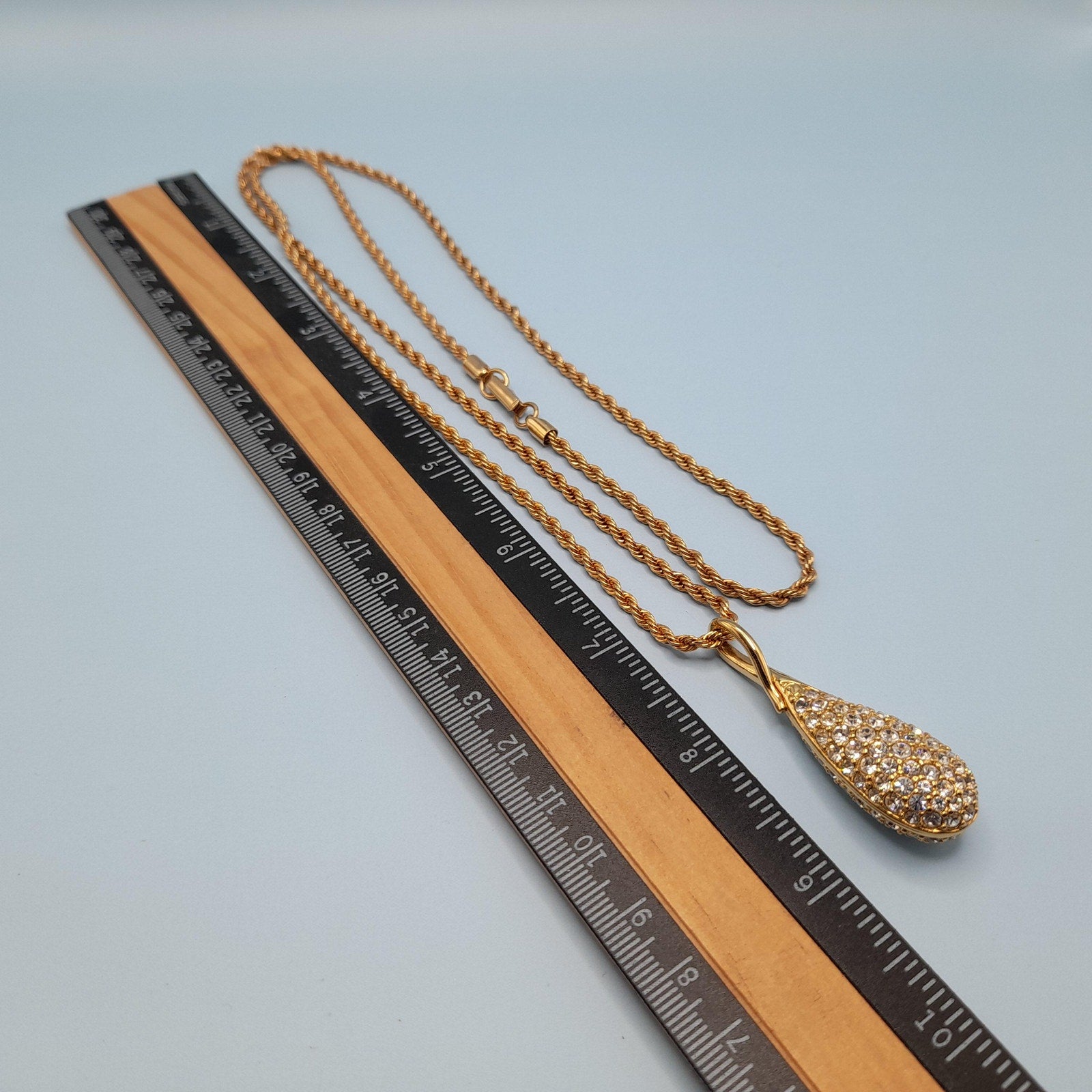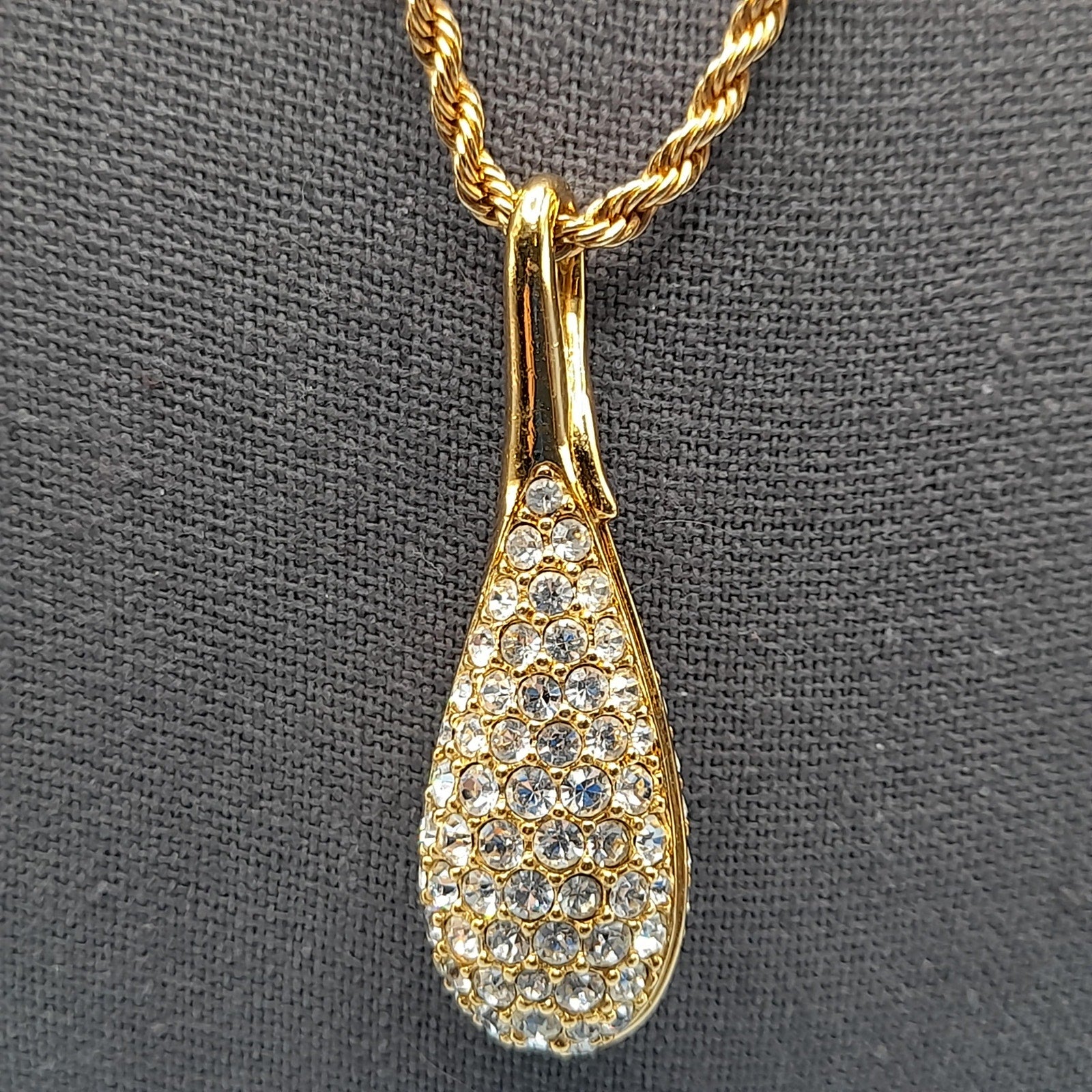 This striking vintage Swarovski necklace features a long 30-inch gold-plated rope chain with a brilliant teardrop pendant encrusted on both sides with clear Swarovski crystals. The pendant sparkles with the brand’s precision-cut stones, designed to mimic the brilliance of diamonds.