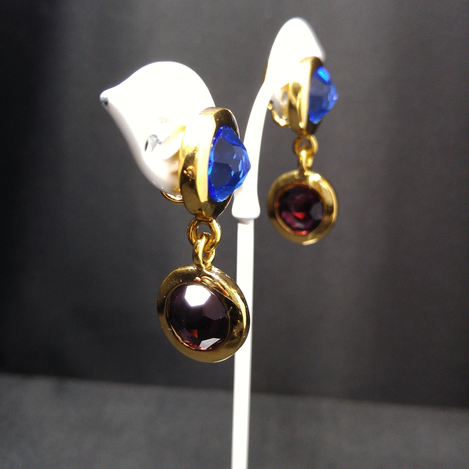 This is a beautiful pair of vintage Swarovski crystal drop earrings from the 1990s. The earrings are gold plated and feature a striking multicolor design. At the top sits a large faceted blue crystal, while the dangling double-sided drop showcases a green rhinestone on one side and a purple rhinestone on the other. Each crystal is set with the pointed faceted side facing outward for extra brilliance.