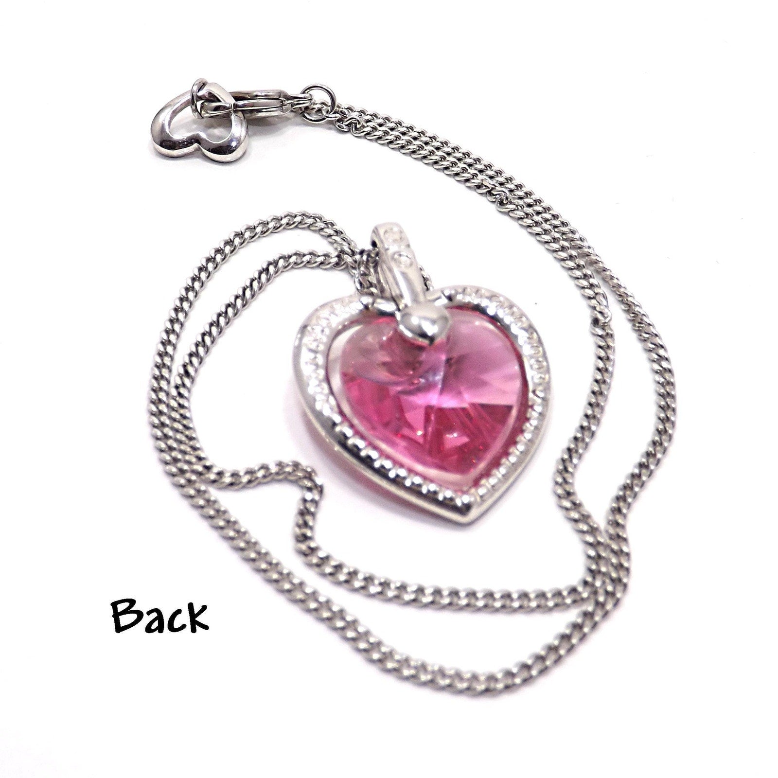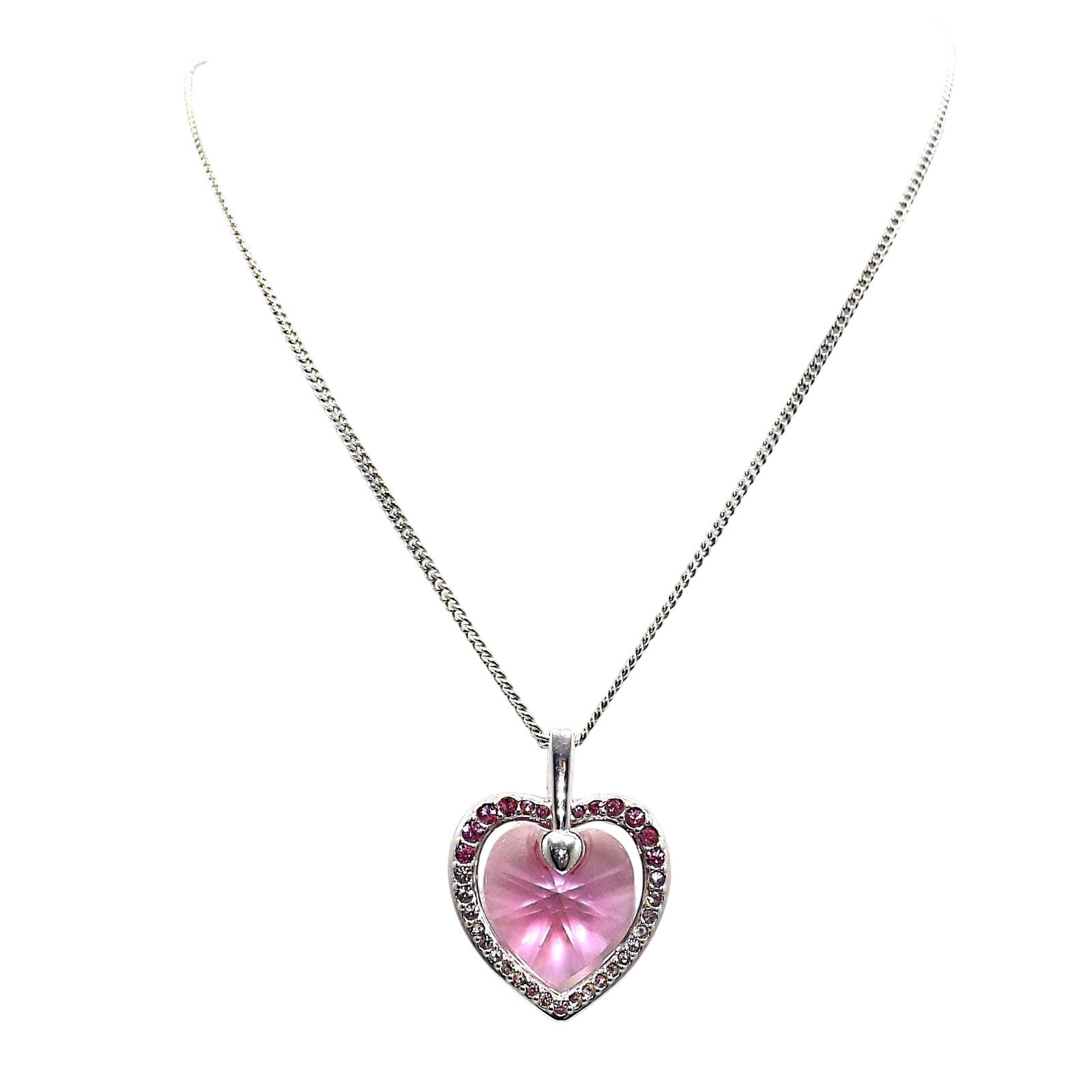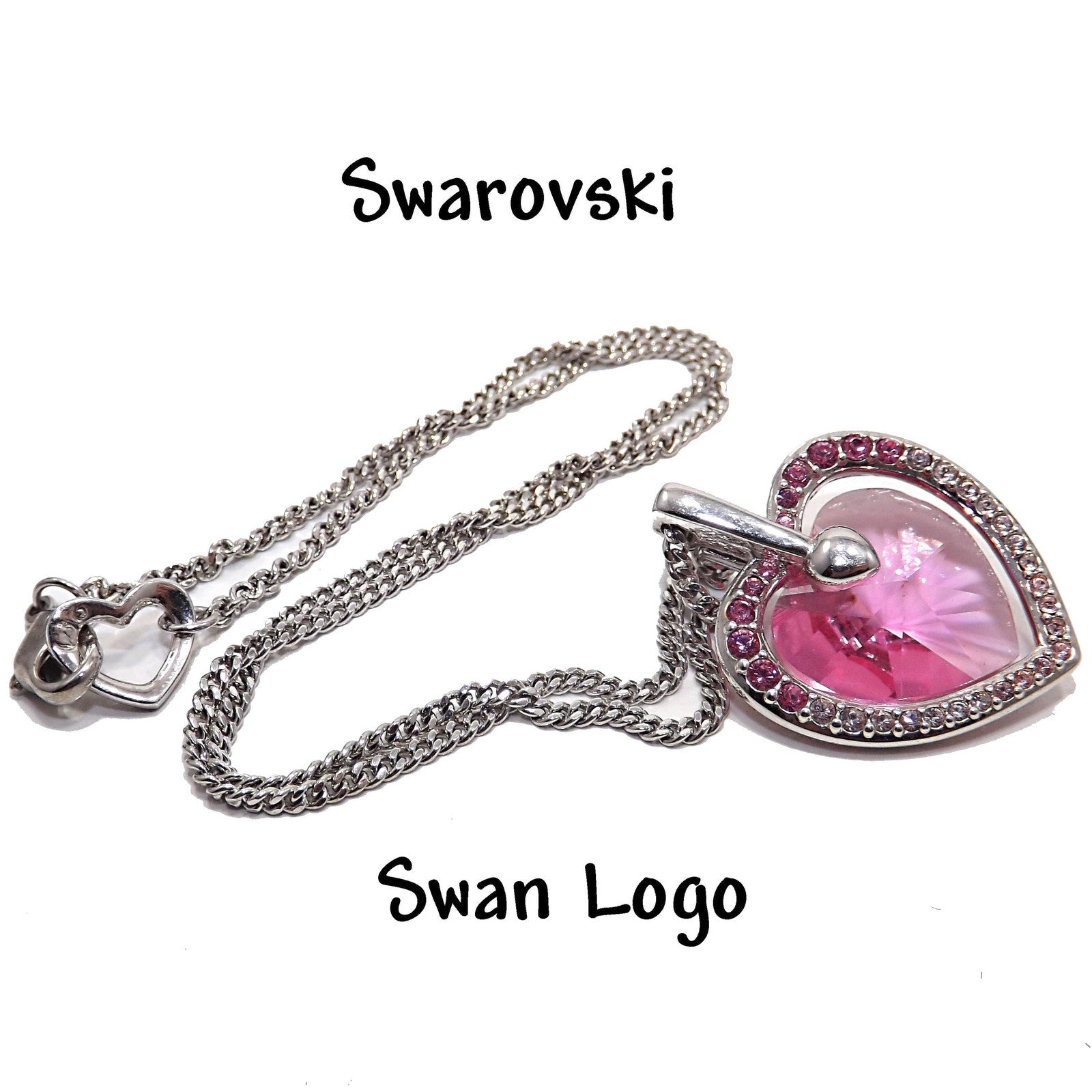 This is a beautiful Swarovski "Mom 2003" pink crystal heart necklace, rhodium plated from late 2002. The pendant features a stunning faceted pink Swarovski crystal heart, framed by alternating pink, light pink, and clear Swarovski rhinestones that sparkle from every angle. The heart pendant is stamped MOM 2003 on the back, along with the iconic Swan Logo, confirming its authenticity. The necklace is completed with a delicate rhodium-plated chain and secure lobster clasp.