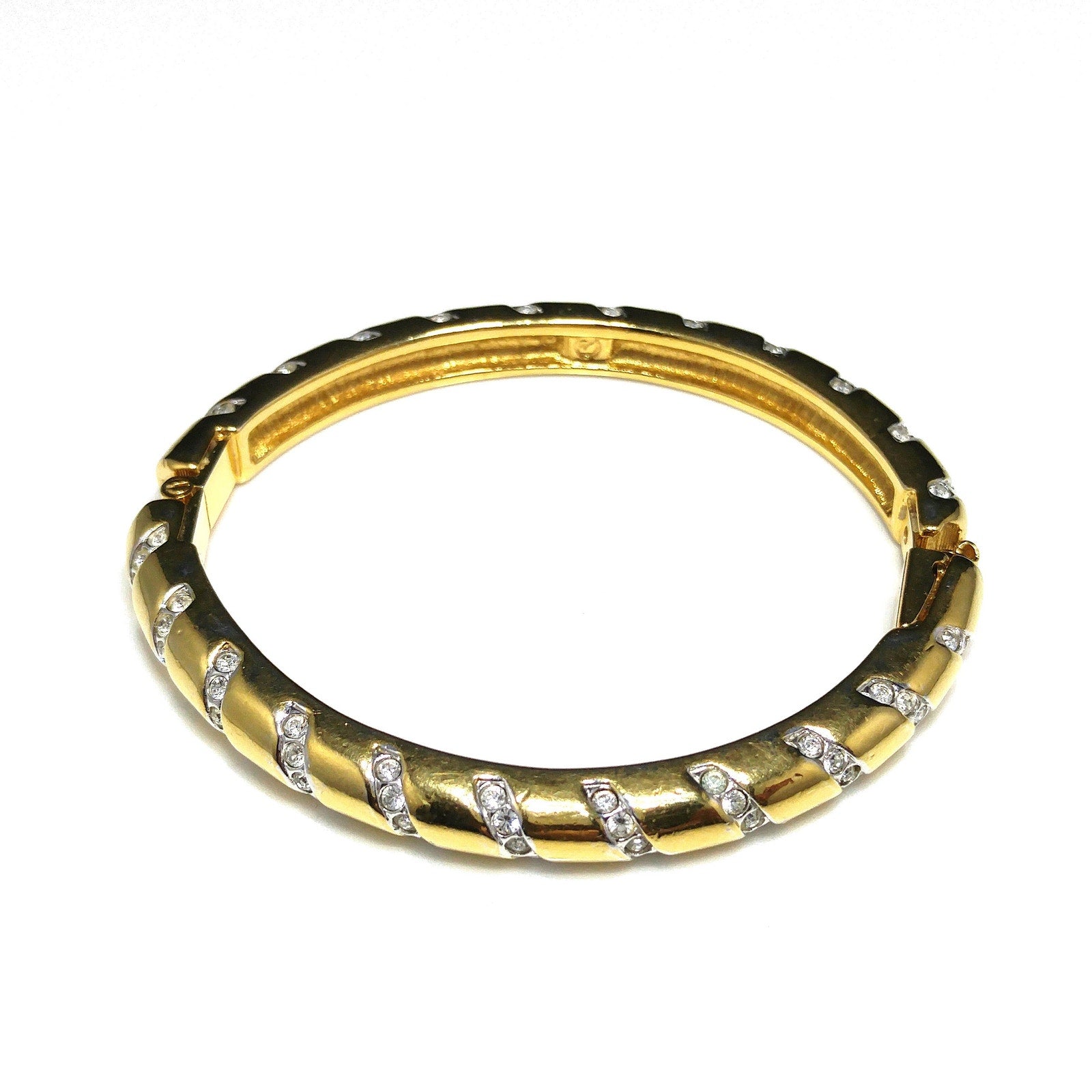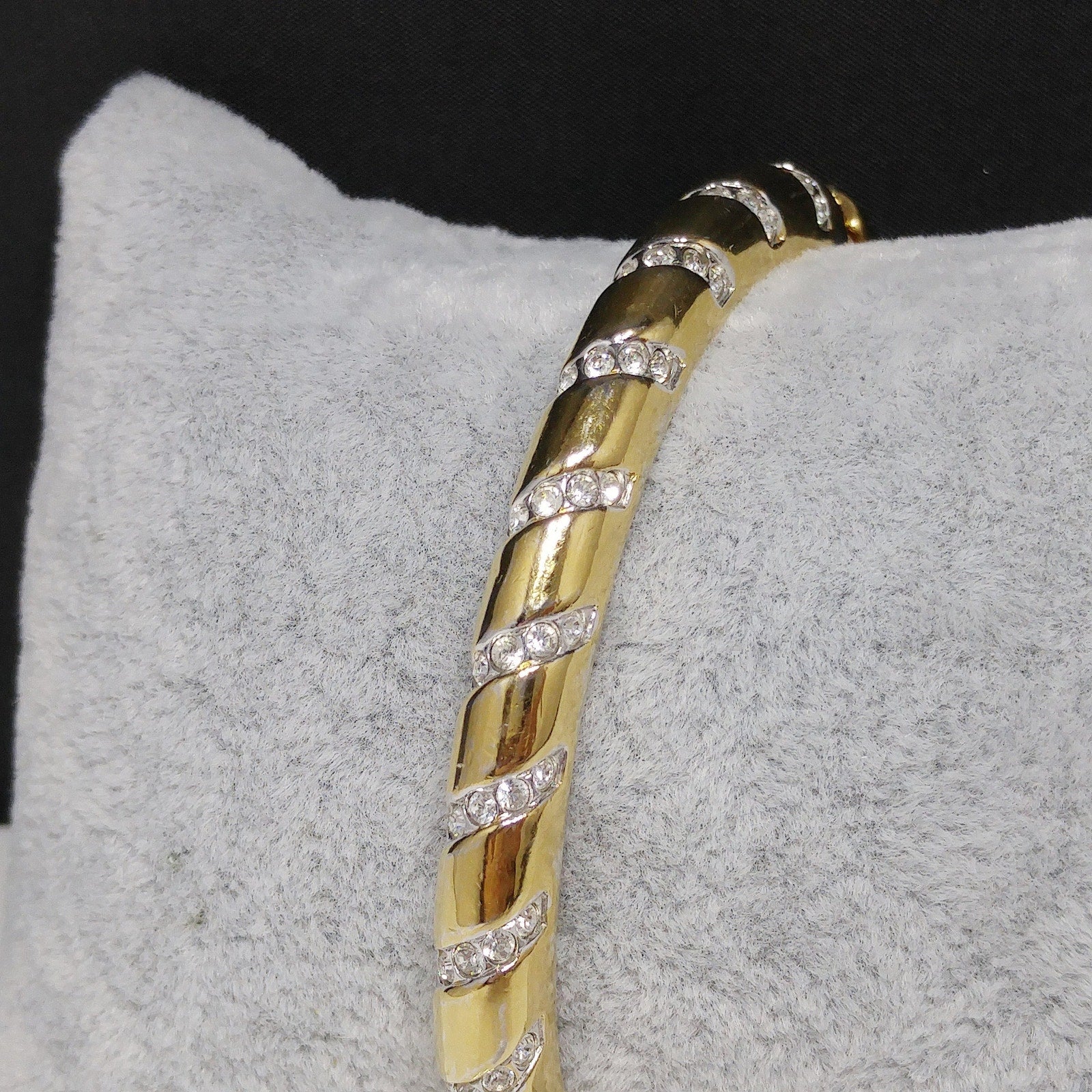 This elegant vintage Swarovski hinged bracelet from the late 1980s features a polished gold-plated surface with diagonal rows of sparkling clear pave rhinestones. The reflective finish paired with the precision-cut Swarovski crystals makes this bangle bracelet a timeless accessory, ideal for both daywear and evening looks.