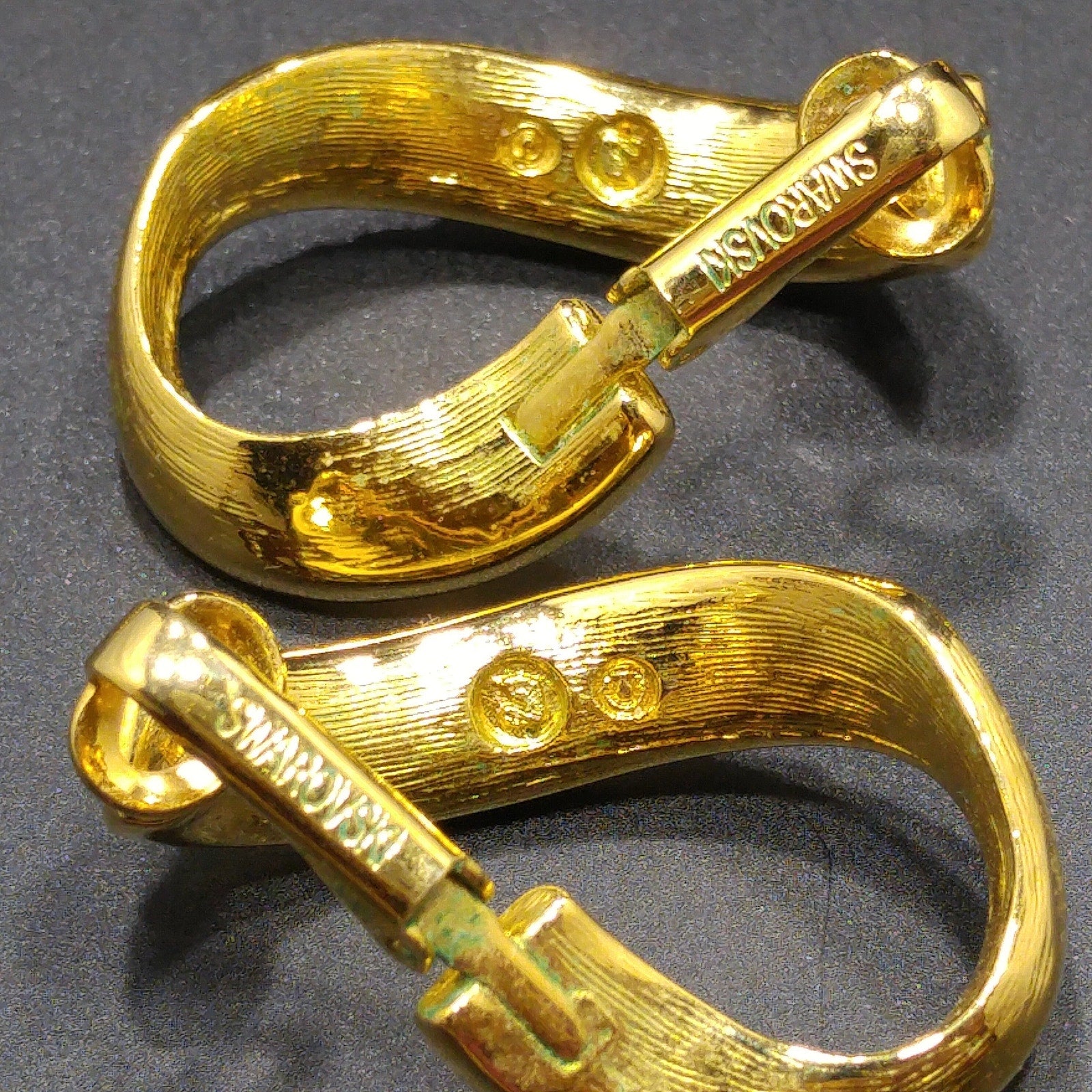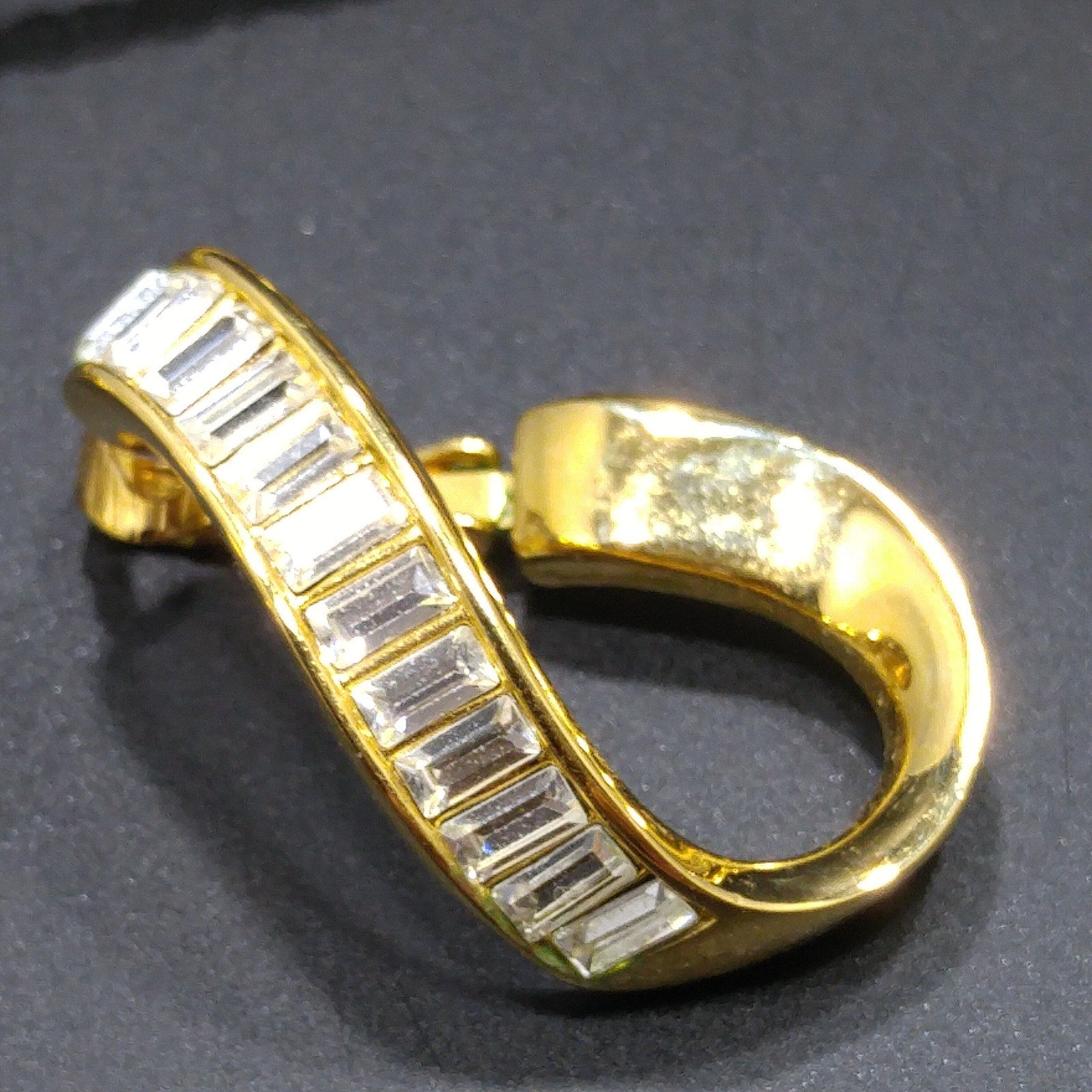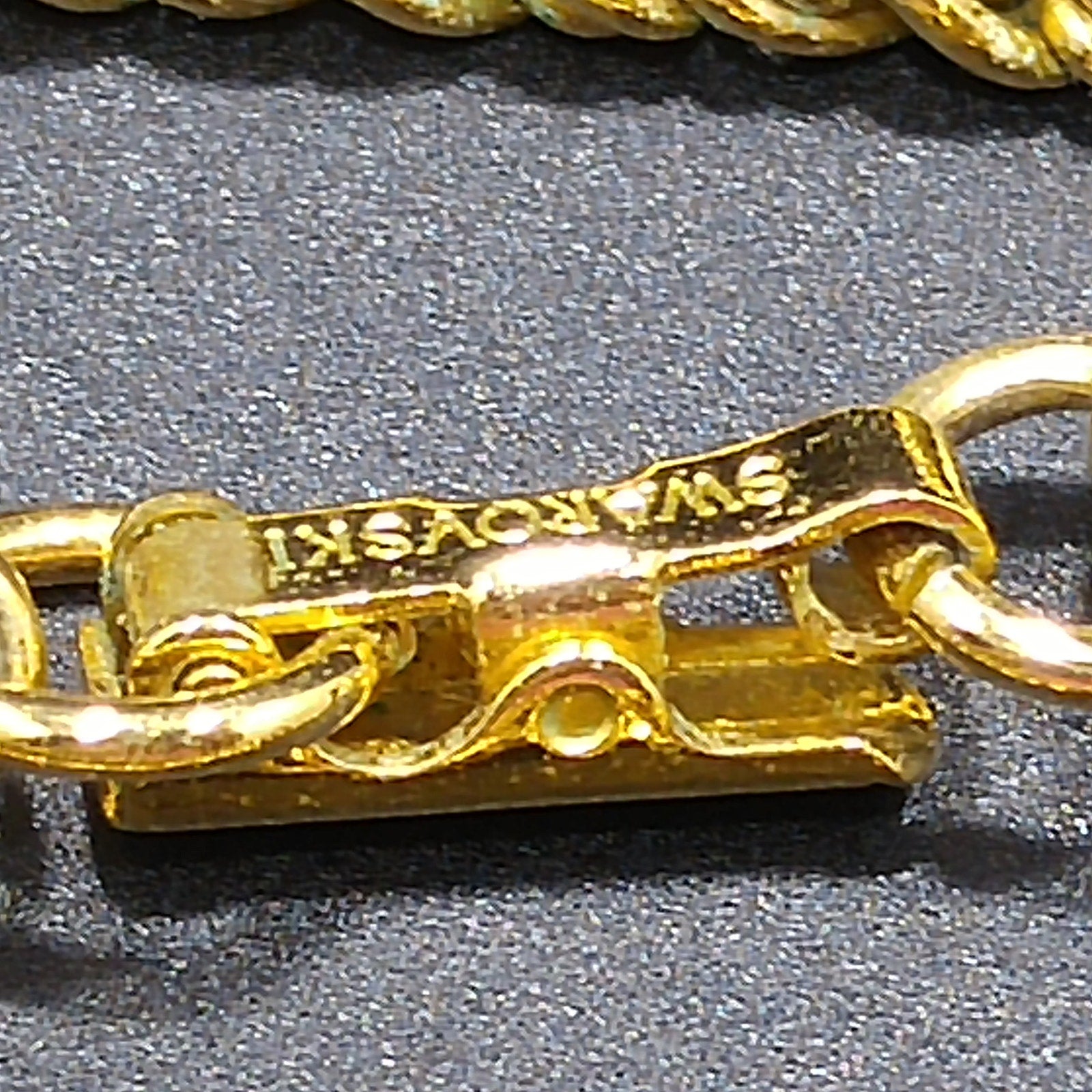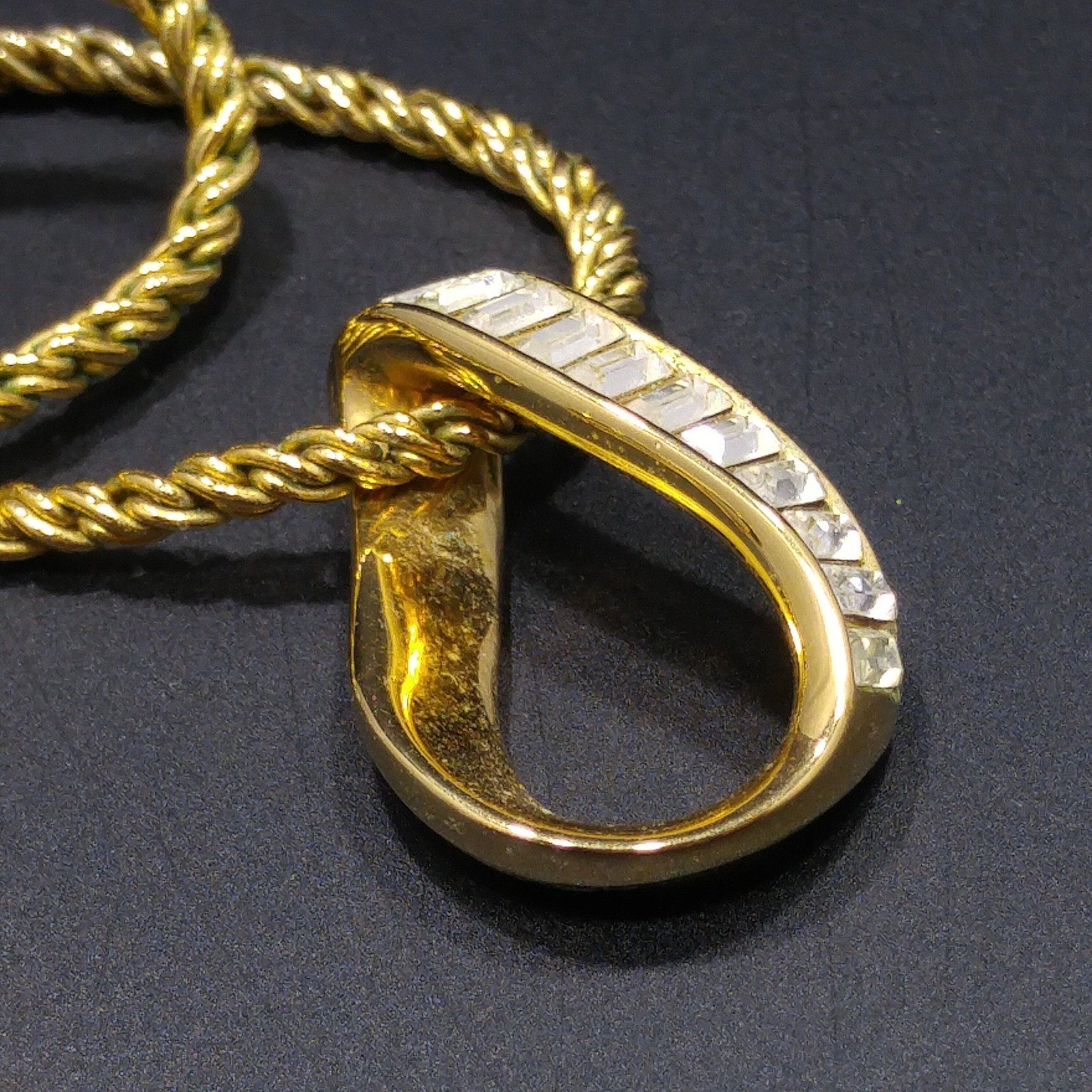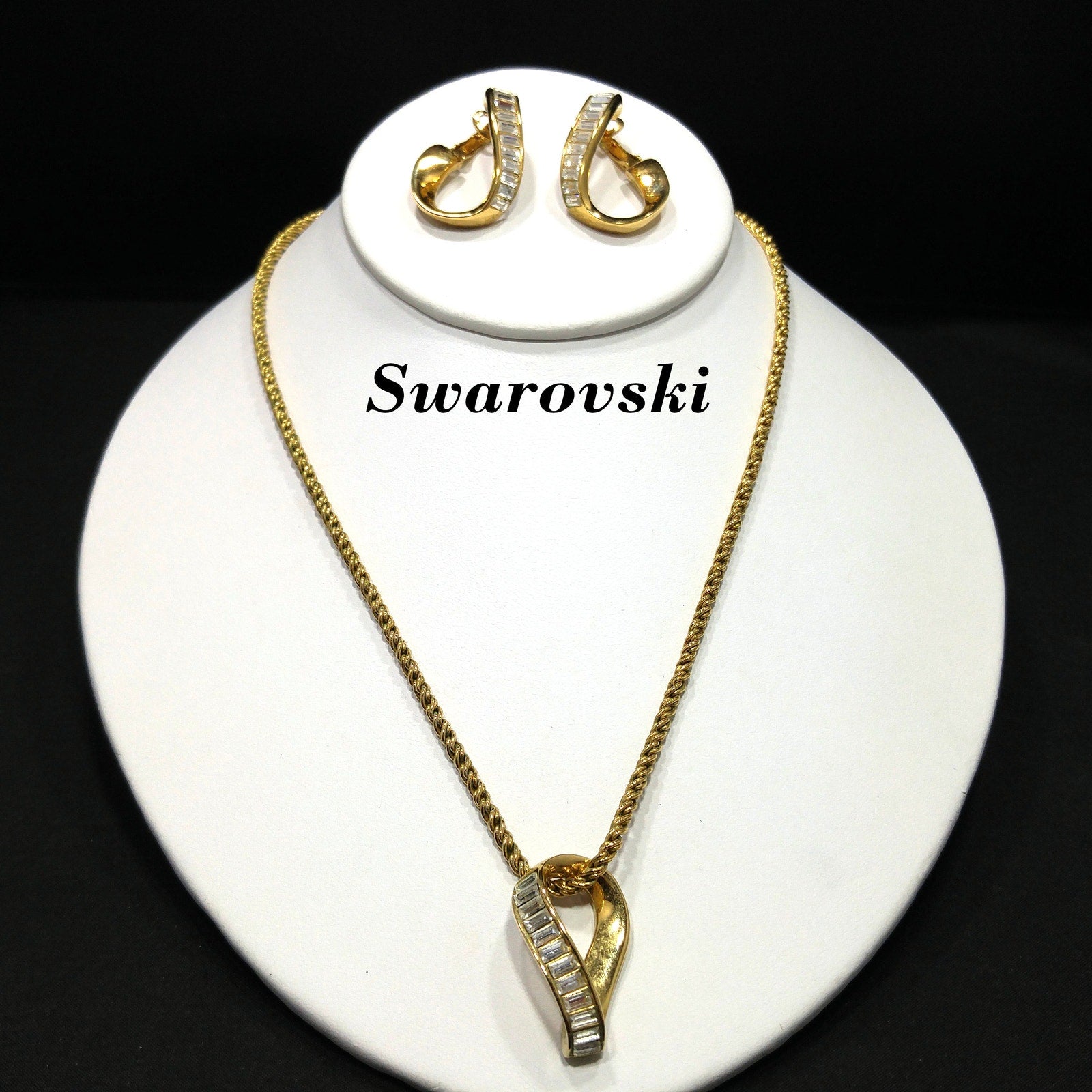 *Description: This is a beautiful clear rhinestone Swarovski gold plated necklace and clip on earrings set from the 1990s. The necklace is a gold plated rope chain with a clear rhinestone baguette pendant and matching clip on earrings. The chain is stamped SWAROVSKI and the remaining pieces are stamped with the swan logo. This would be a great addition to your vintage jewelry collection or make a great vintage gift!