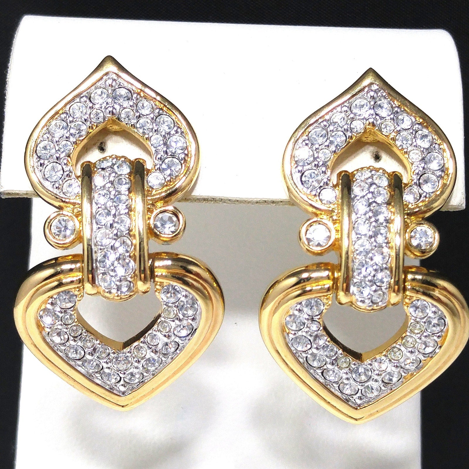 Swarovski Swan Logo Gold Plated Heart Drop Clip Earrings Clear Pave Crystals 90s