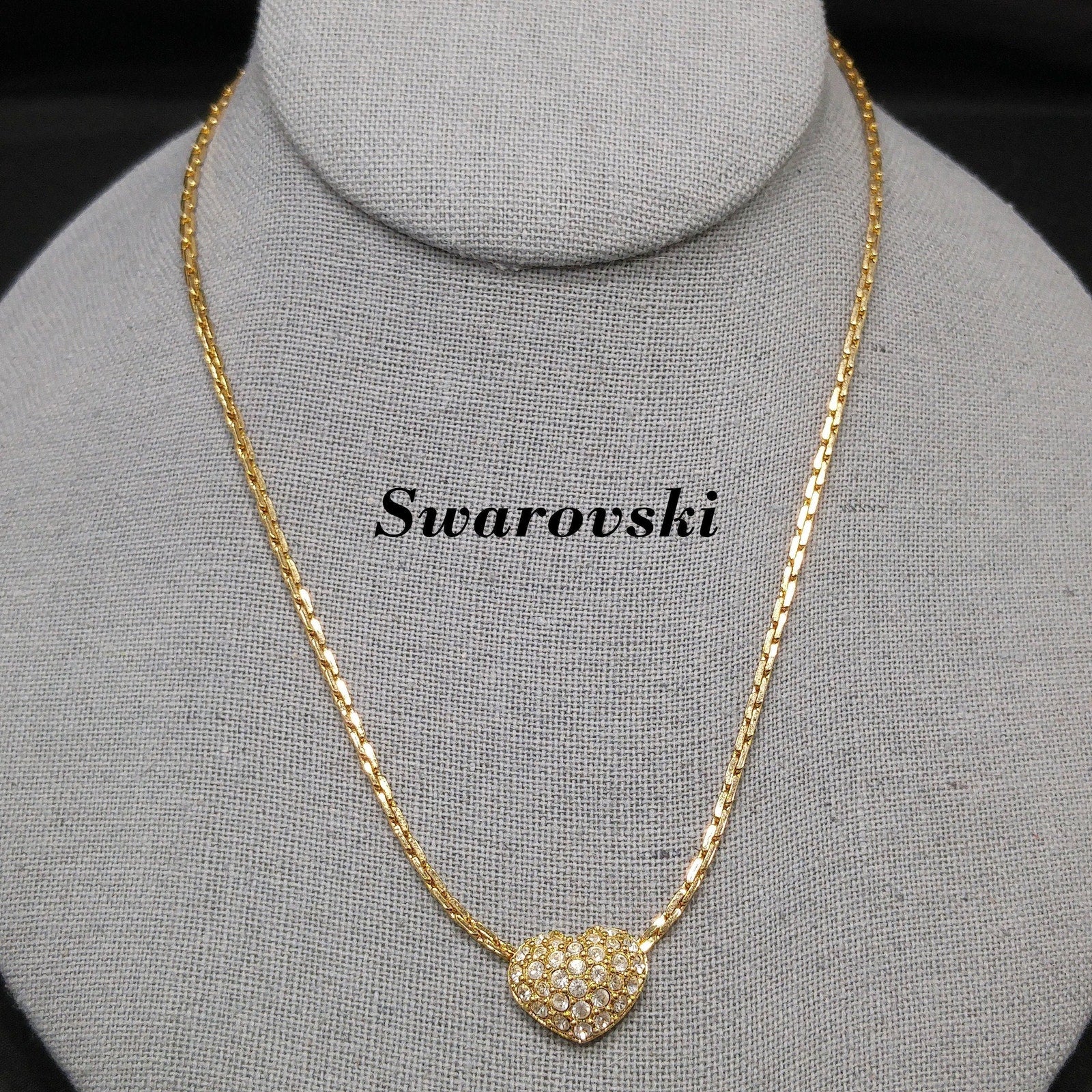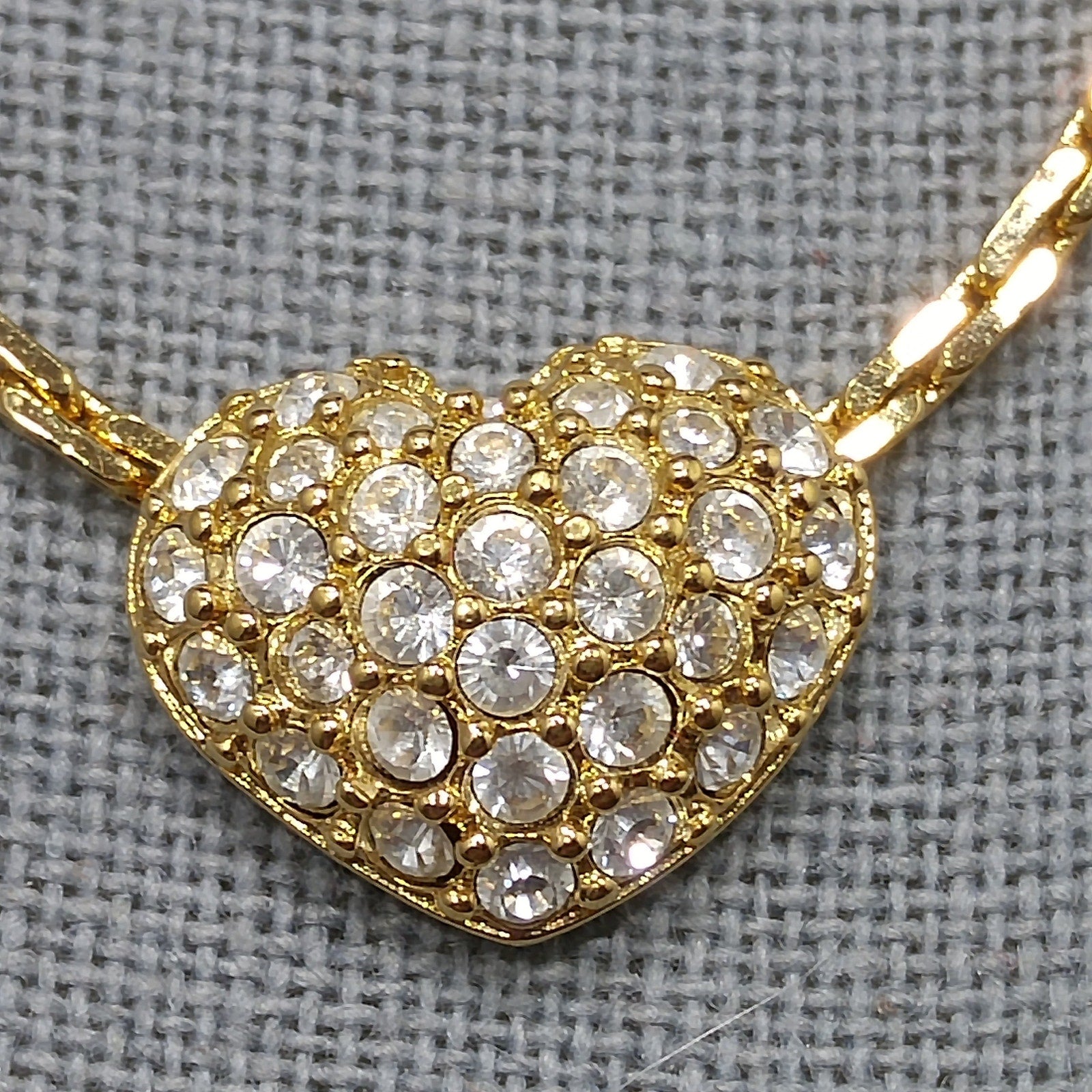 This is a beautiful vintage Swarovski heart necklace from the 1990s, designed with timeless sparkle and elegance. The necklace features a built-in heart pendant covered in clear pavé Swarovski crystal rhinestones, set in a gold-plated finish.