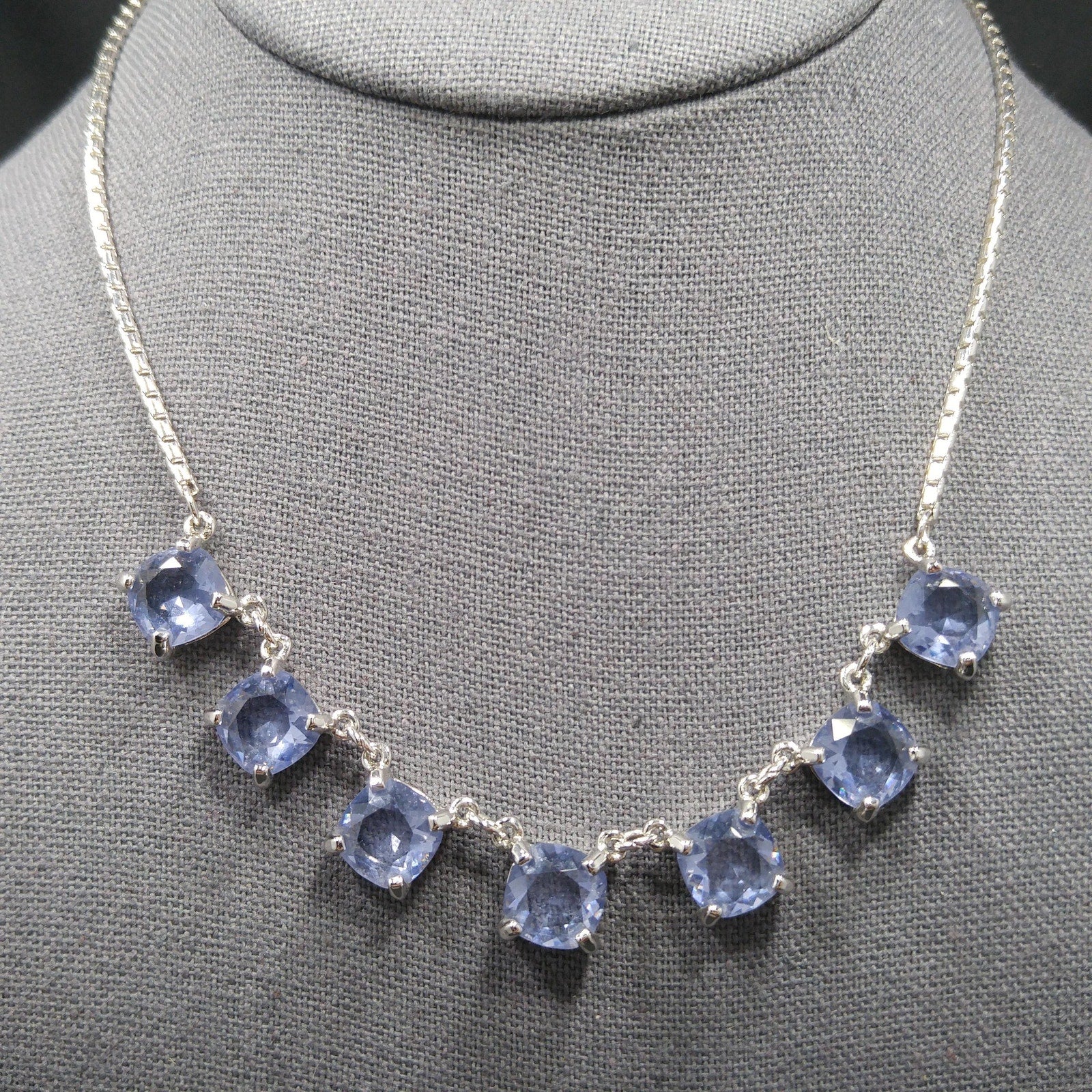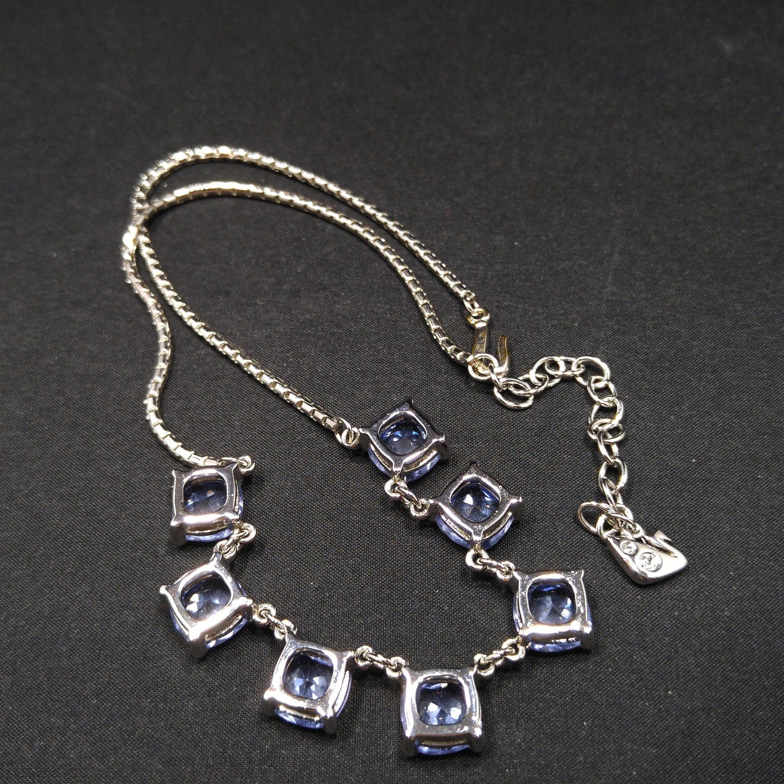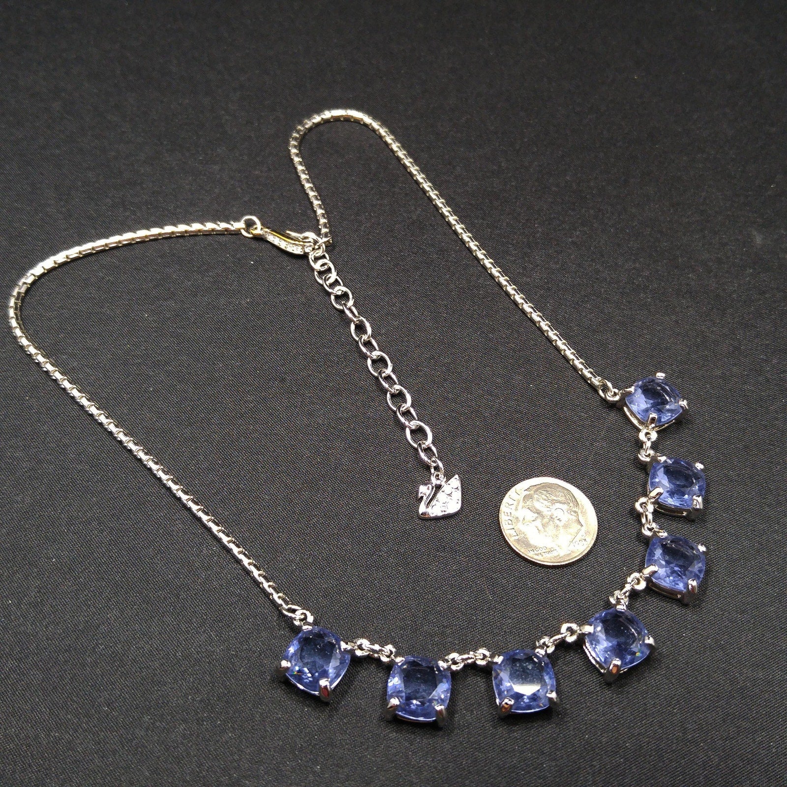 This is a gorgeous Swarovski necklace with sparkling blue lavender crystals in an Art Deco-inspired style. Each 10mm crystal is prong set in rhodium plated silver tone metal for a brilliant, high-quality finish.