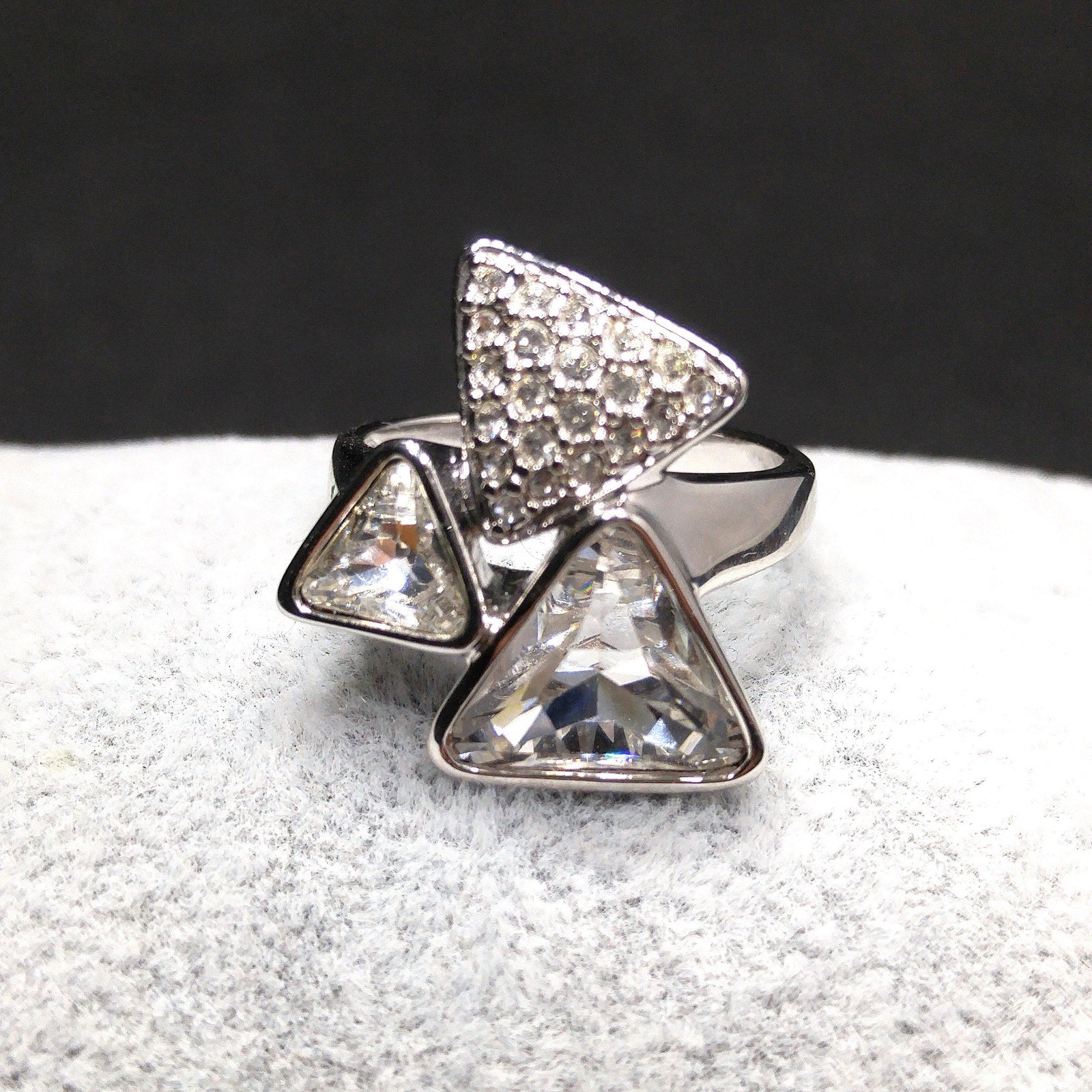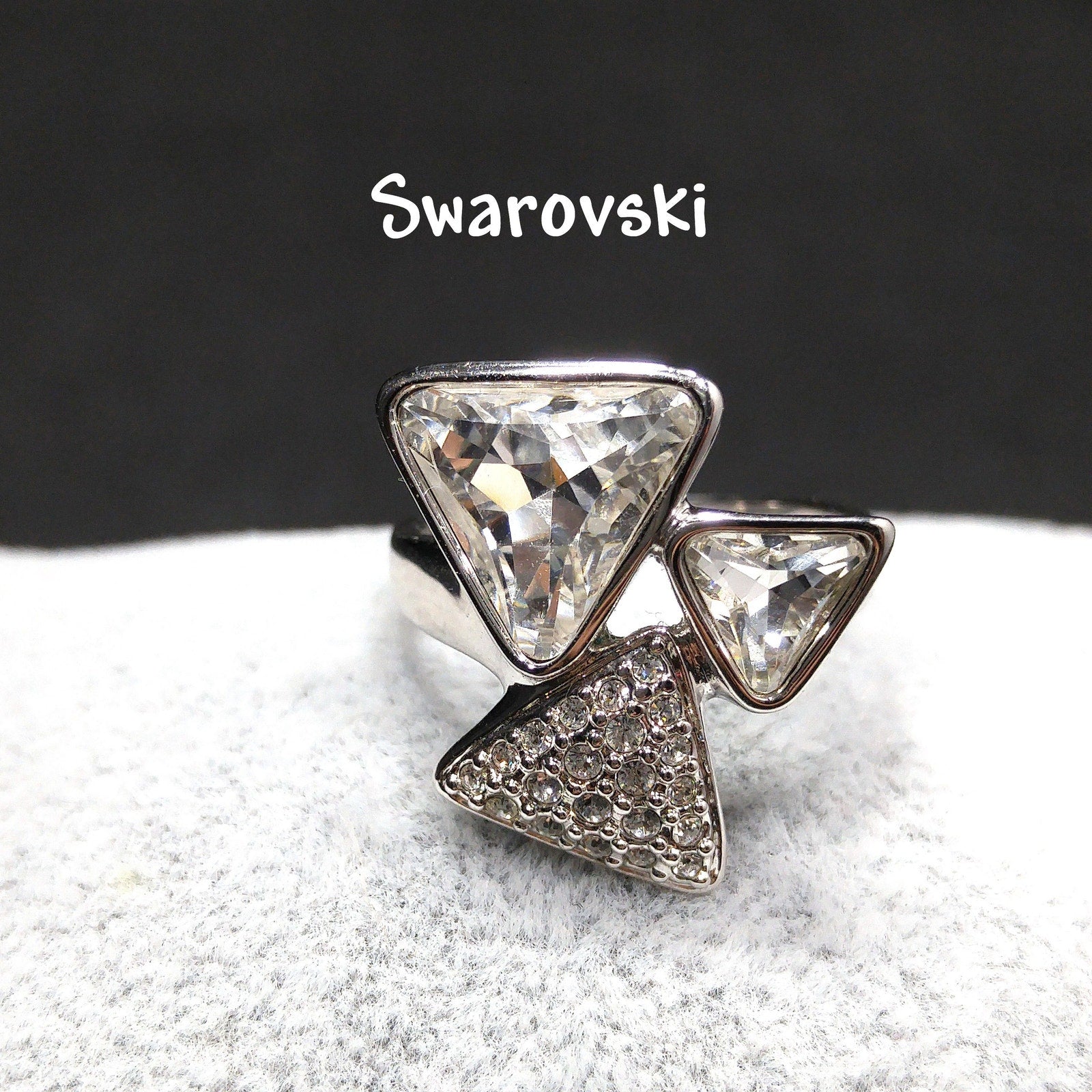 This is a stunning Swarovski three-triangle statement ring crafted in rhodium plate. Two of the triangles feature brilliant-cut Swarovski crystals, while the third is paved with sparkling clear rhinestones. The modern geometric design makes this ring both eye-catching and timeless.