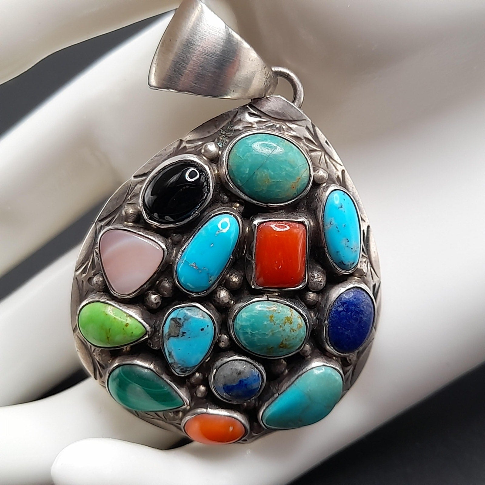 *Description: This is a beautiful T. Benally Sterling Navajo pendant from around the 1970s. The gemstones are a variety of colors on a sterling teardrop shaped backing. Handmade jewelry with a large bail. Add your favorite wide chain. This would be a great addition to your vintage jewelry collection or make a great vintage gift!