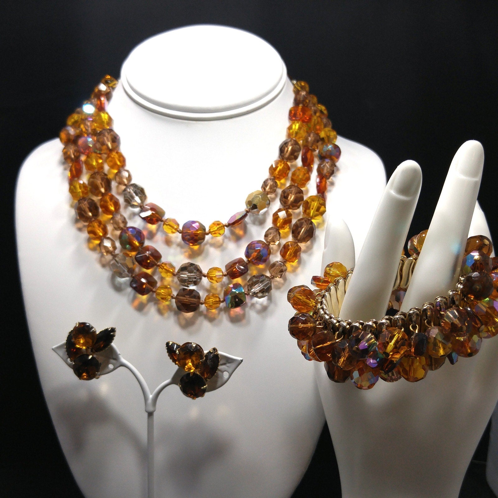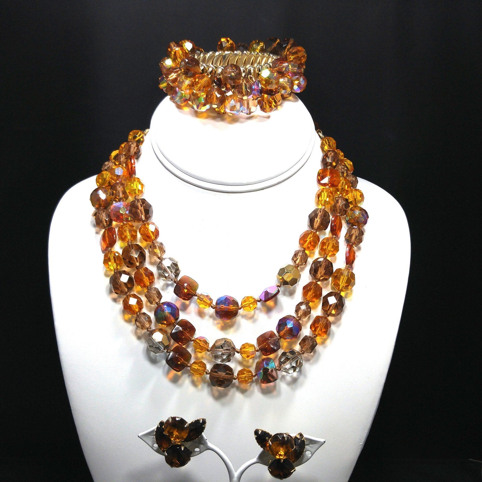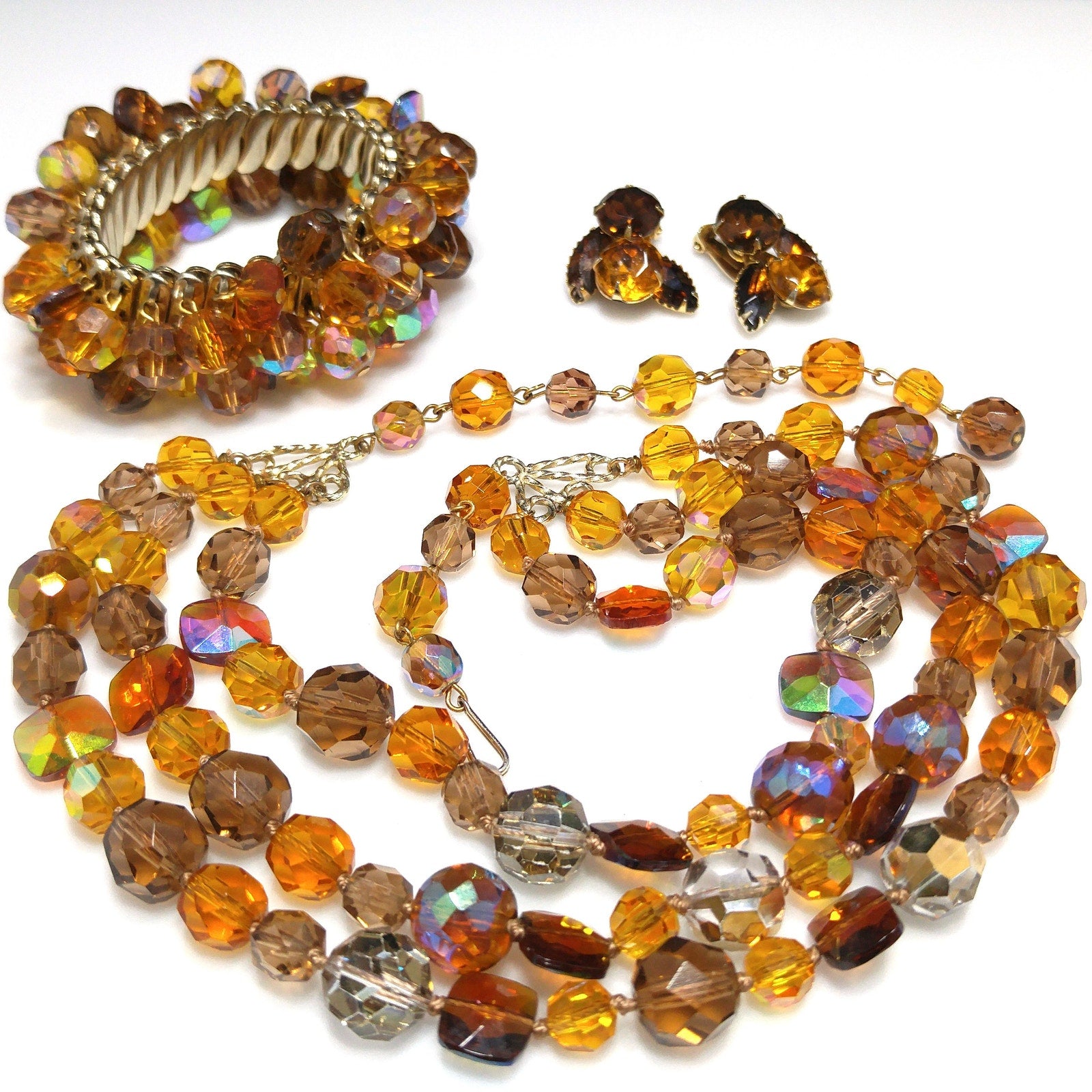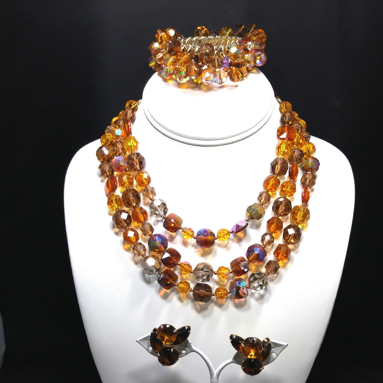 *Description: This is a gorgeous topaz crystal vintage jewelry set from the 1960s. The set includes a hand-knotted topaz aurora borealis crystal three strand necklace, a matching cha cha expansion bracelet, and clip on topaz rhinestone earrings. Each piece is gold plated and in excellent condition. This would be a great addition to your vintage jewelry collection or make a great vintage gift!