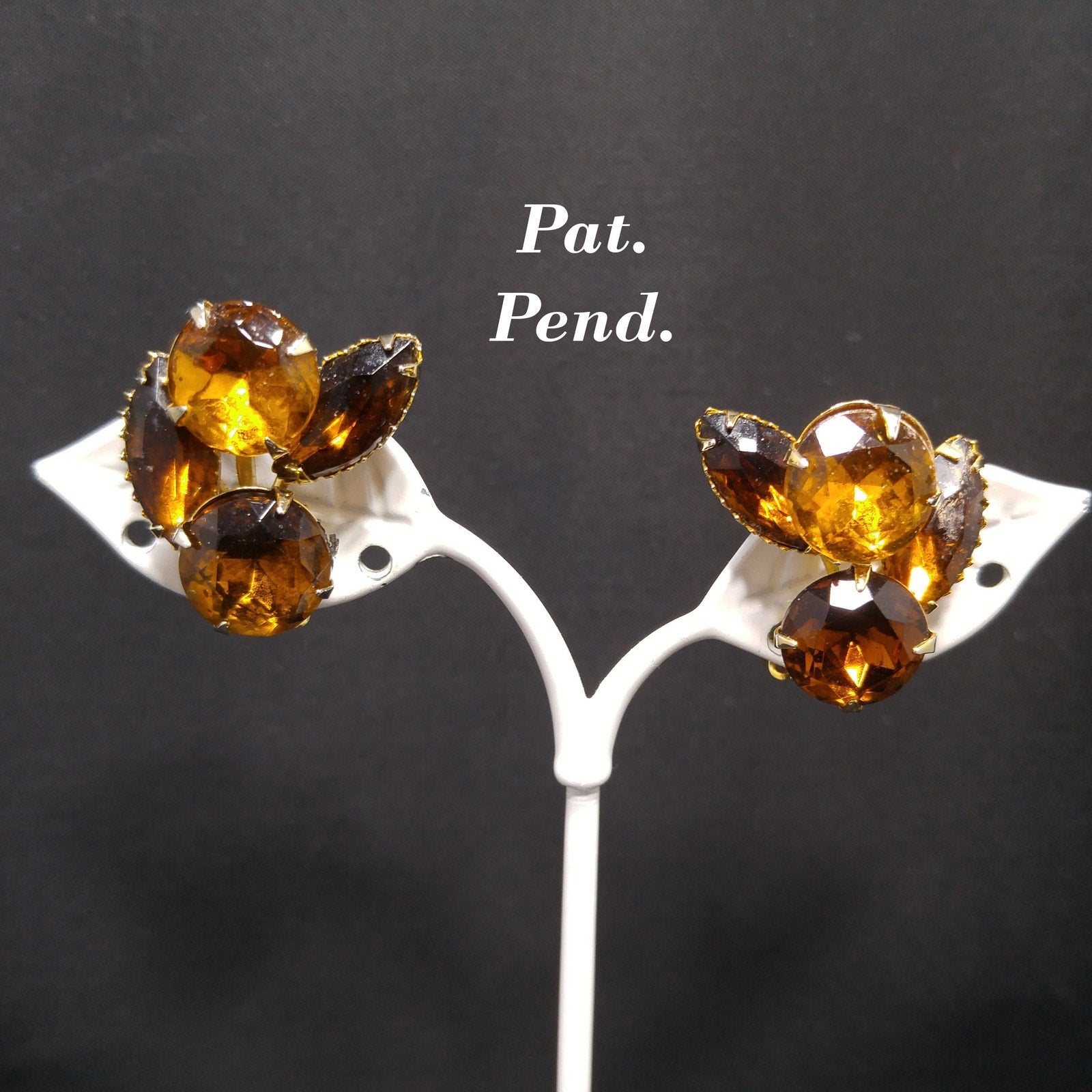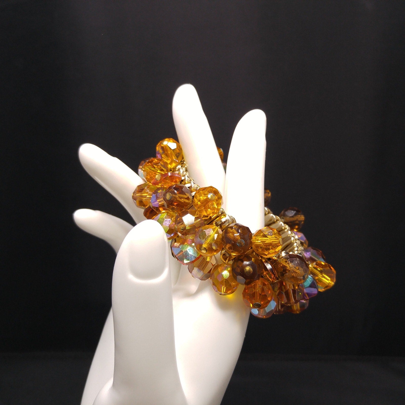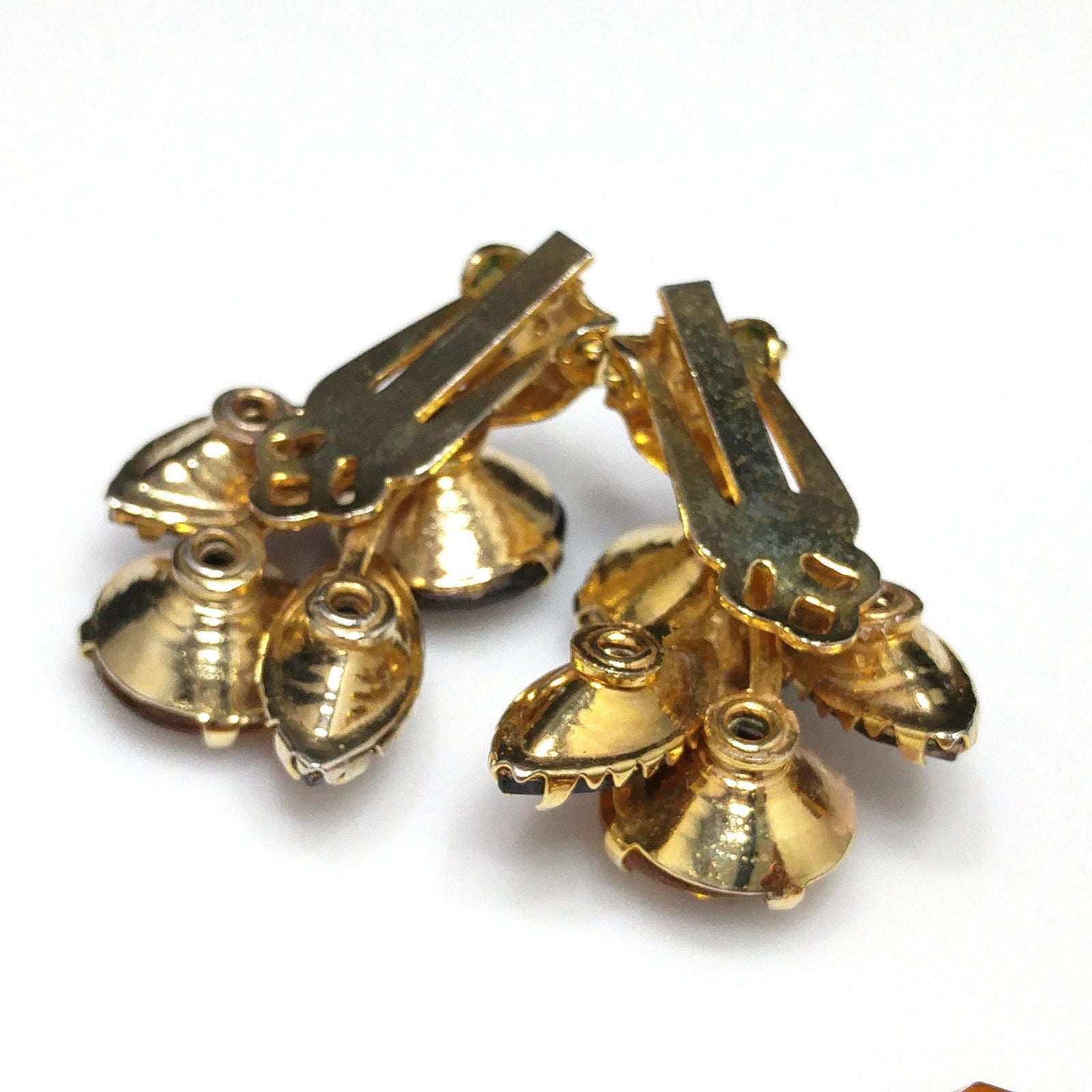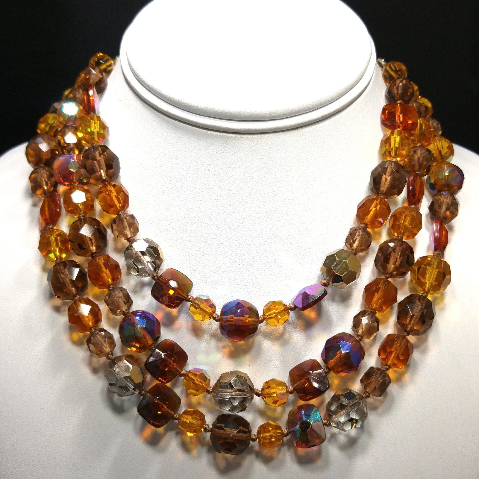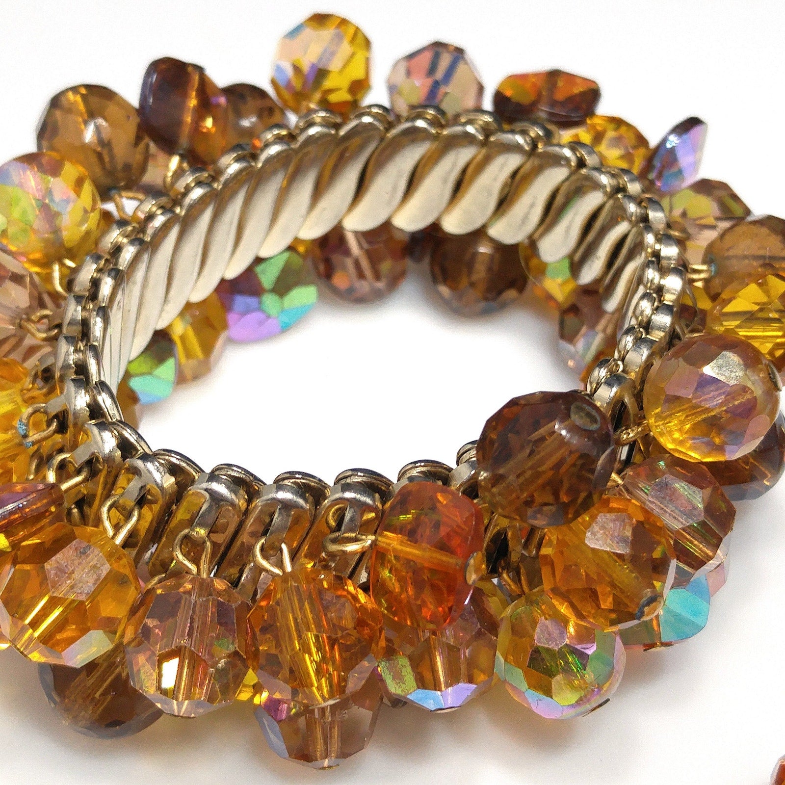 *Description: This is a gorgeous topaz crystal vintage jewelry set from the 1960s. The set includes a hand-knotted topaz aurora borealis crystal three strand necklace, a matching cha cha expansion bracelet, and clip on topaz rhinestone earrings. Each piece is gold plated and in excellent condition. This would be a great addition to your vintage jewelry collection or make a great vintage gift!