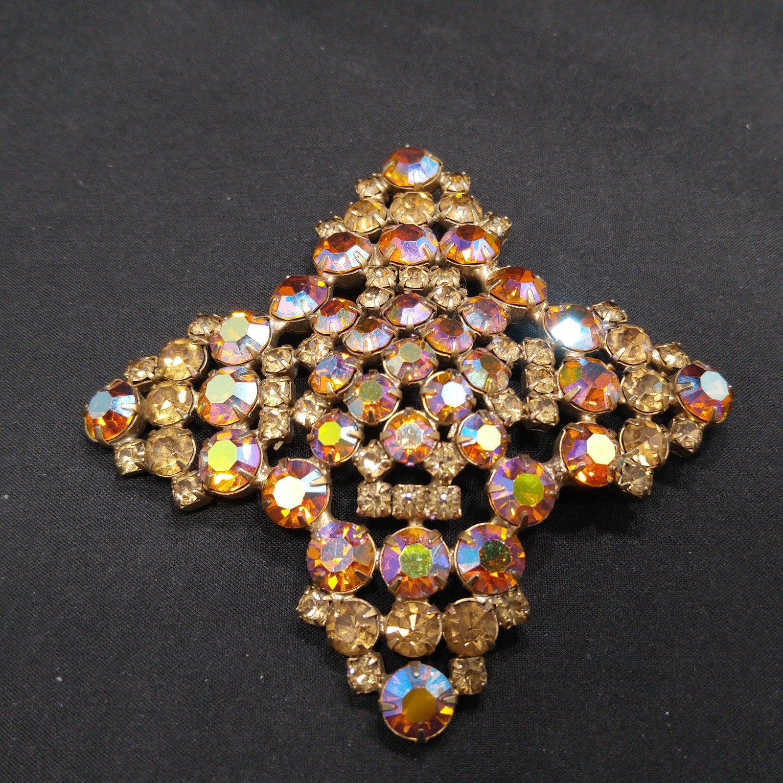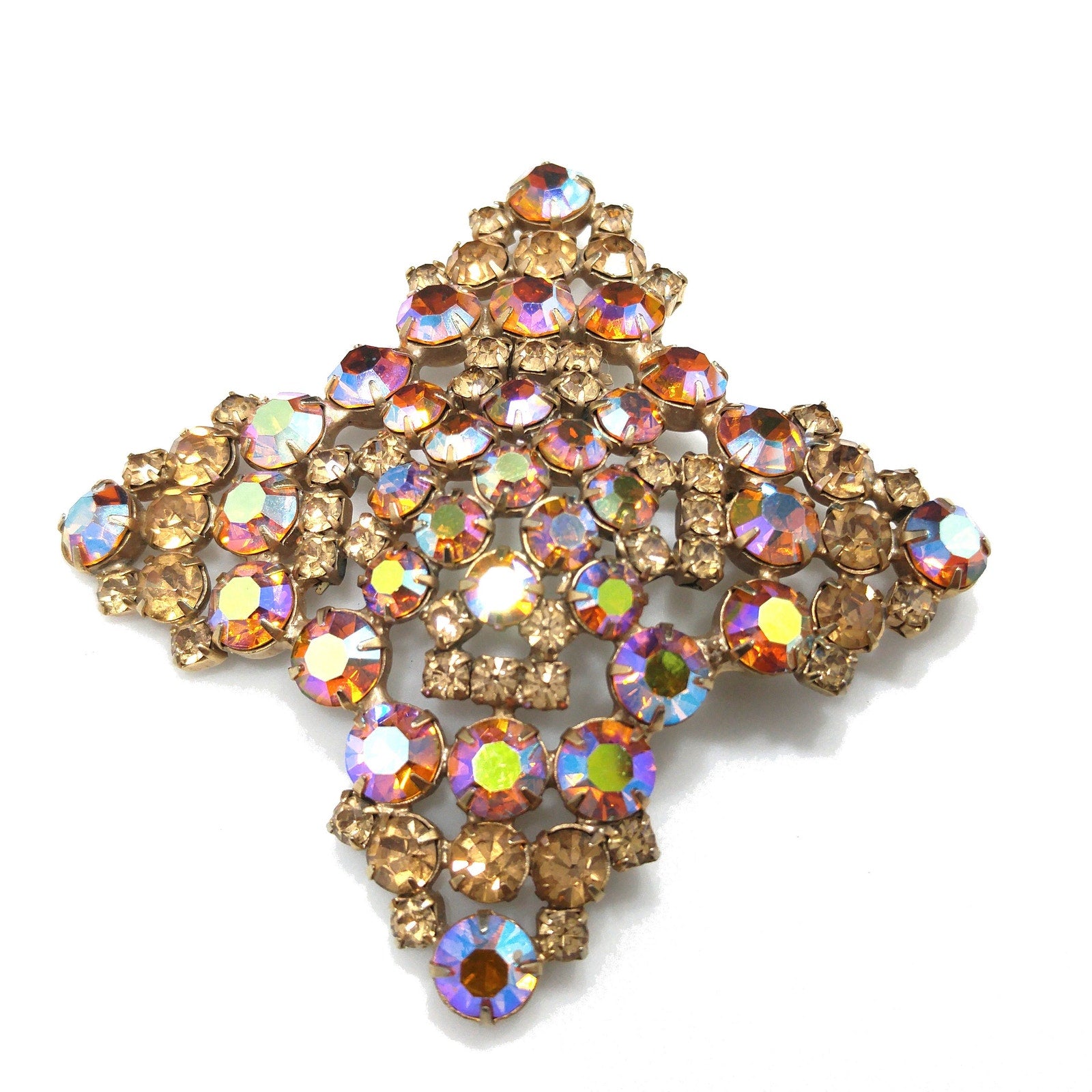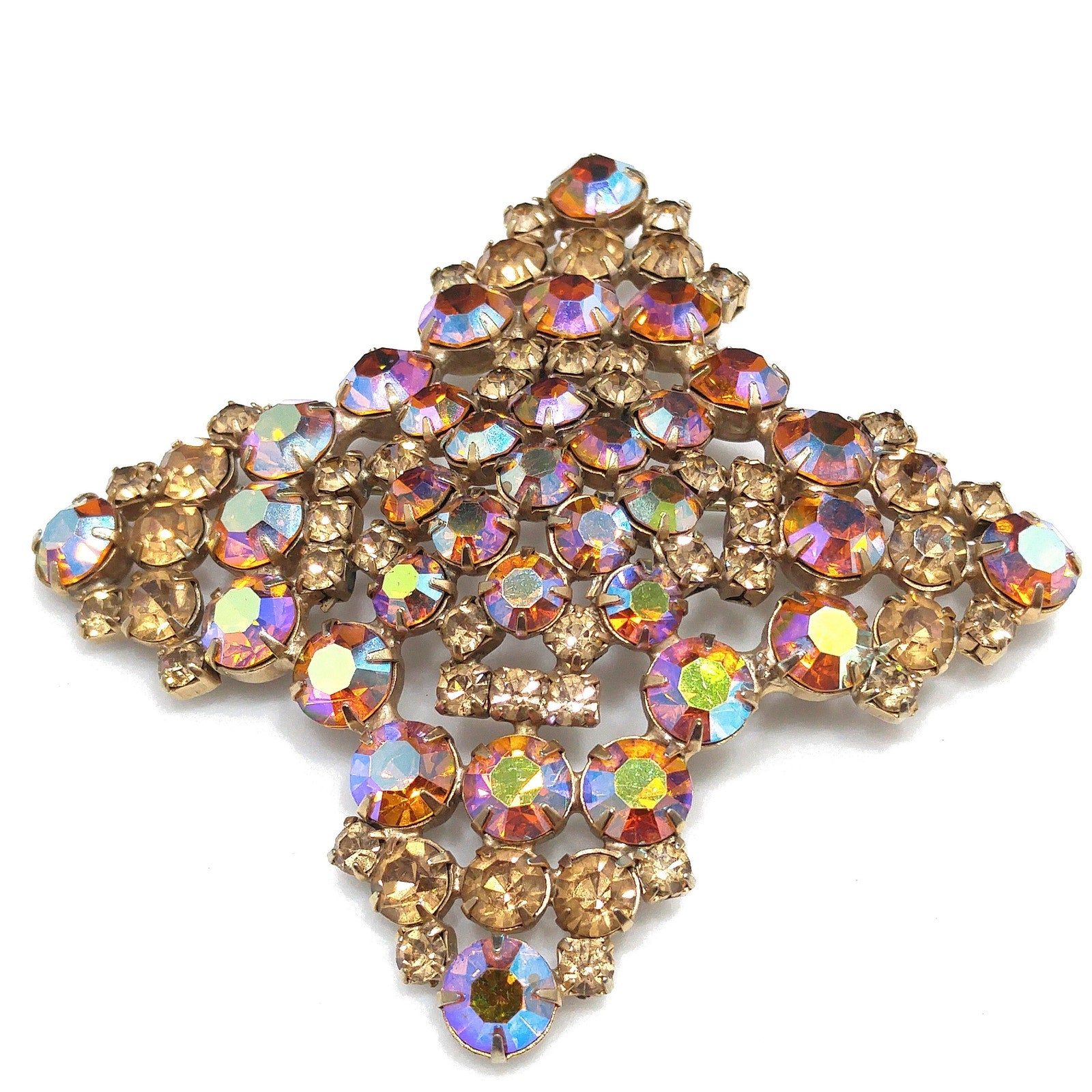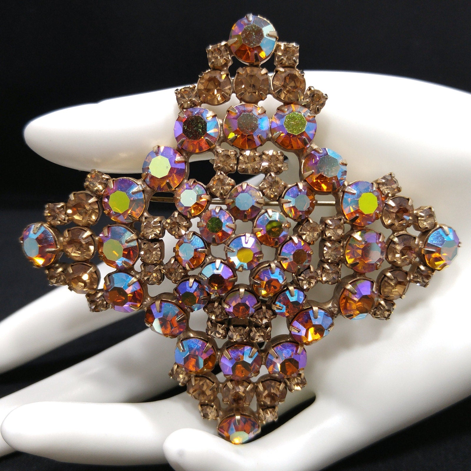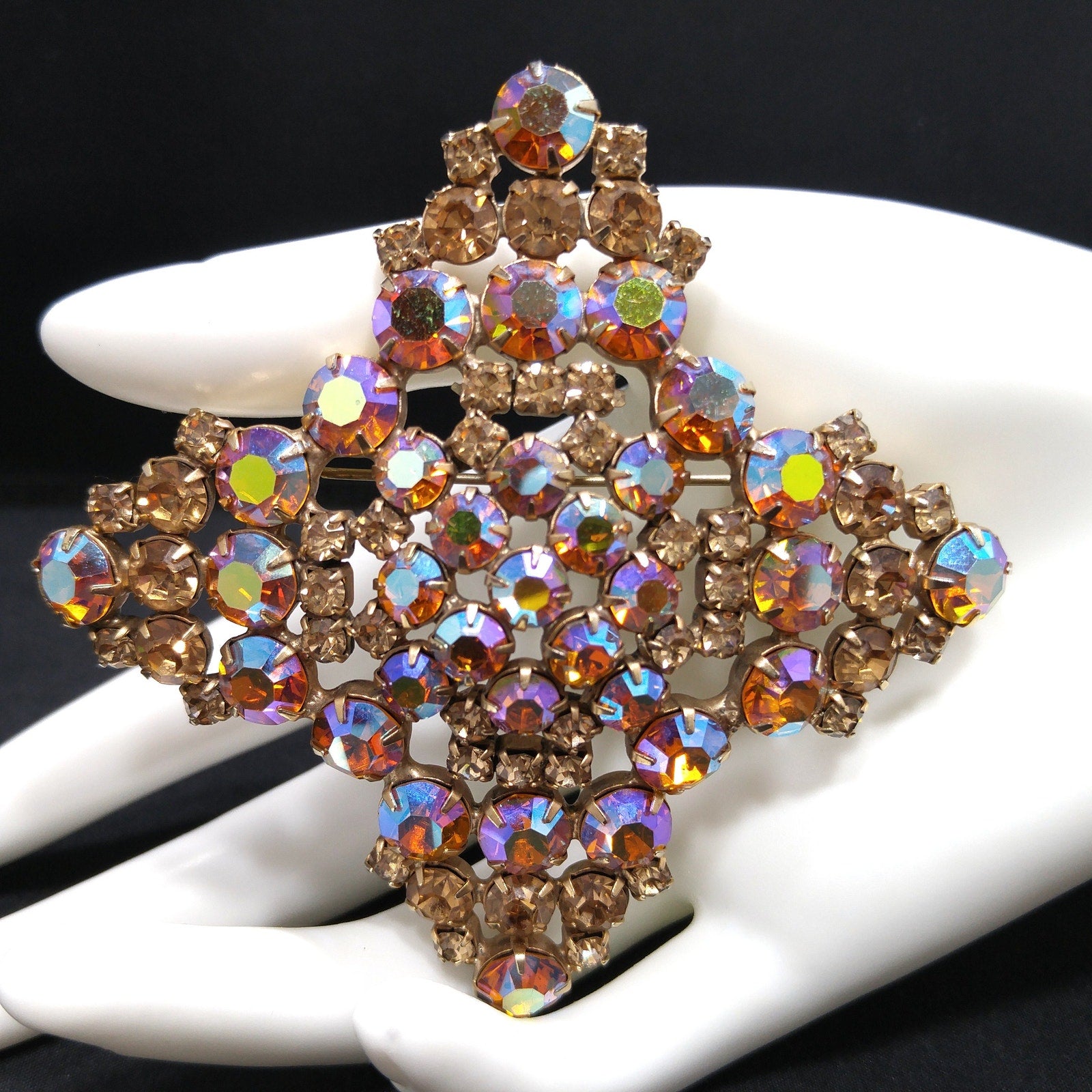 *Description: This is a gorgeous topaz glass aurora borealis very large brooch from the late 1950s to 1960s. The brooch is set on a gold plated backing and each rhinestone is prong set. Some of the rhinestones are light topaz glass and others are aurora borealis topaz glass with reflections of blue, pink and silver. The brooch is very large at 3 1/2 Inches across in width and length. It has four points and is slightly domed. It is full of reflection and light and is a beautiful mid-century brooch. This would be a great addition to your vintage jewelry collection or make a great vintage gift!