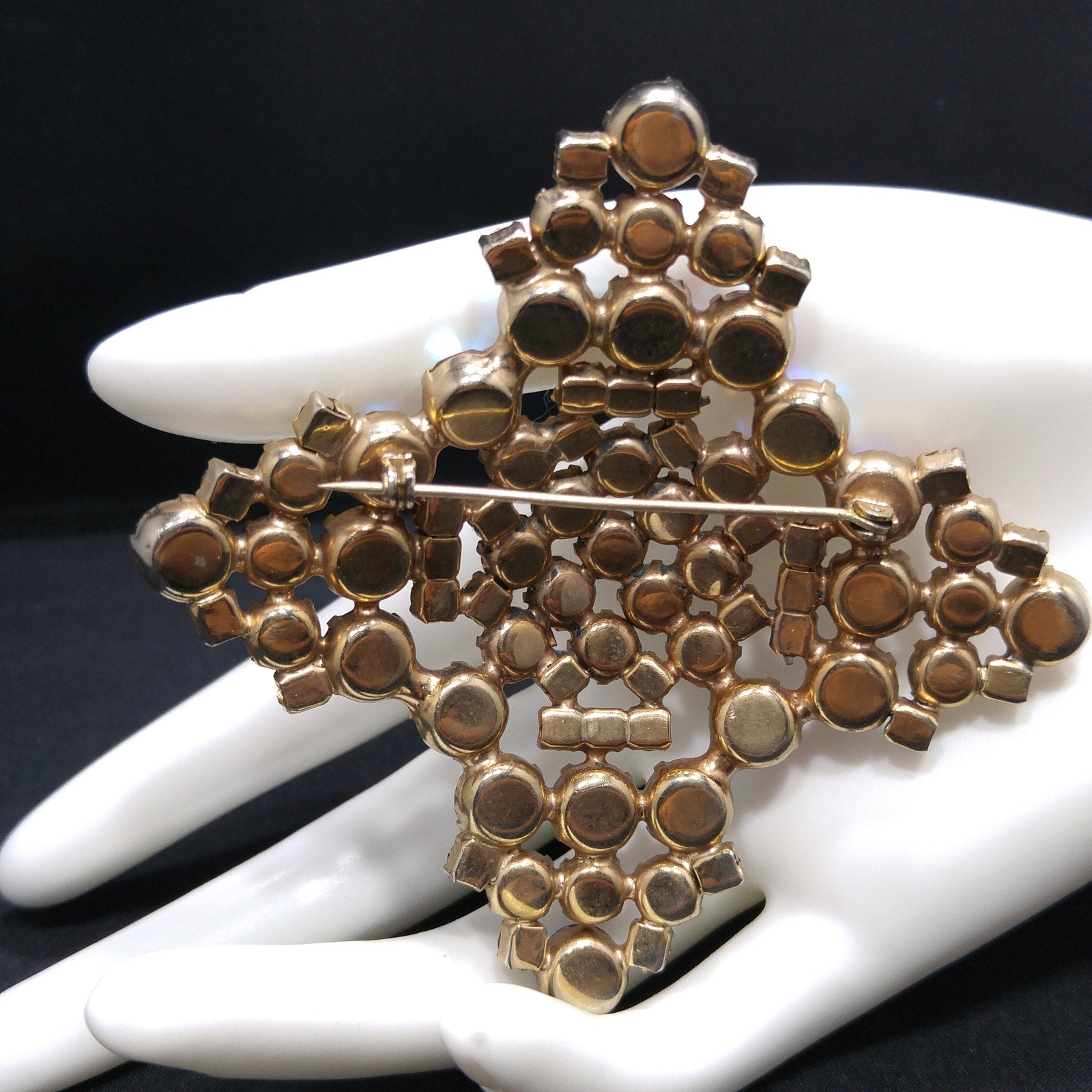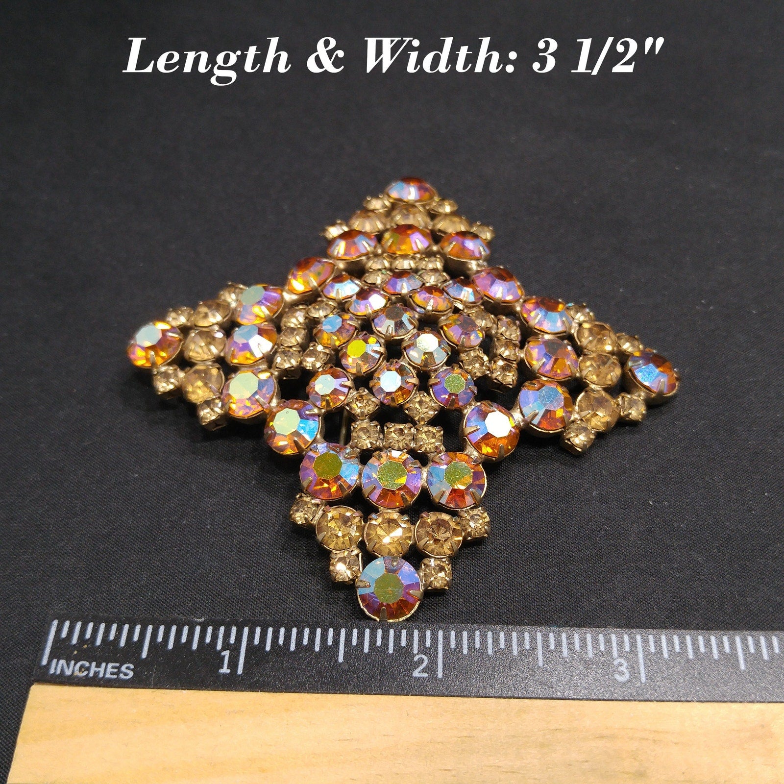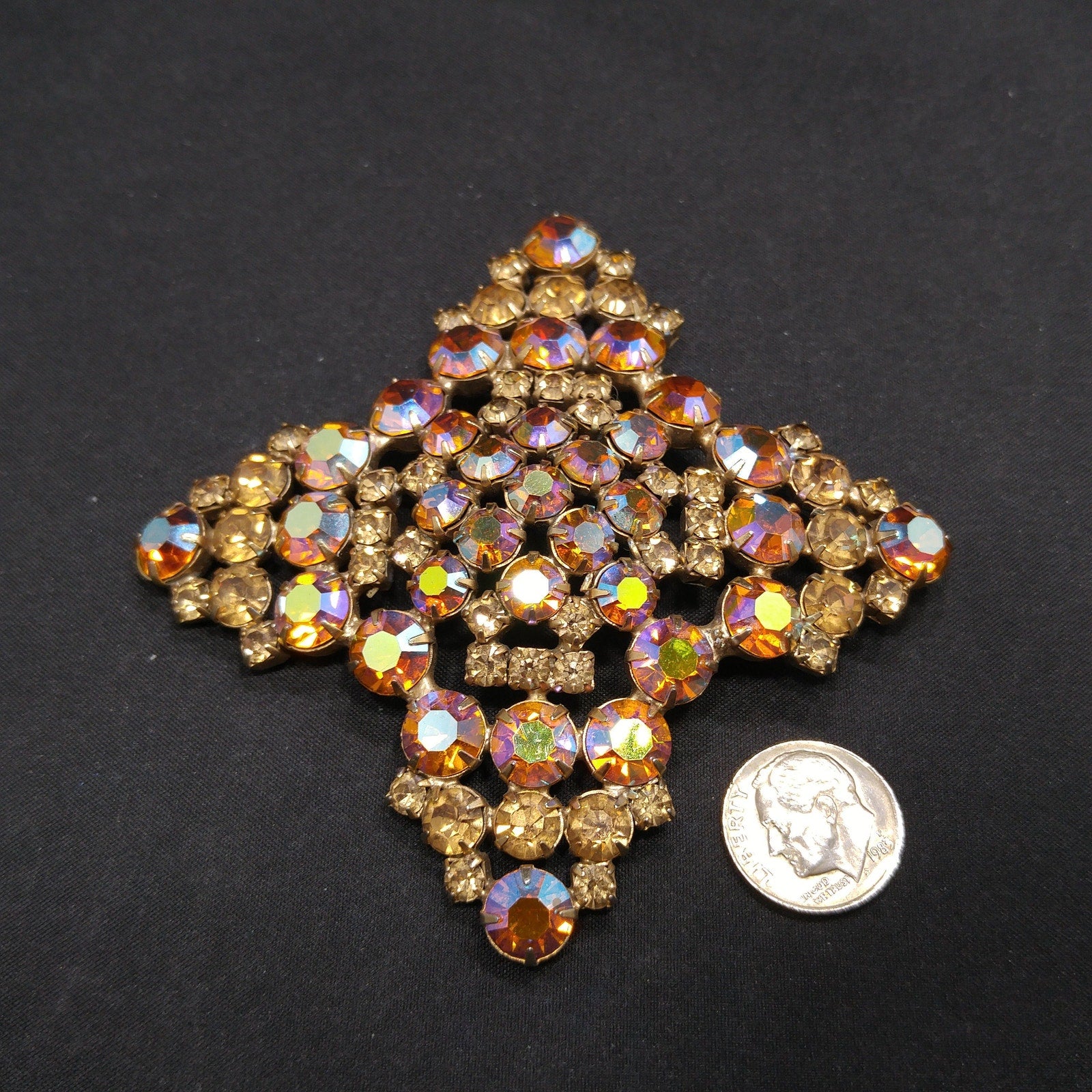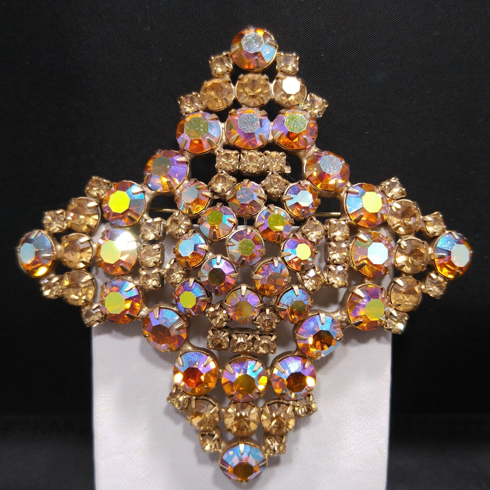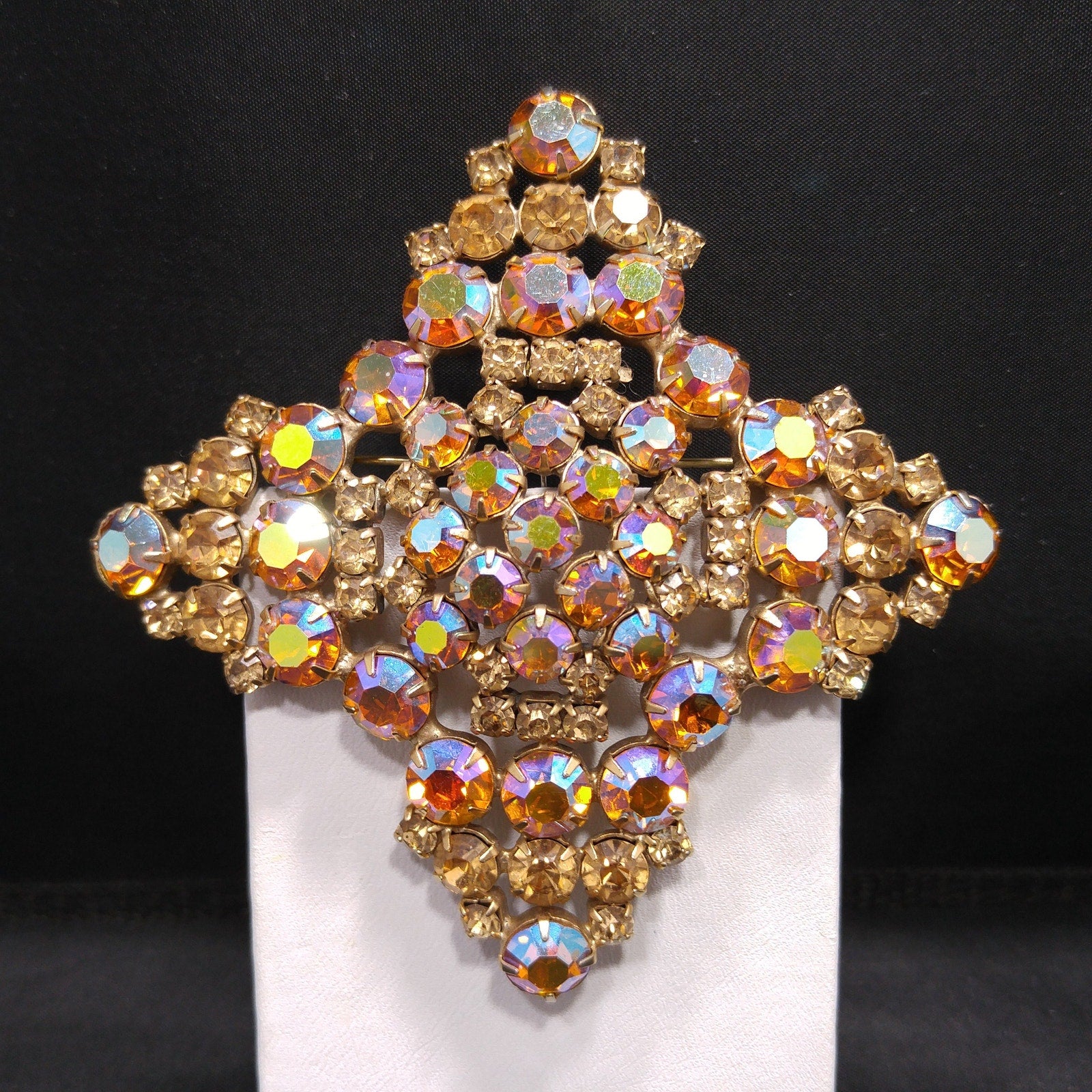 *Description: This is a gorgeous topaz glass aurora borealis very large brooch from the late 1950s to 1960s. The brooch is set on a gold plated backing and each rhinestone is prong set. Some of the rhinestones are light topaz glass and others are aurora borealis topaz glass with reflections of blue, pink and silver. The brooch is very large at 3 1/2 Inches across in width and length. It has four points and is slightly domed. It is full of reflection and light and is a beautiful mid-century brooch. This would be a great addition to your vintage jewelry collection or make a great vintage gift!