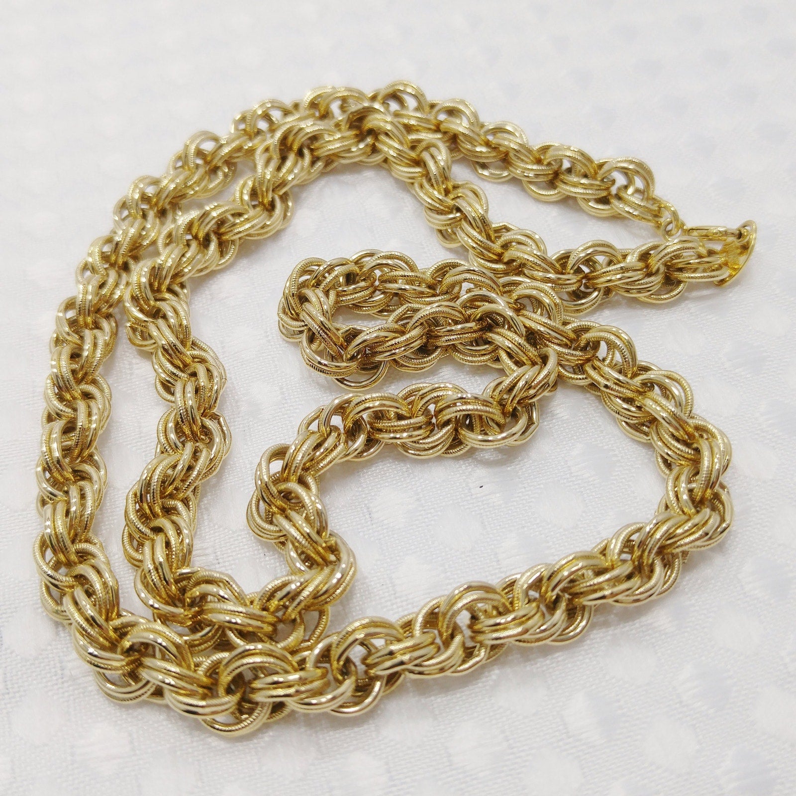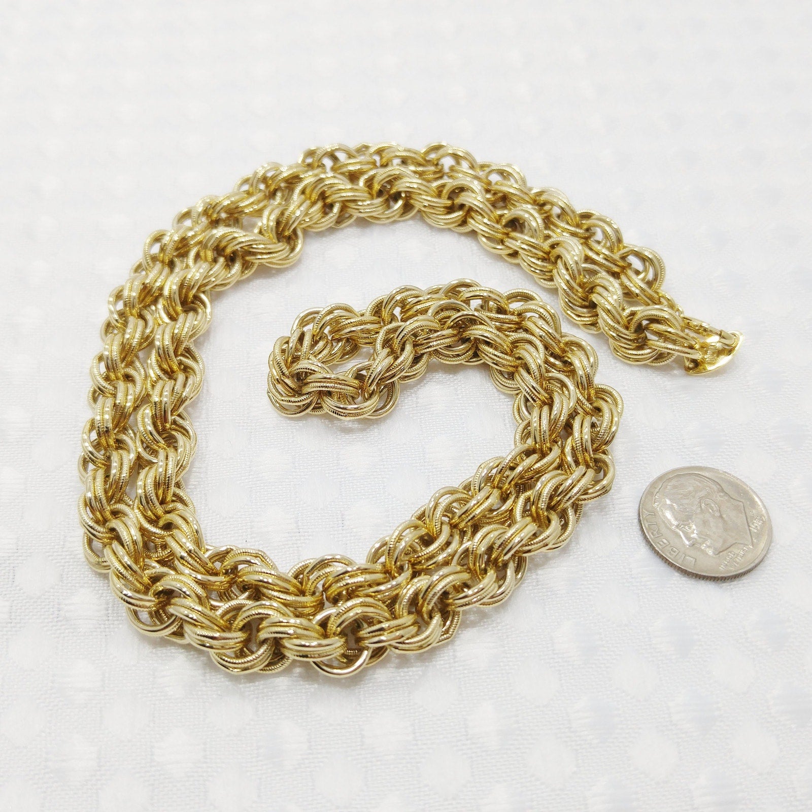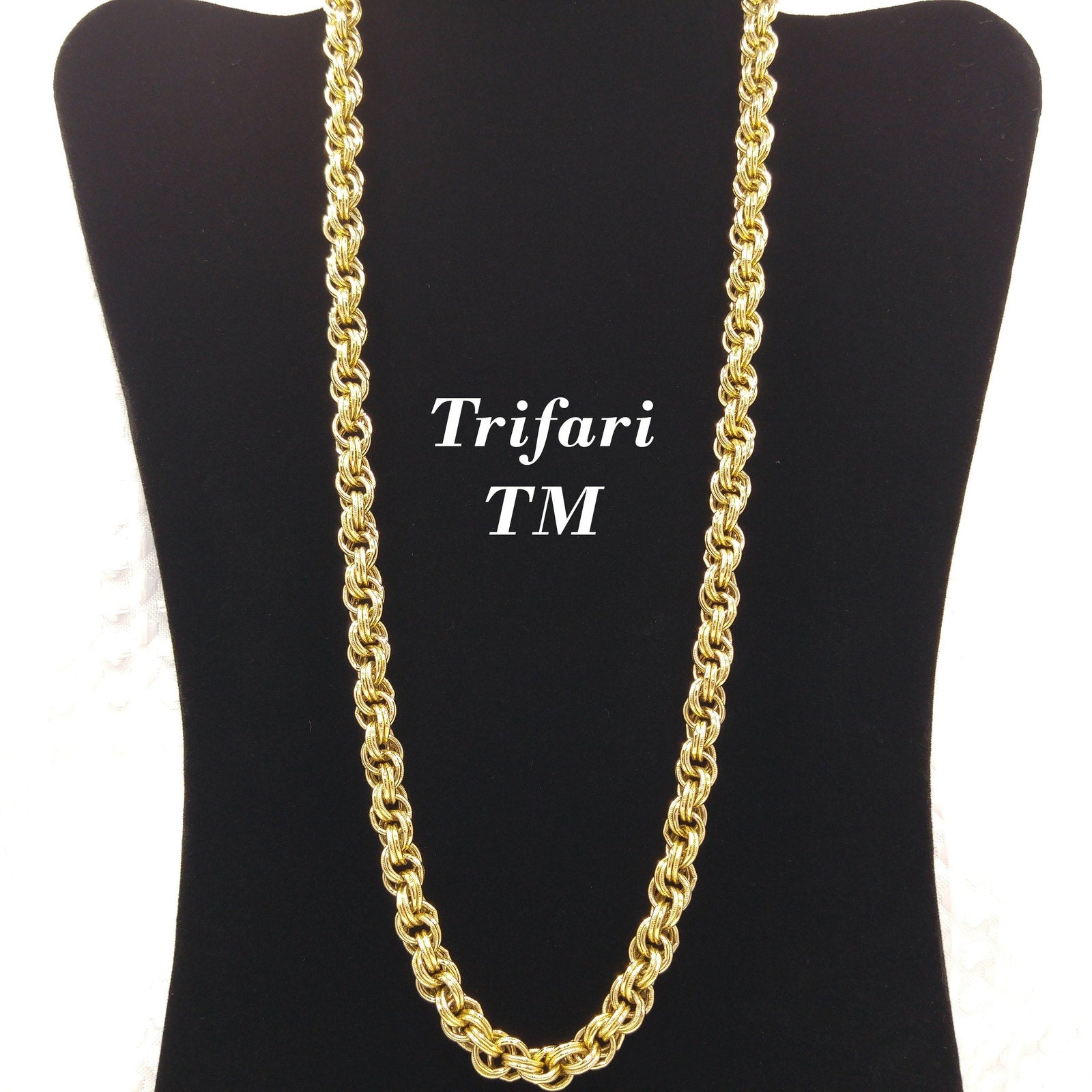 *Description: This is a Trifari TM wide rolo rope chain, gold plated necklace from the late 1980s to 1990s. The rope chain is made using smooth and textured edge loops woven together to form a wide rope. This necklace is stamped TRIFARI TM on the clasp. The clasp is a large spring ring and is easy to open and close. The width of this chain is 8mm and the length is 24 inches. This rope chain necklace would look great for years to come. This would be a great addition to your vintage jewelry collection or make a great vintage gift!