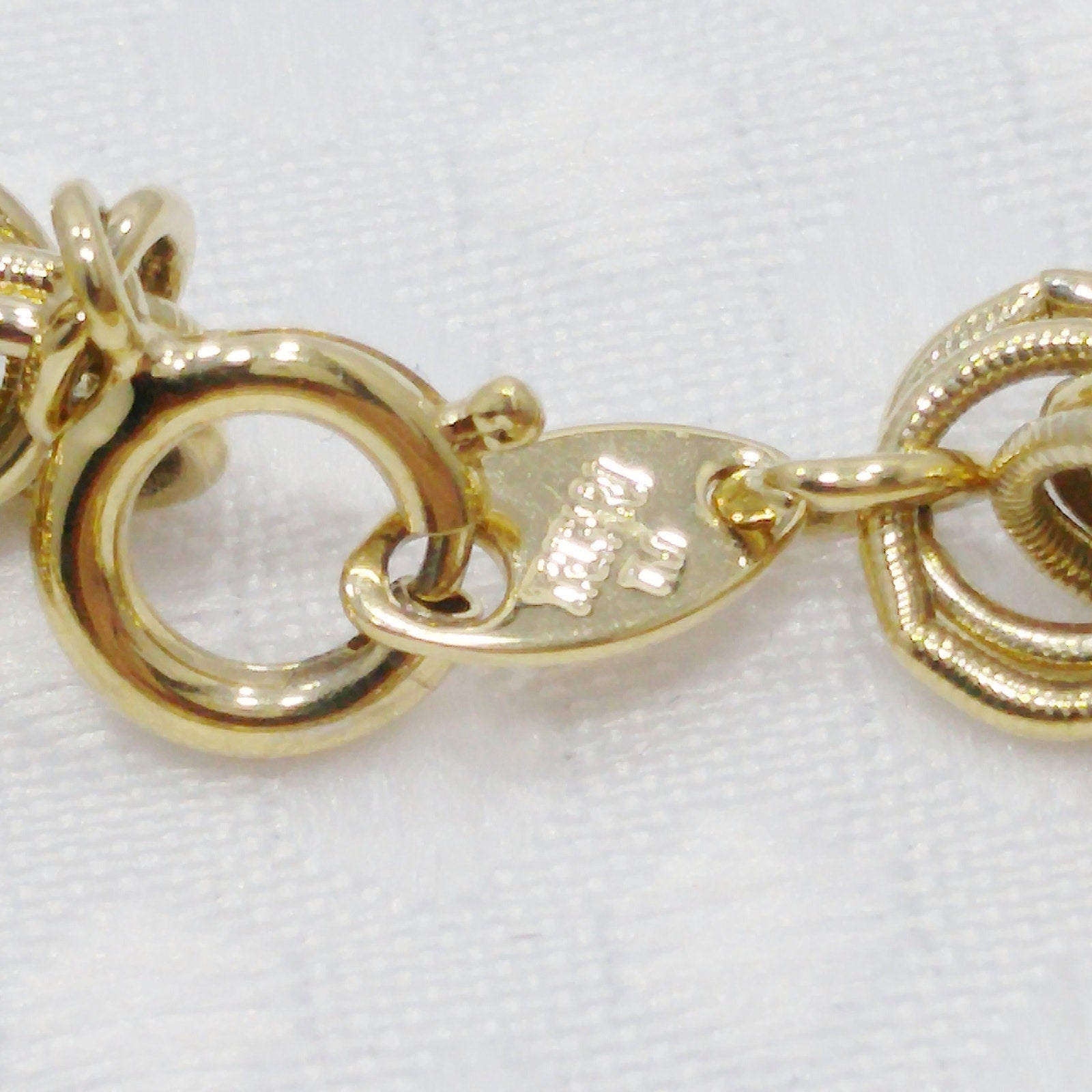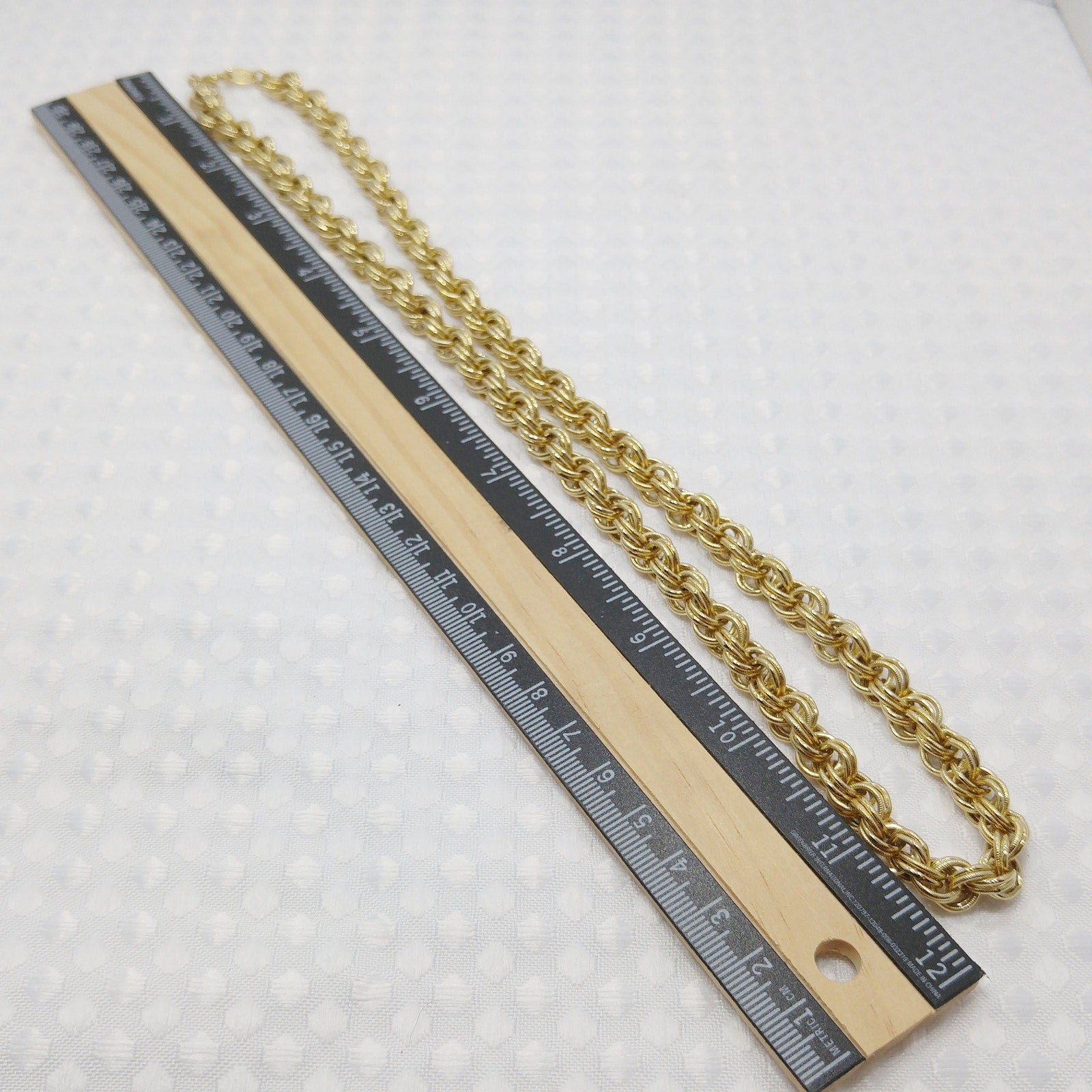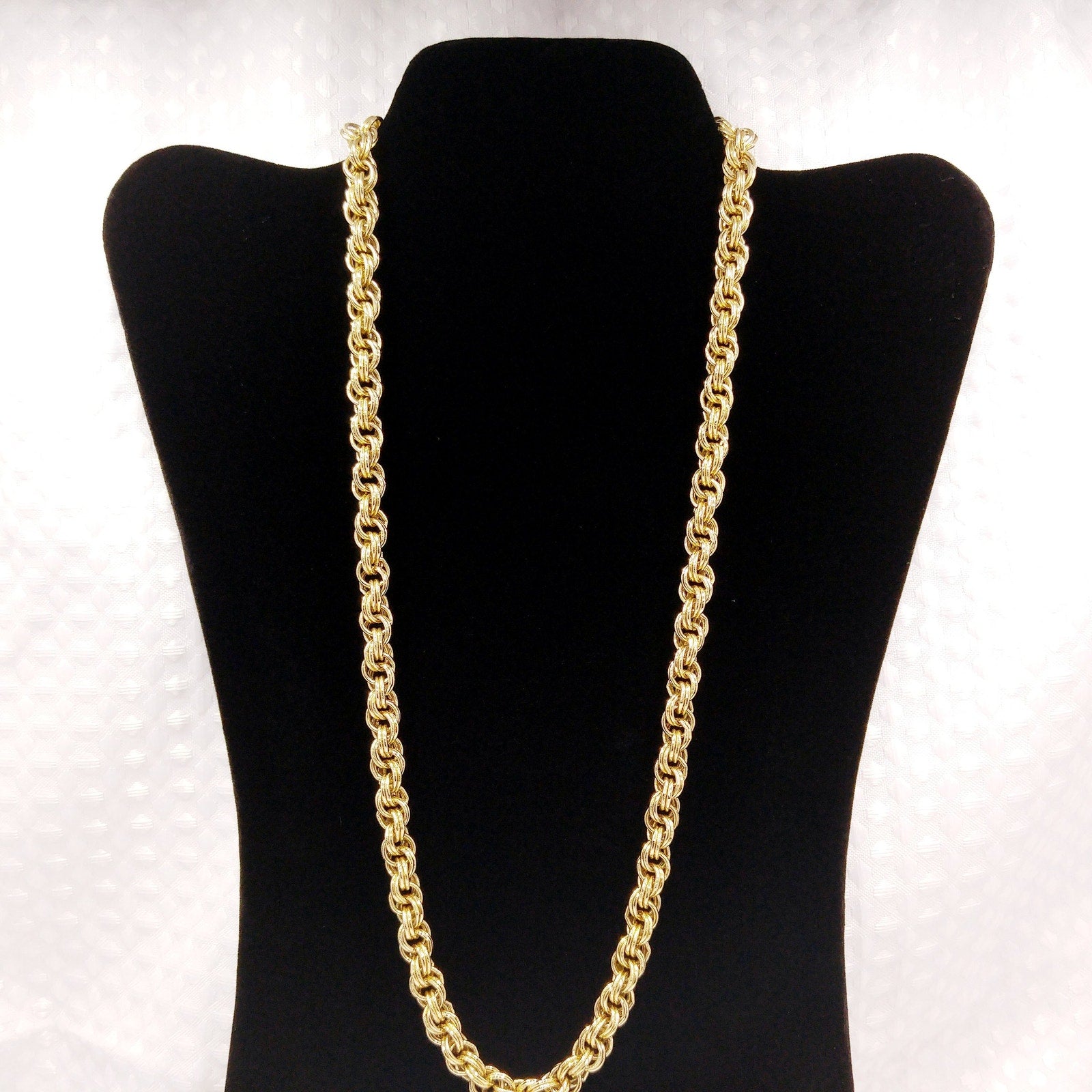 *Description: This is a Trifari TM wide rolo rope chain, gold plated necklace from the late 1980s to 1990s. The rope chain is made using smooth and textured edge loops woven together to form a wide rope. This necklace is stamped TRIFARI TM on the clasp. The clasp is a large spring ring and is easy to open and close. The width of this chain is 8mm and the length is 24 inches. This rope chain necklace would look great for years to come. This would be a great addition to your vintage jewelry collection or make a great vintage gift!