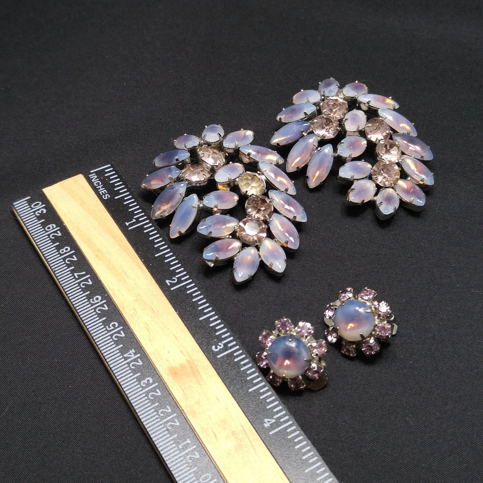 *Description: This is a beautiful twin set of faux opal cabochons and pink rhinestone brooches which are rhodium plated and have matching clip on earrings from the 1960s. The faux opal cabochons are accented with the pink lavender rhinestones in several sizes. The two brooches are styled alike and look beautiful side by side. They would look beautiful together with the earrings. This would be a great addition to your vintage jewelry collection or make a great vintage gift!