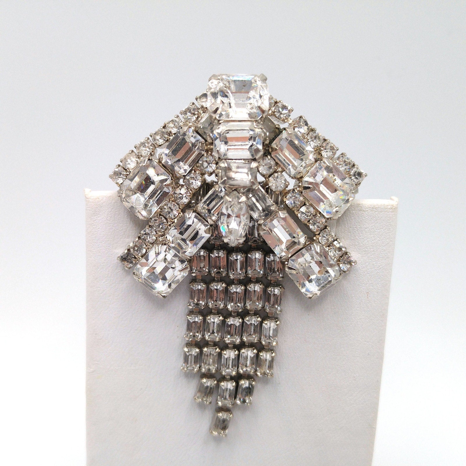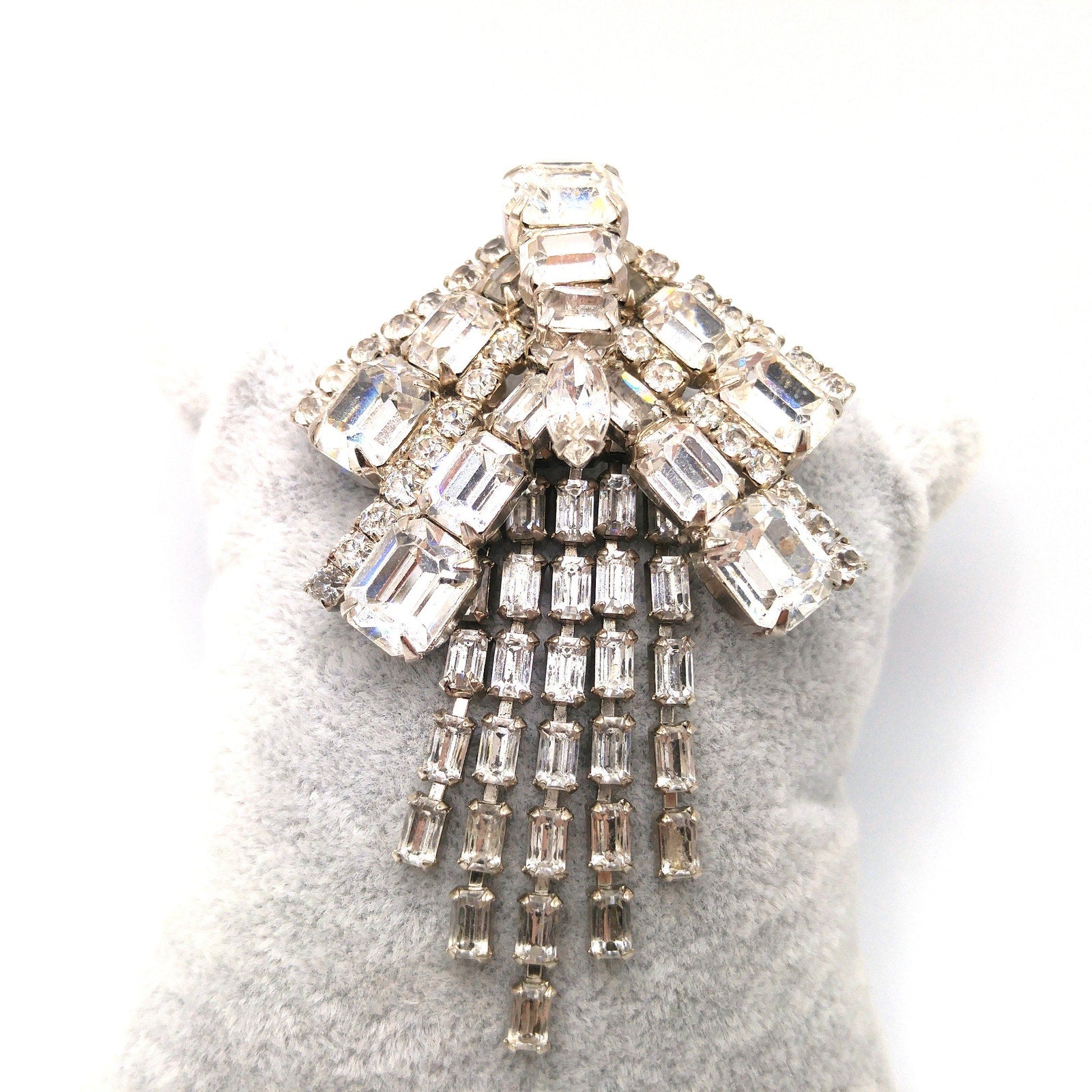 *Description: This is a beautiful clear rhinestone, rhodium plated, tassel brooch from the 1960s. This brooch is unsigned however I found the exact brooch signed by Kramer of New York and it was entitled the Dragonfly brooch. All stone are in place and it is a gorgeous brooch. This would be a great addition to your vintage jewelry collection or make a great vintage gift!