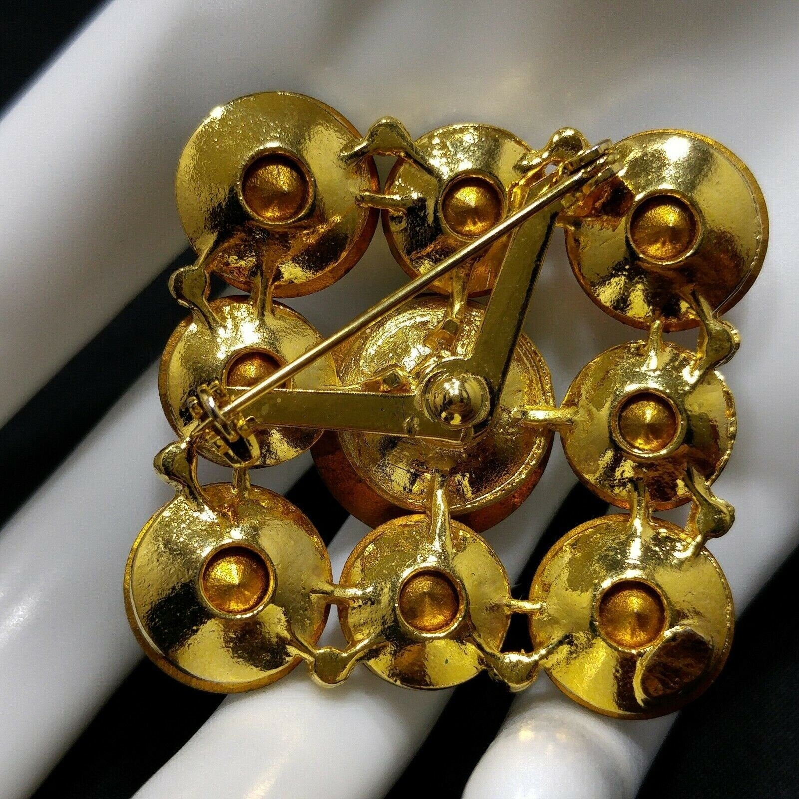 Although unsigned, this brooch matches documented Weiss examples in both construction and design — the raised cartouche area is present but appears as an over-stamped or puddled mark. The stones are prong set in a heavily gold-plated backing with a geometric open structure, typical of Weiss’s 1960s craftsmanship.