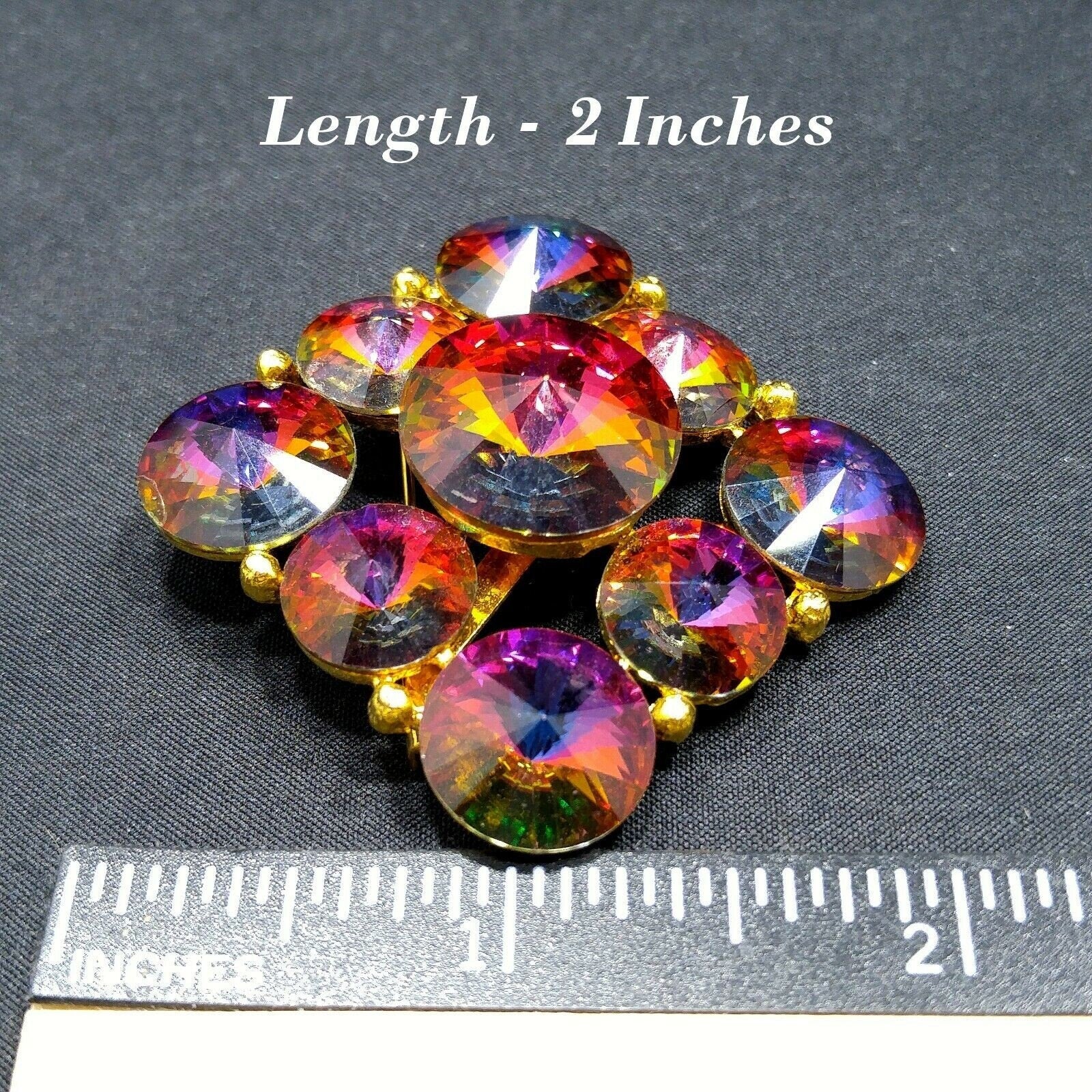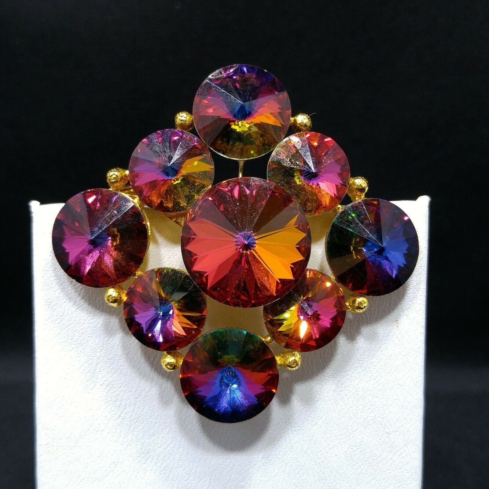 This breathtaking vintage rivoli rhinestone brooch is attributed to Weiss, dating from the 1960s. The design features brilliant multi-colored foil-backed rivoli rhinestones that shift through vivid hues of fuchsia, purple, red, blue, and green, often referred to as the Passion colorway. Each faceted rivoli stone reflects spectacular light, creating a kaleidoscopic effect that captures the essence of mid-century glamour.
