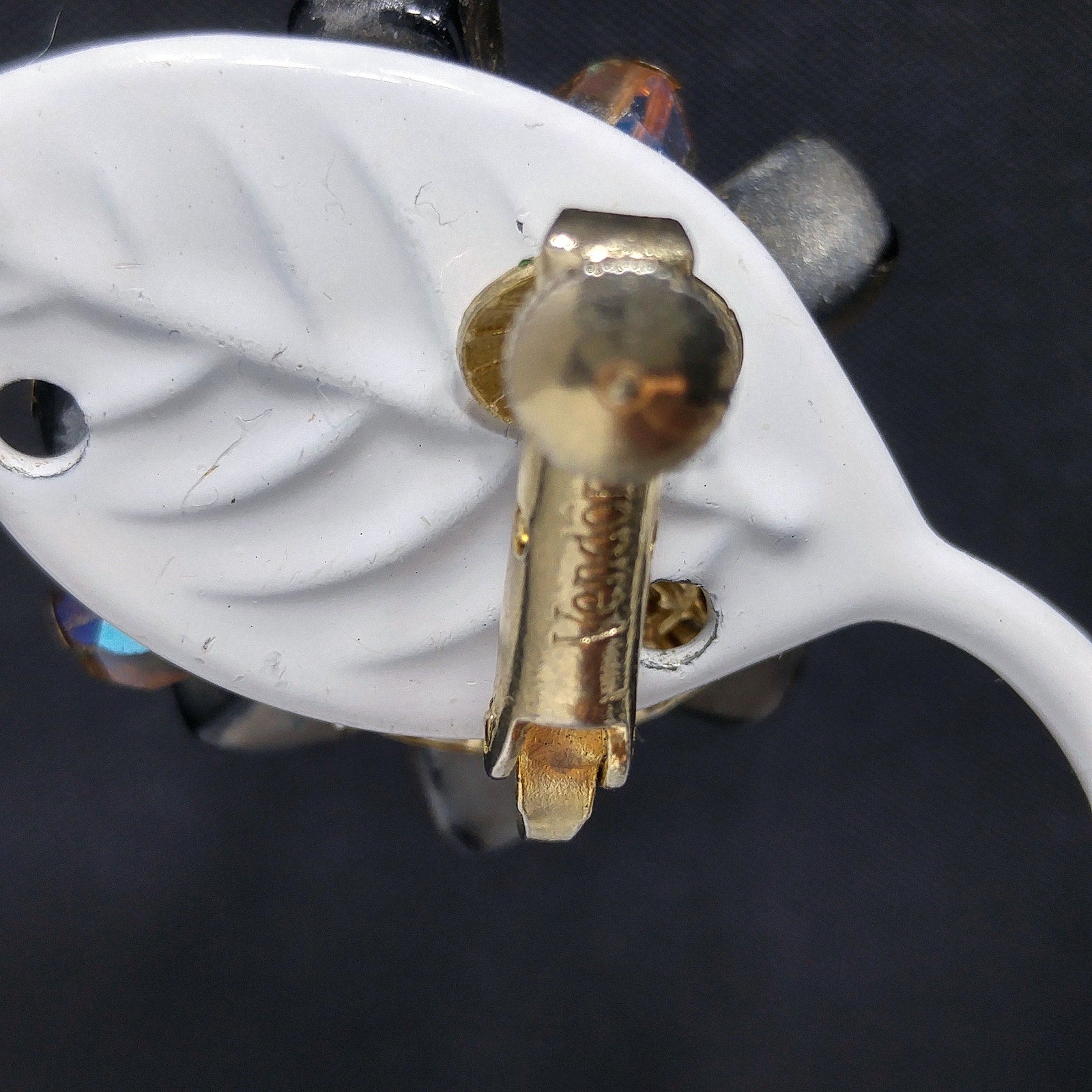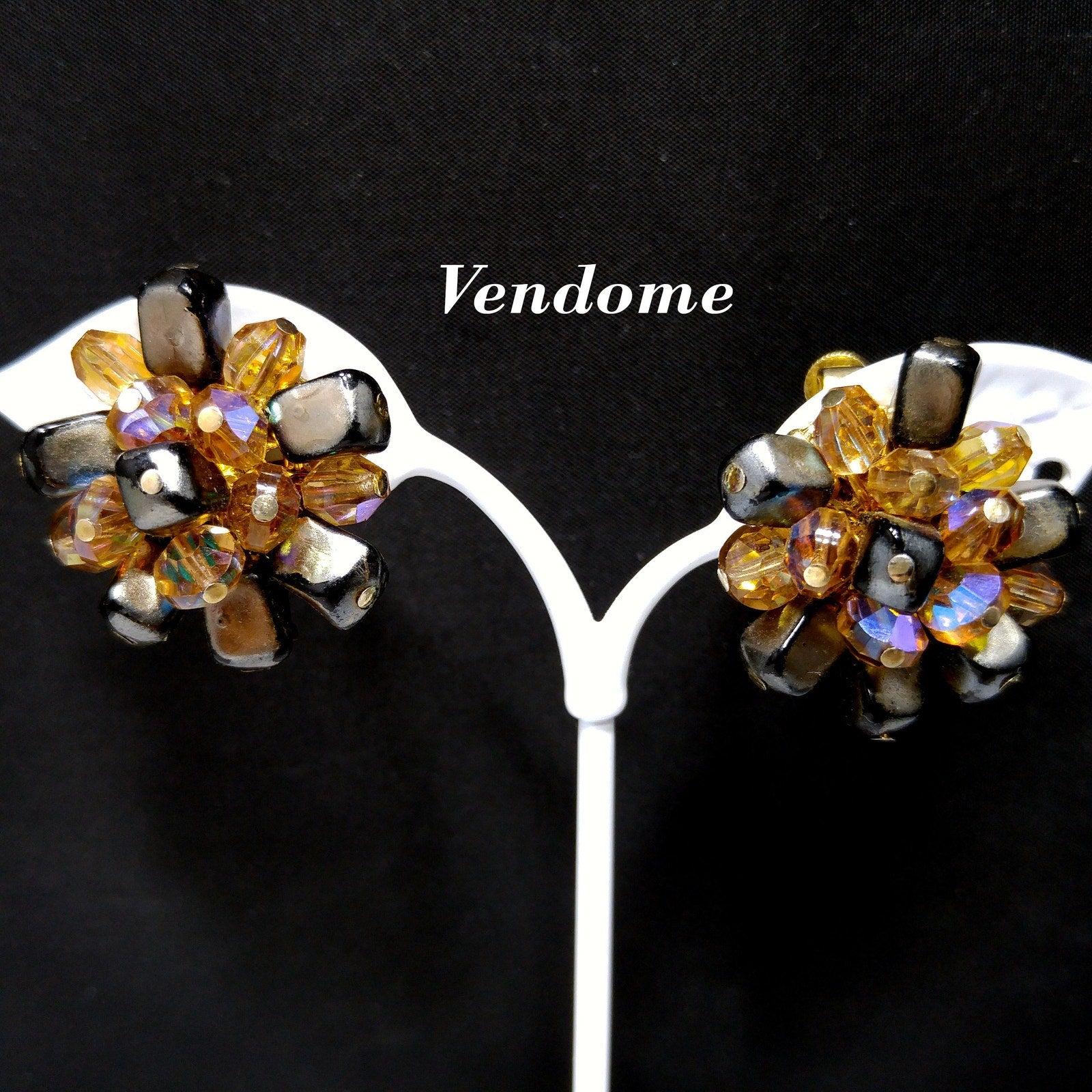 *Description: This is a beautiful pair of Vendome beaded earrings with brown iridescent beads and light topaz aurora borealis crystal beads on a filigree gold tone backing with clips stamped VENDOME on the back. This would be a great addition to your vintage jewelry collection or make a great vintage gift!