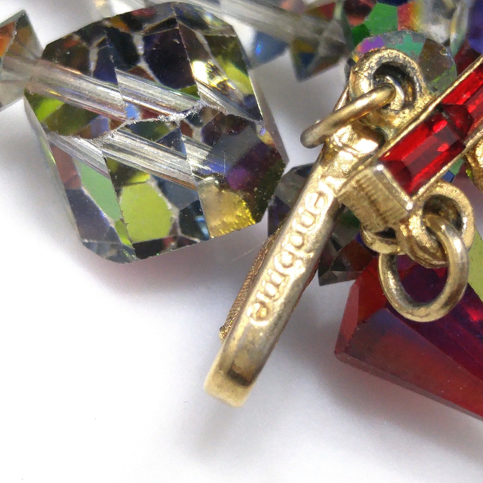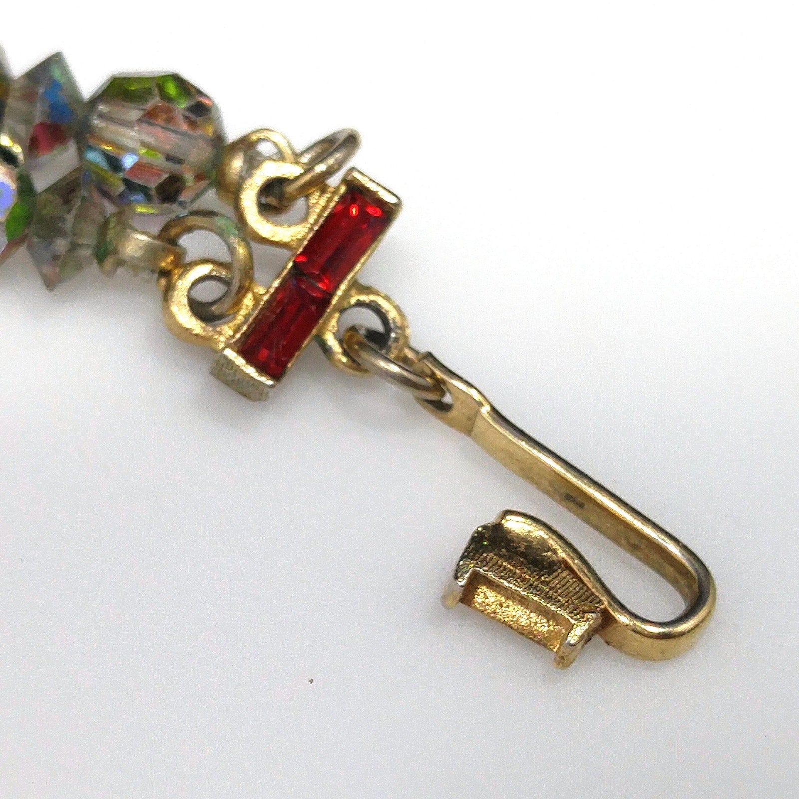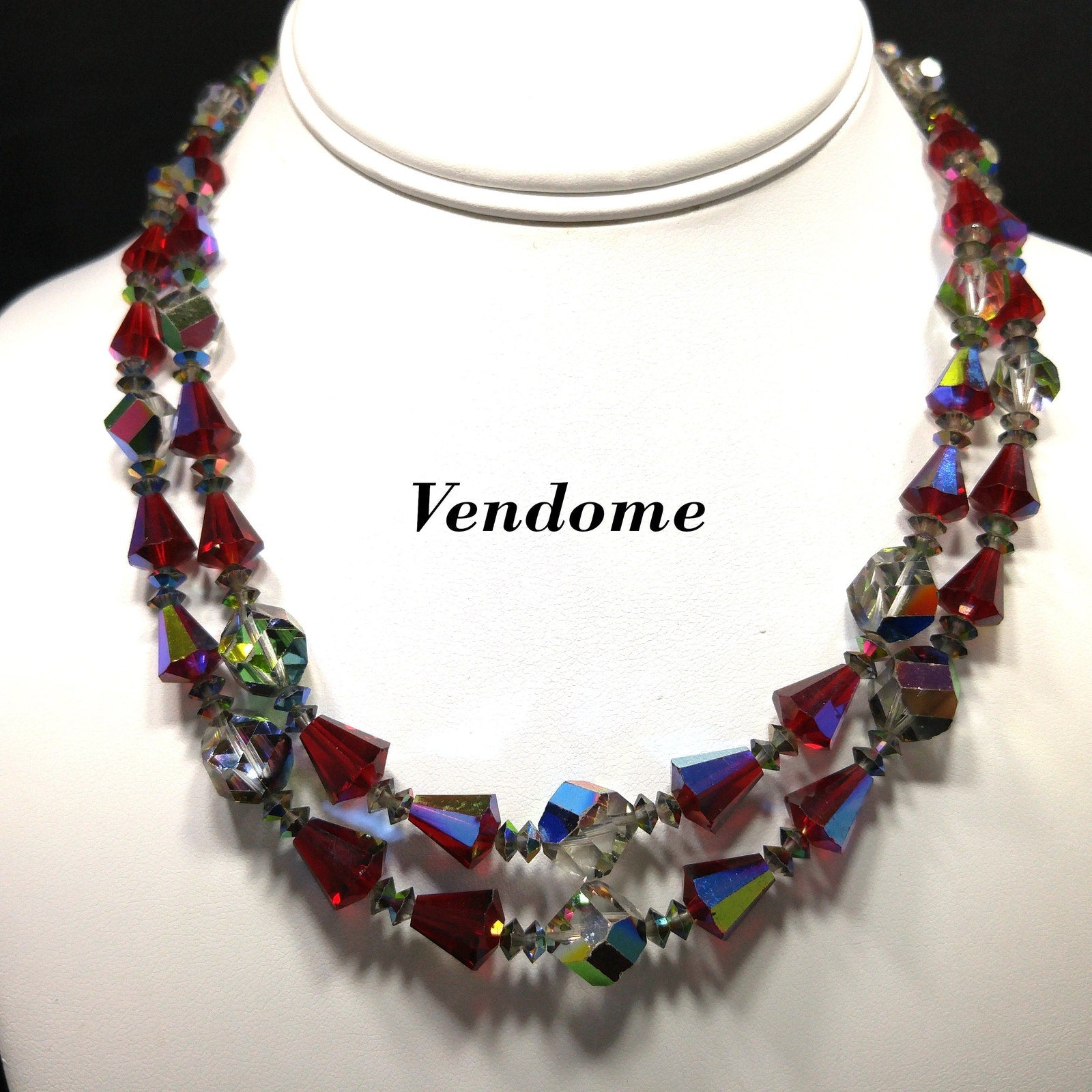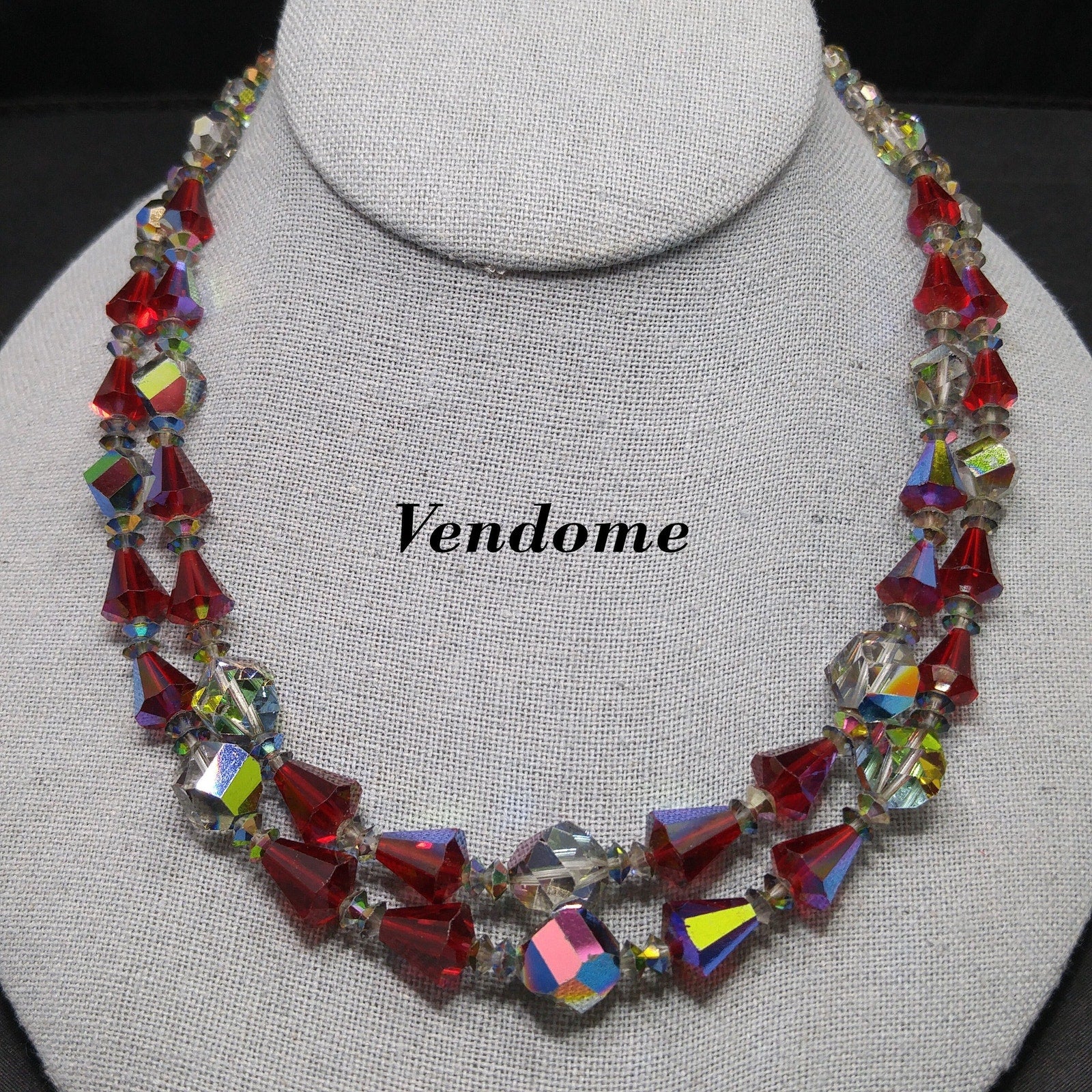 *Description: This is a beautiful red crystal Vendome necklace with clear and silver aurora borealis crystal beads in various sizes from the 1960s. There are two strands of crystals and the hallmark Vendome hook clasp and fob at the end of the extension chain. There are red baguette rhinestones in the two end bars. The tiny baguette rhinestone on the hook is missing. Please see photos for closeups. This does not show when worn as it just looks like a silver hook, however, please review prior to purchase. The necklace would look lovely for the holidays or a great January birthday gift for garnet color beads. This would be a great addition to your vintage jewelry collection or make a great vintage gift!
