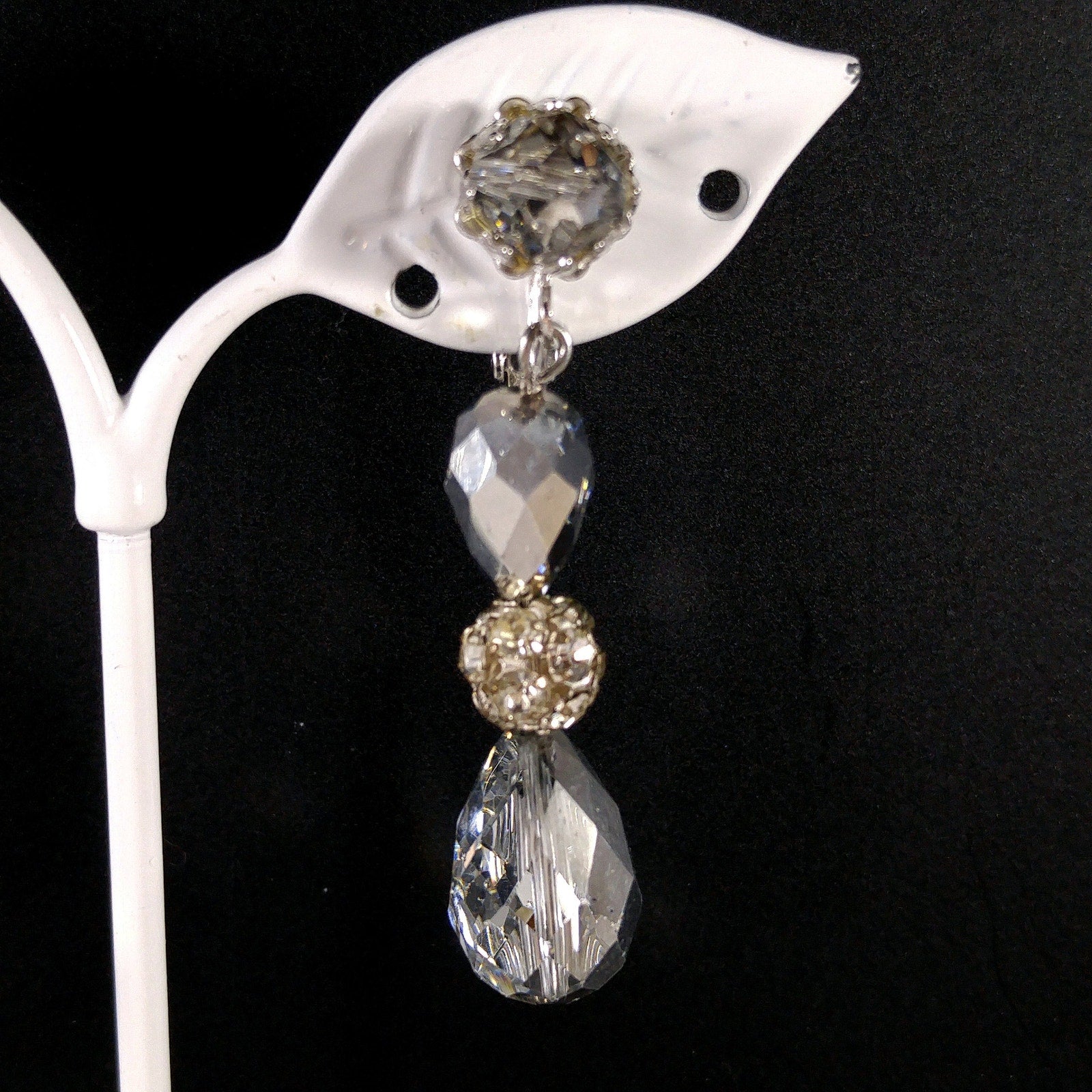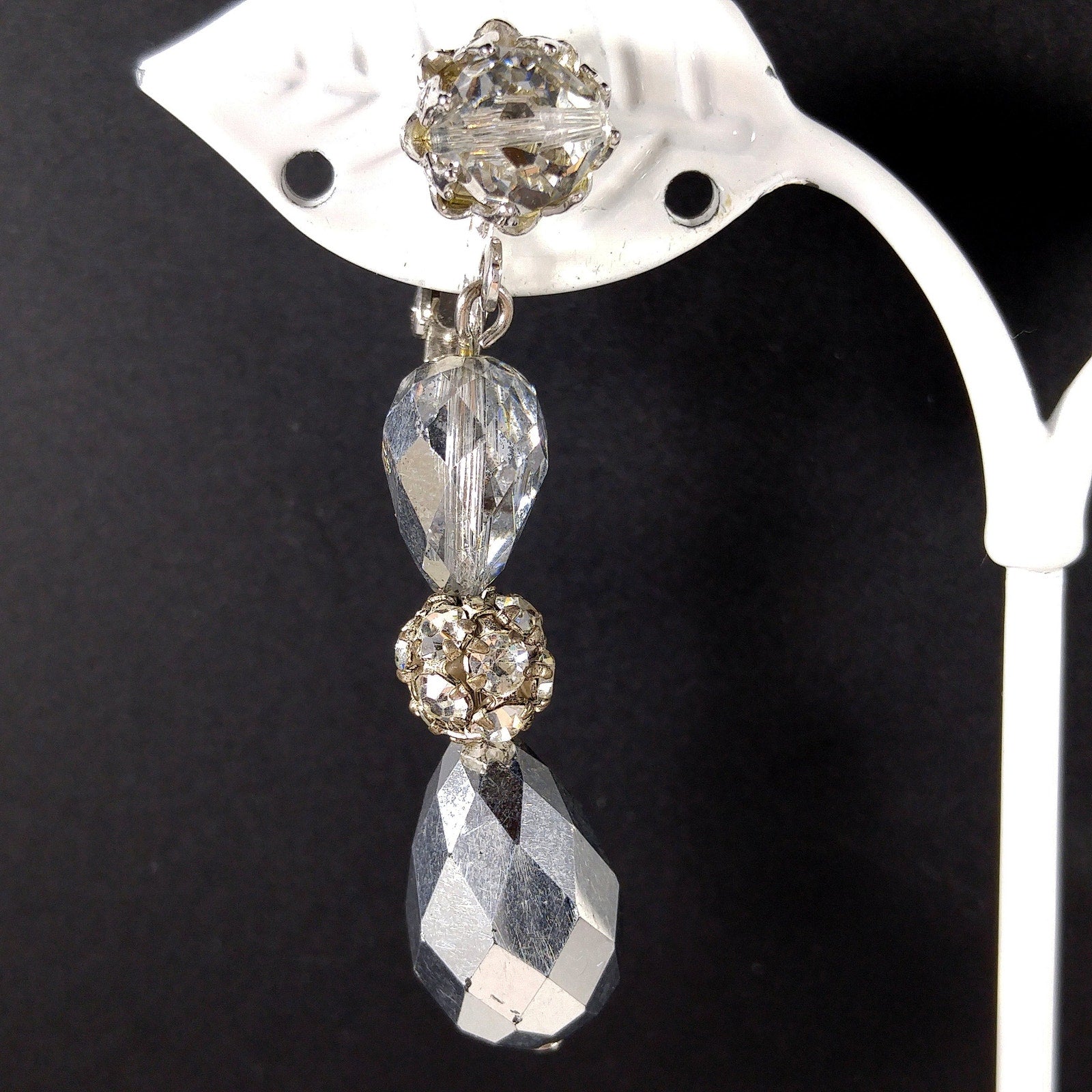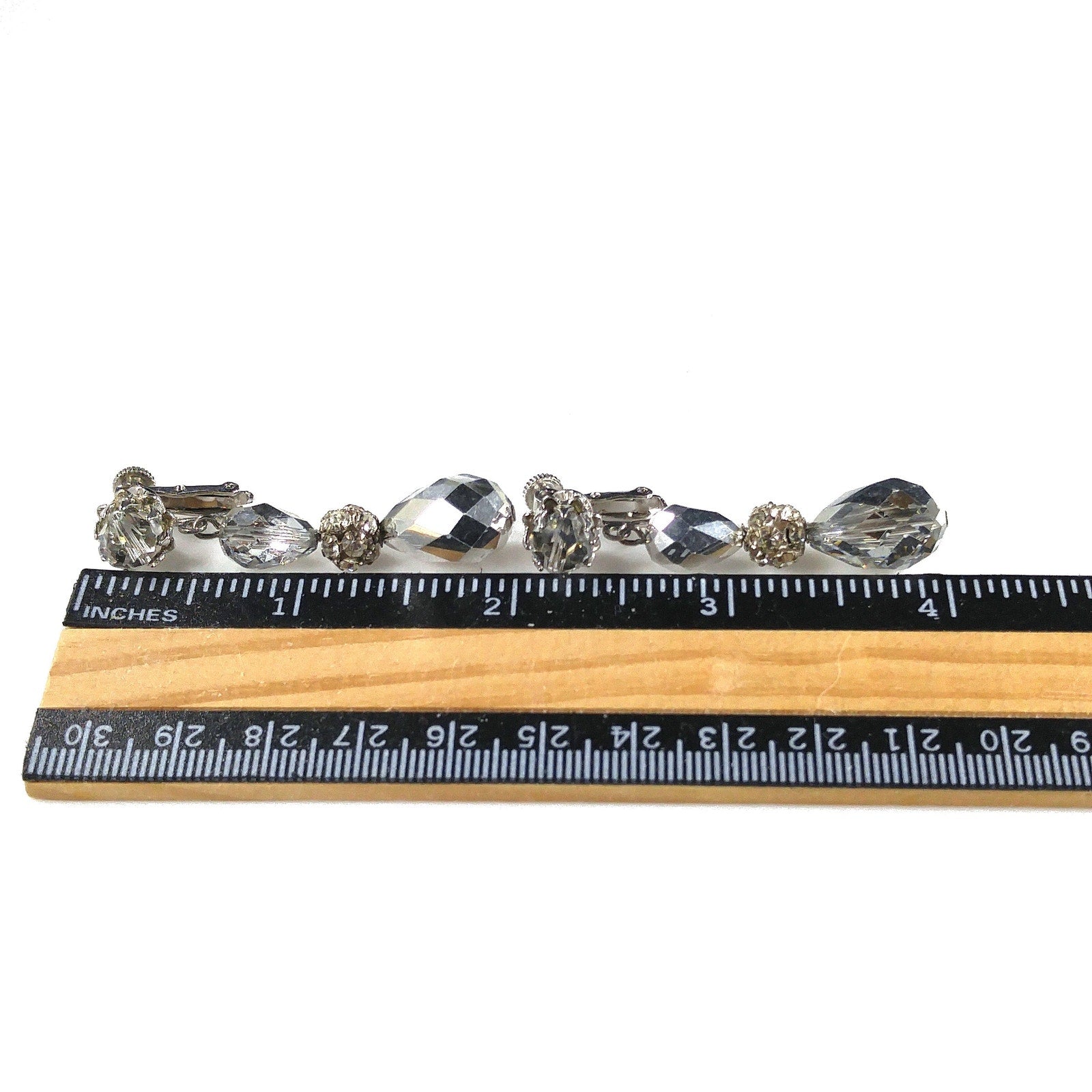 Vendome Silver Crystal Beaded Clip Earrings, Dangle Drop 2", 1960s Vintage Jewelry