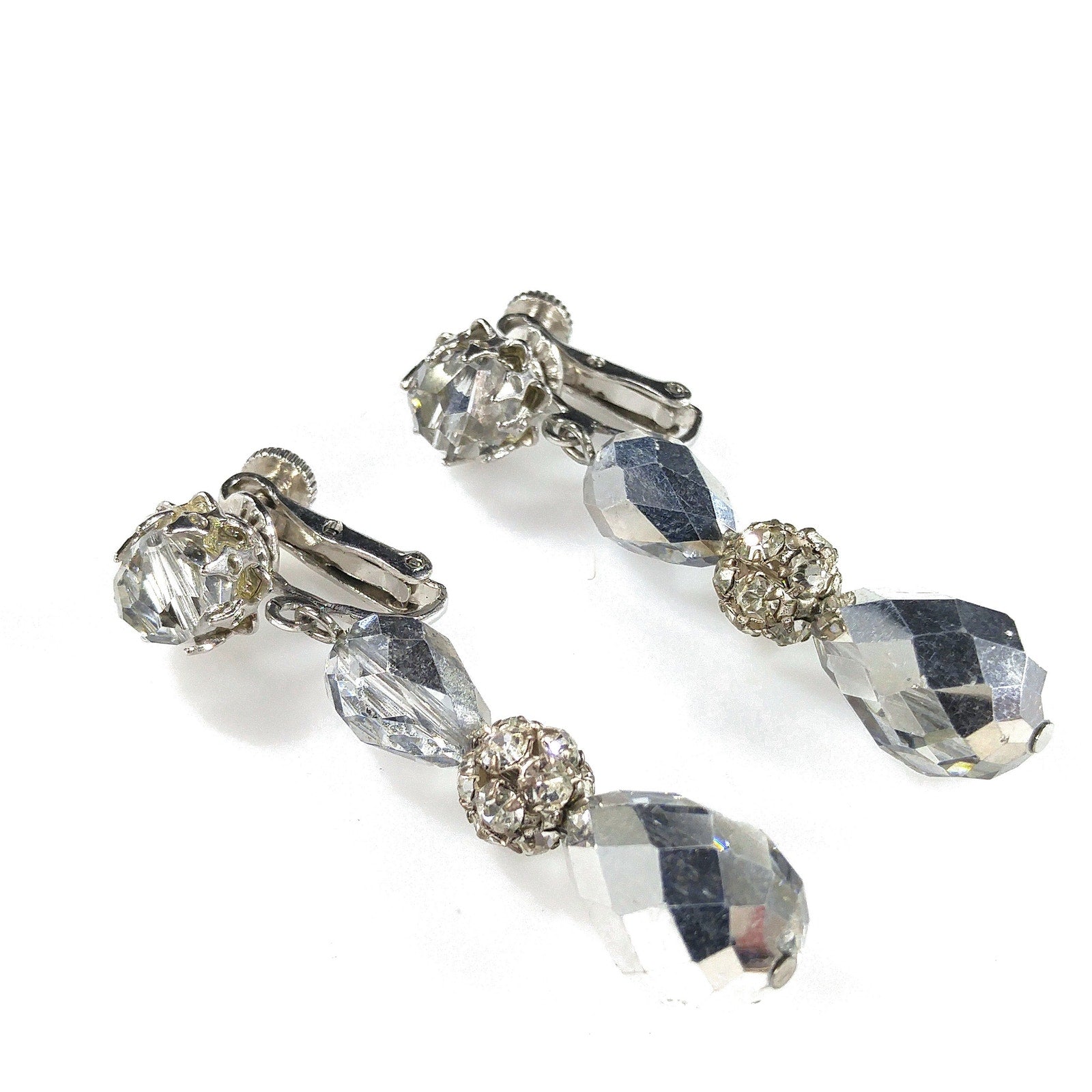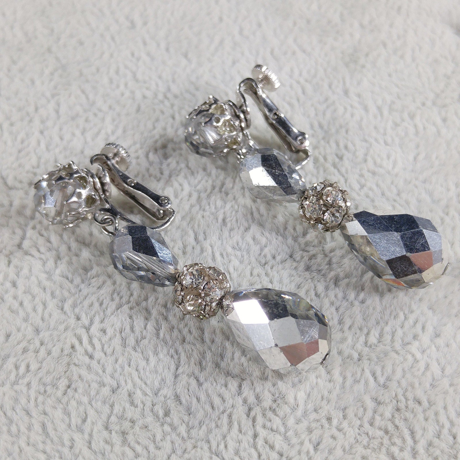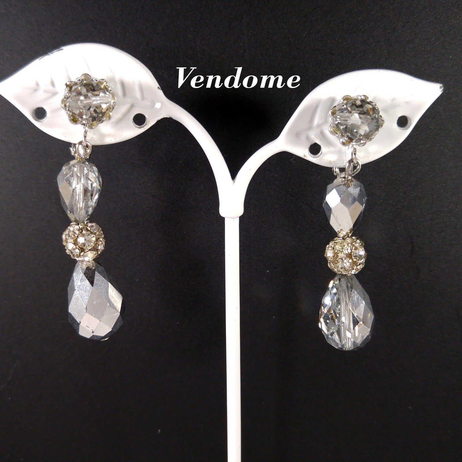 *Description: This is a beautiful pair of Vendome dangle crystal beaded earrings in silver metallic and clear rhinestones from the 1960s. Each pair of earrings has an adjustable clip clasp and dangling crystals are on a single drop from a prong set bead on the top. There is one pear shape metallic silver bead on each end with a smaller one reversed on the top of the drop. The center drop bead is made up of clear rhinestones on a ball shaped bead. The earrings are stamped VENDOME on the clasp. This would be a great addition to your vintage jewelry collection or make a great vintage gift!