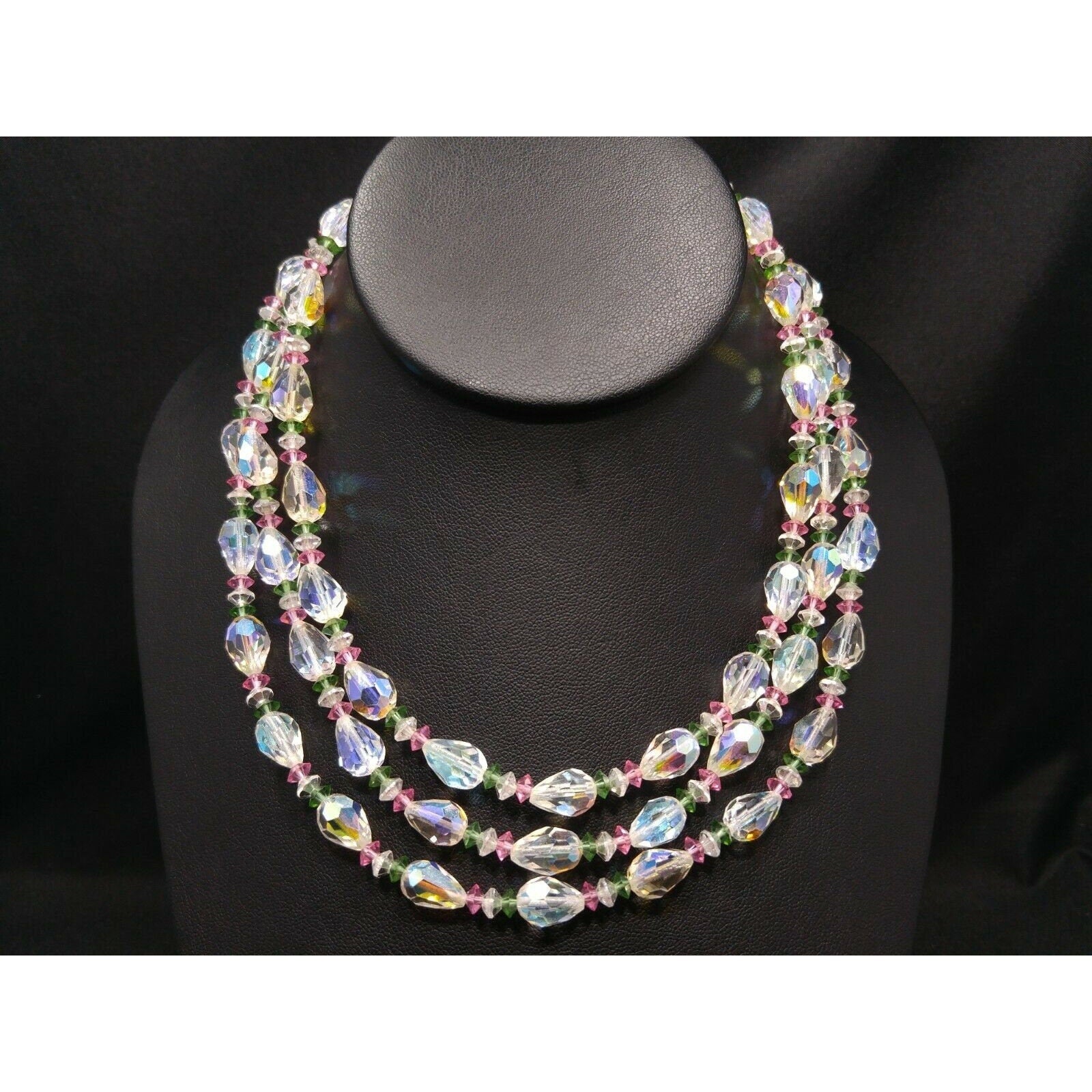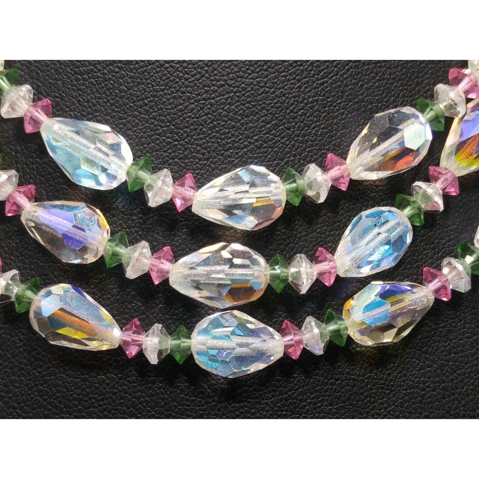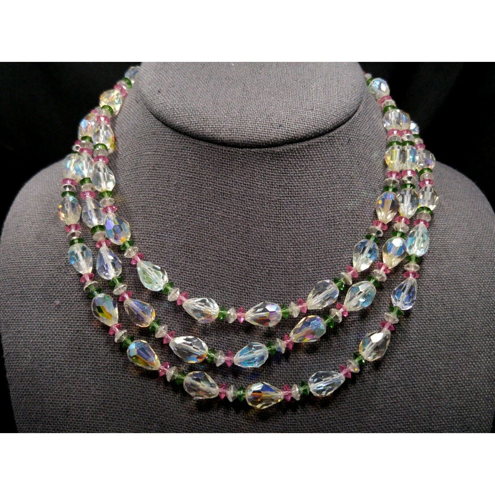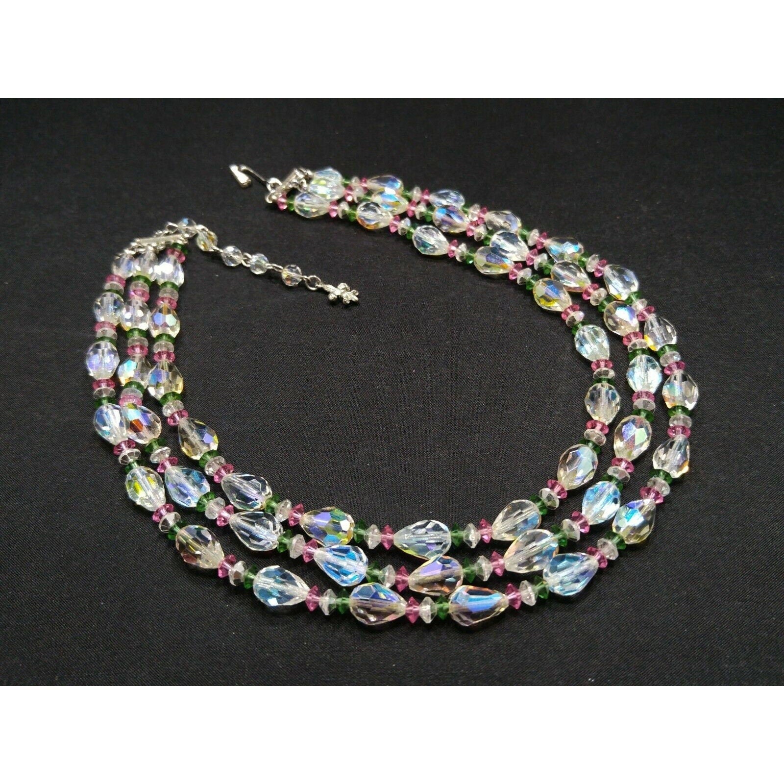 Vendome Triple Strand AB Crystal Necklace Pastel Pink Green Beads Vintage 1950s