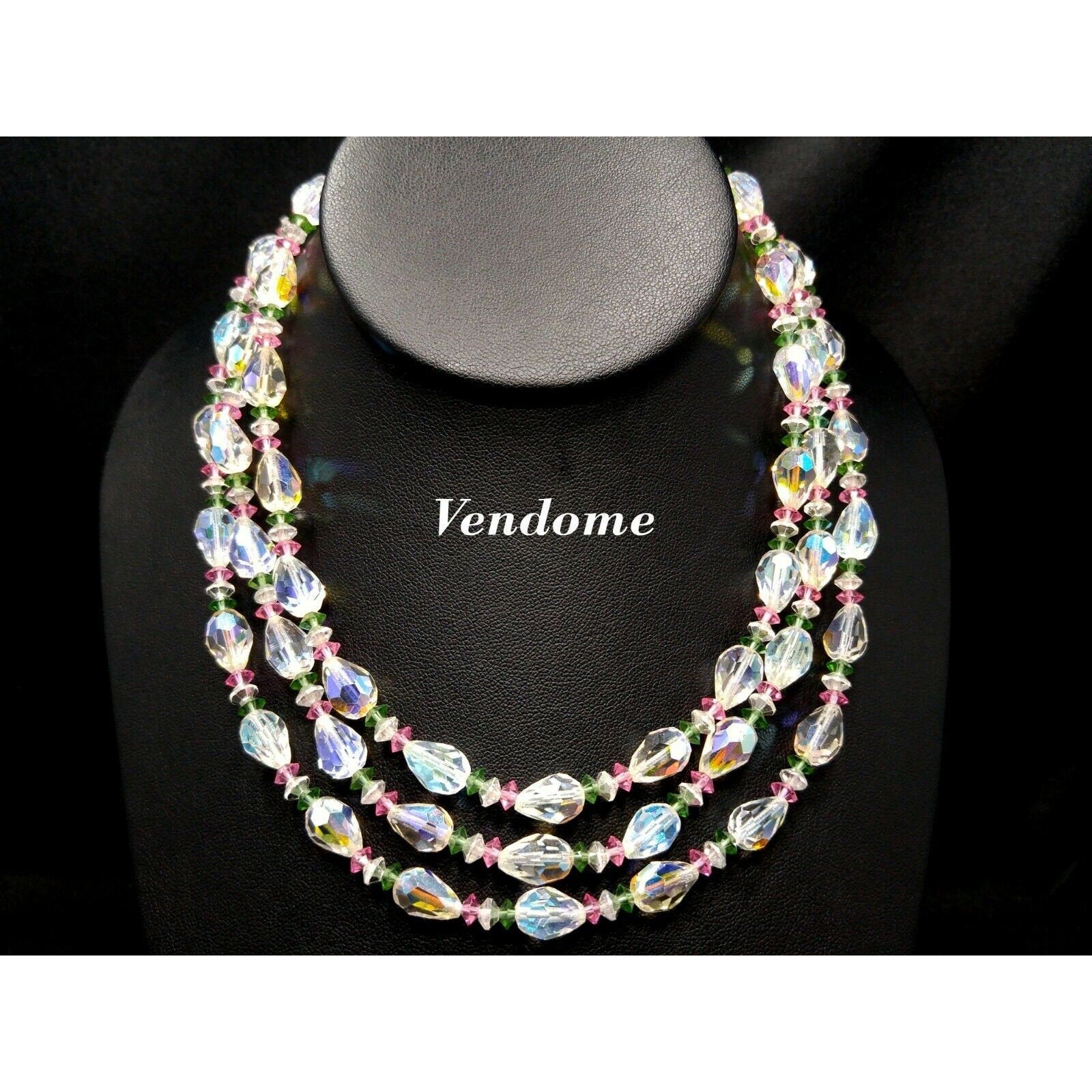 This is a stunning Vendome triple-strand crystal necklace featuring pastel aurora borealis beads in clear, pink, and green. The necklace showcases Vendome’s unmistakable quality, with beautifully faceted AB pear-shaped crystals (approx. 12mm) that shimmer with every movement.