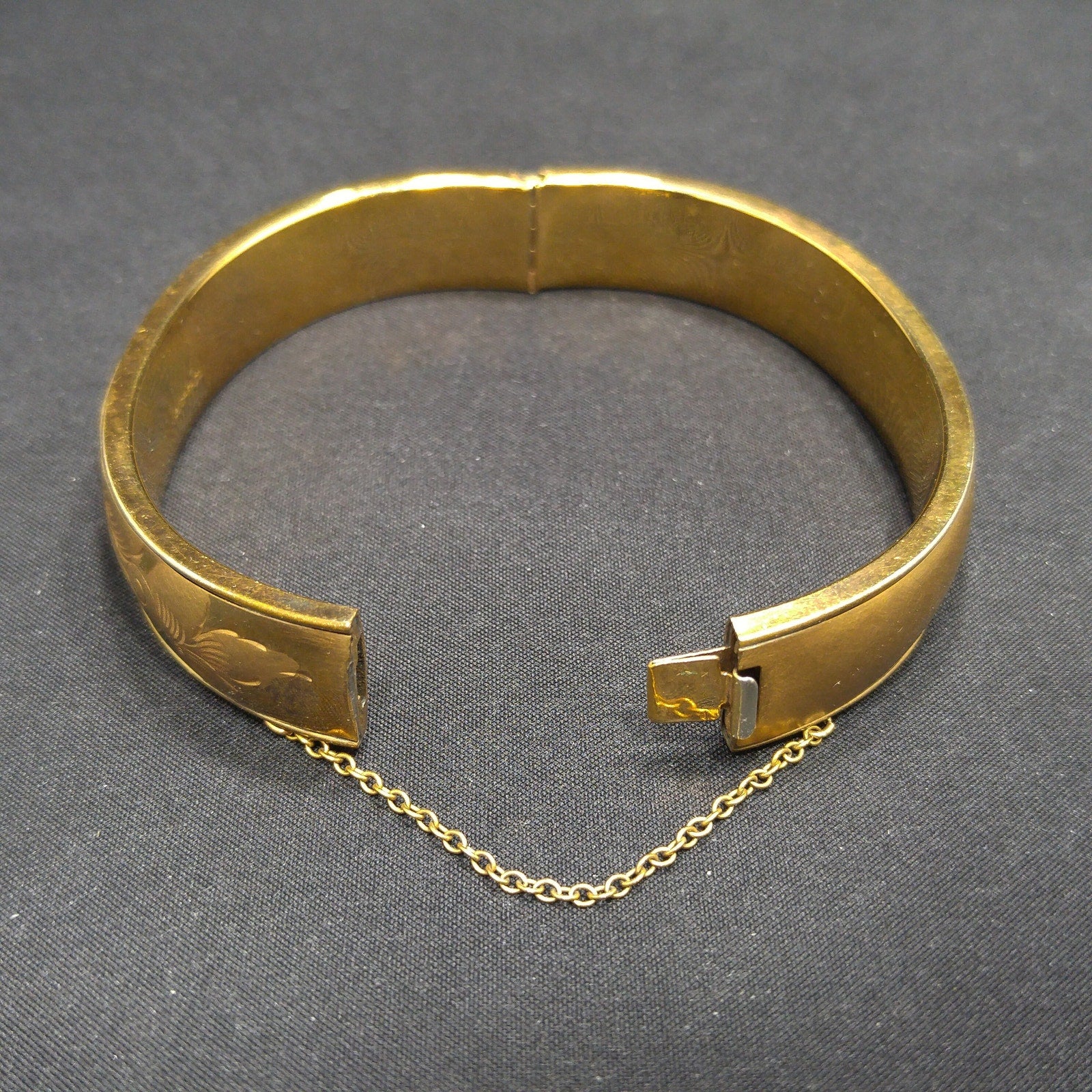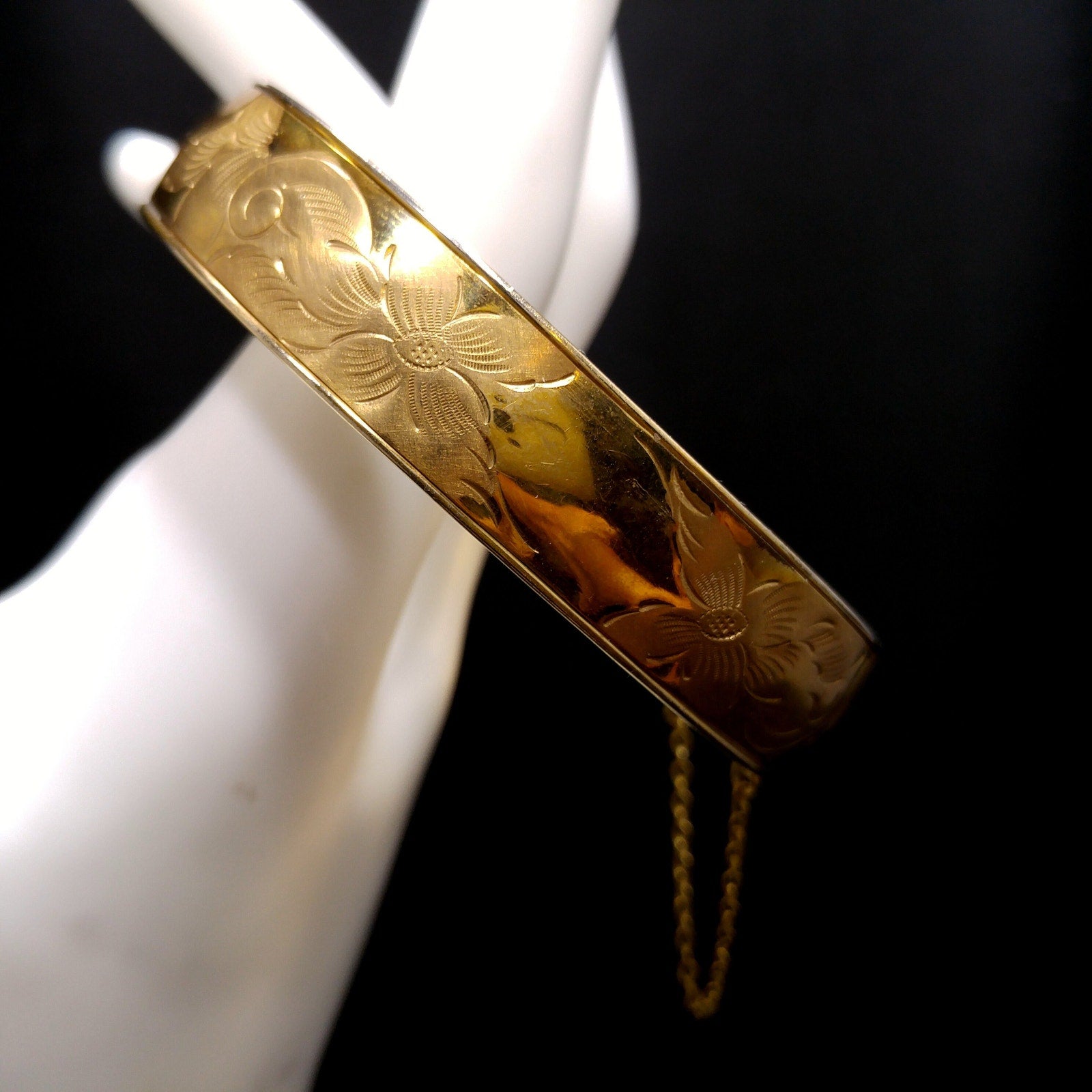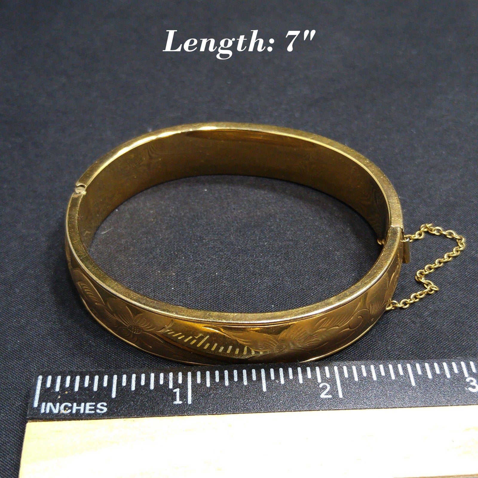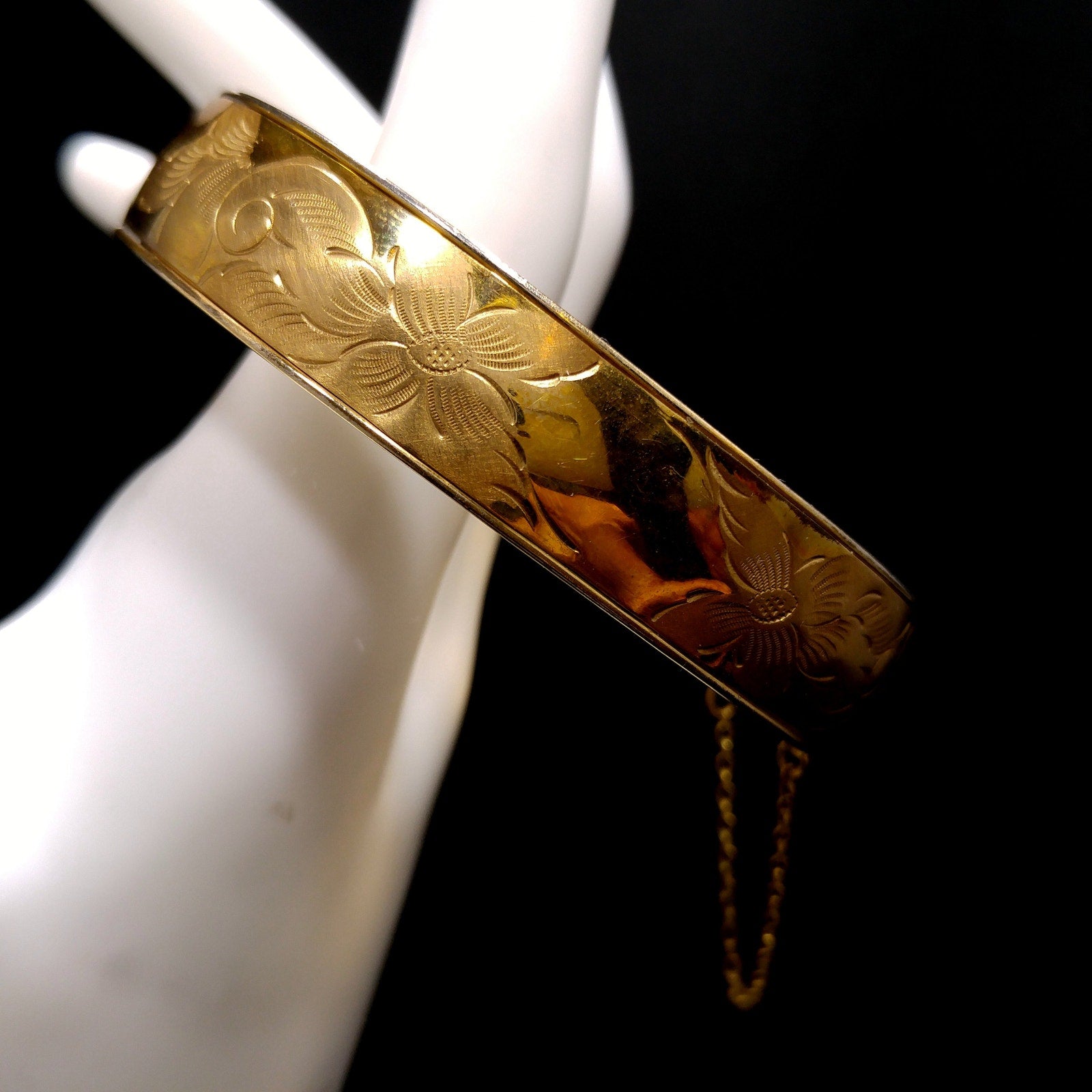 *Description: This is a beautiful 12K gold filled bracelet with embossed flowers on one side from the 1930s. The bracelet has a hinge and push clasp with an added safety chain. The bracelet is 7 inches around the inside and is 1/2 inch wide. FISHEL, NESSLER & CO. of New York, NY began their company in approximately 1885 and were in business until at least 1936. So this bracelet could be an antique, rather than vintage. This would be a great addition to your vintage jewelry collection or make a great vintage gift!
