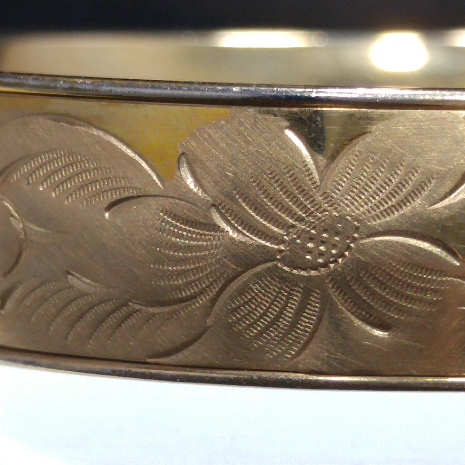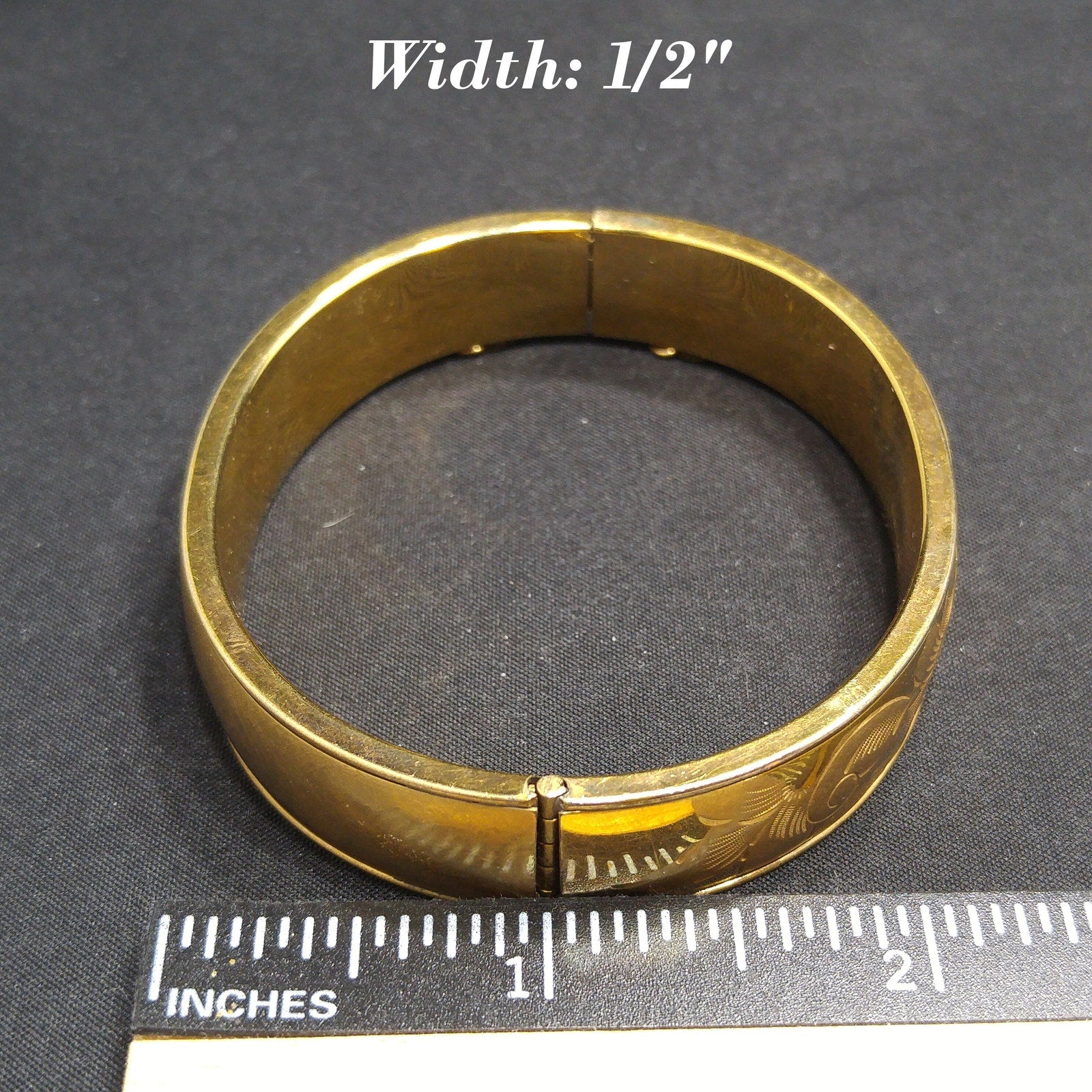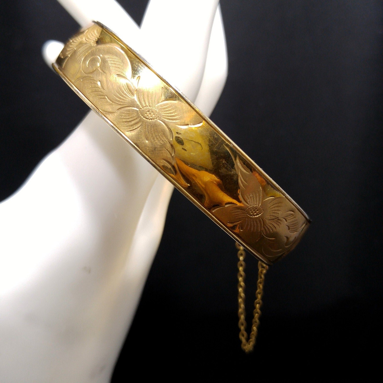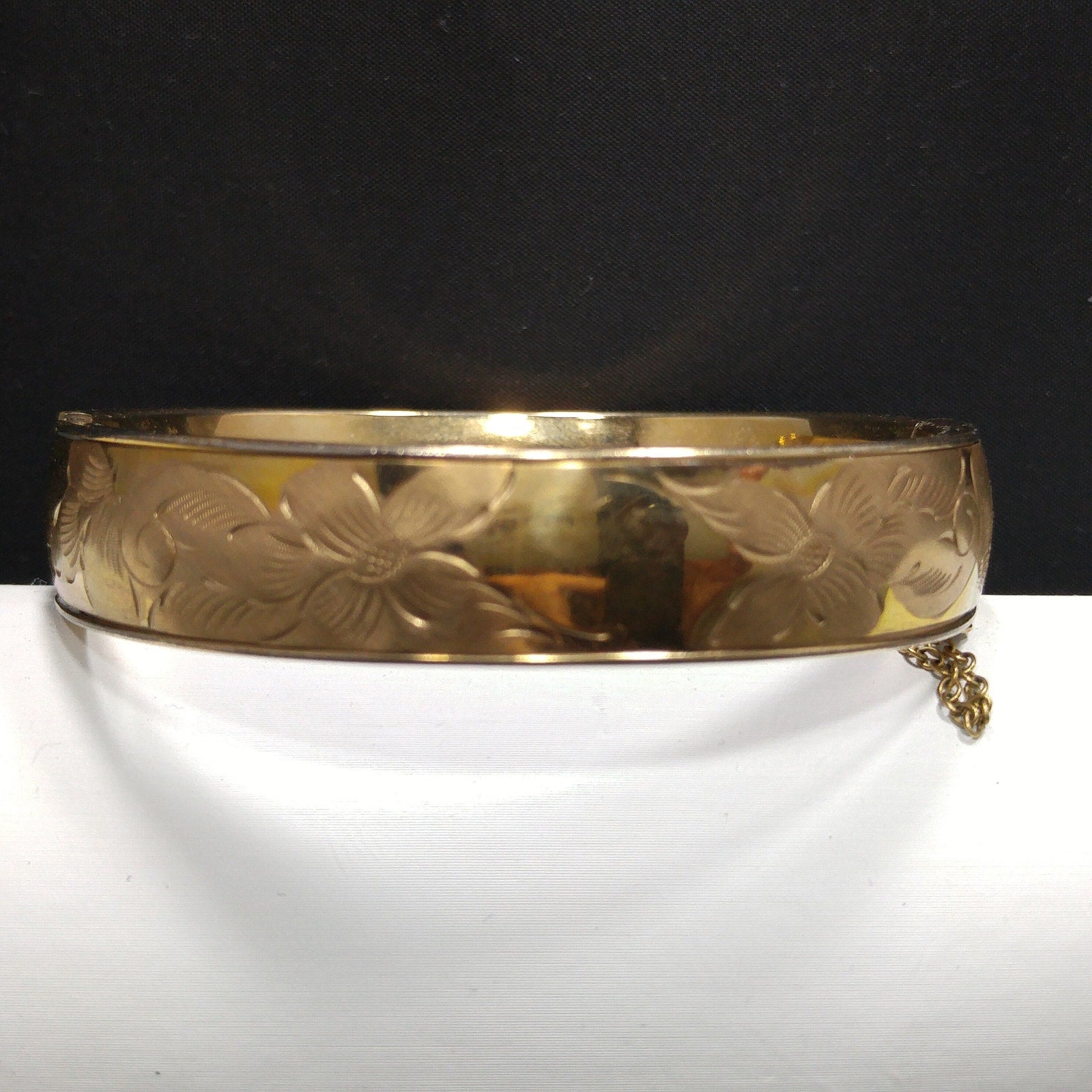 *Description: This is a beautiful 12K gold filled bracelet with embossed flowers on one side from the 1930s. The bracelet has a hinge and push clasp with an added safety chain. The bracelet is 7 inches around the inside and is 1/2 inch wide. FISHEL, NESSLER & CO. of New York, NY began their company in approximately 1885 and were in business until at least 1936. So this bracelet could be an antique, rather than vintage. This would be a great addition to your vintage jewelry collection or make a great vintage gift!