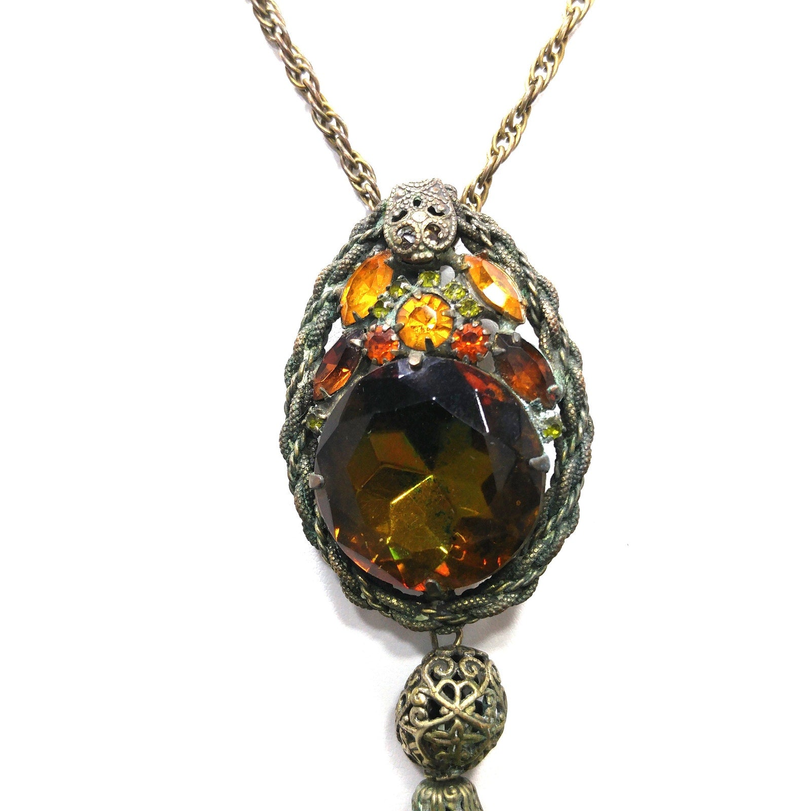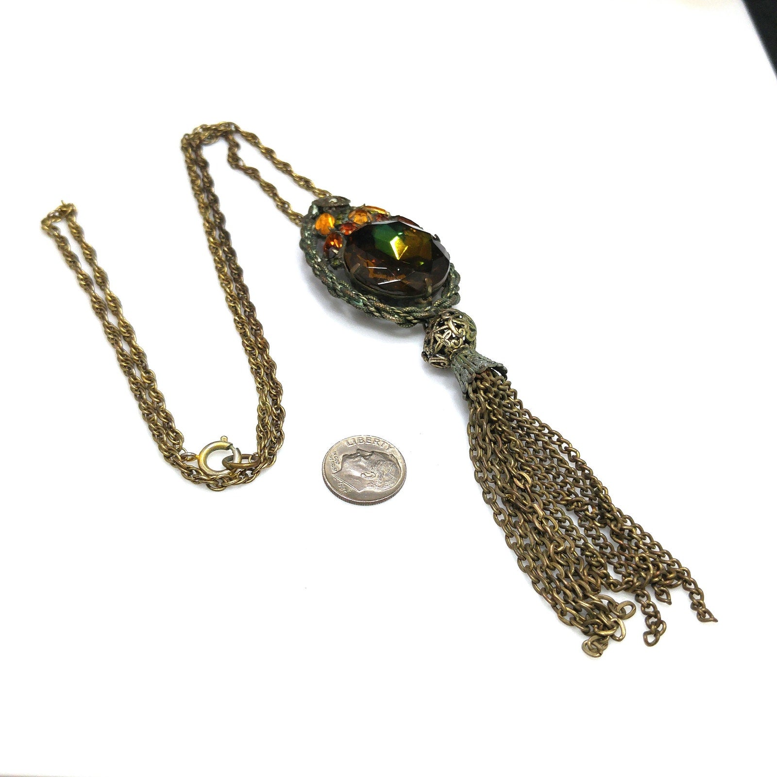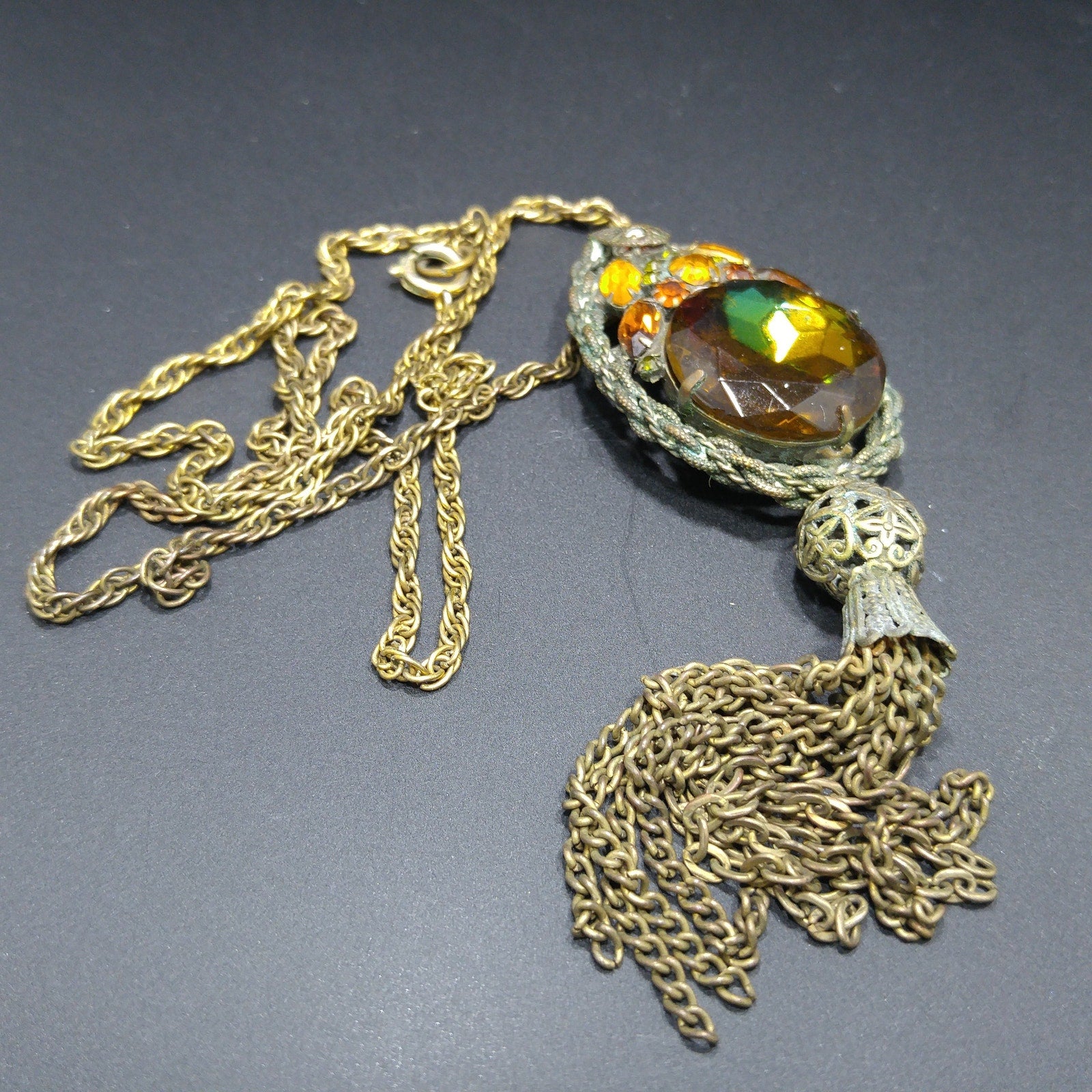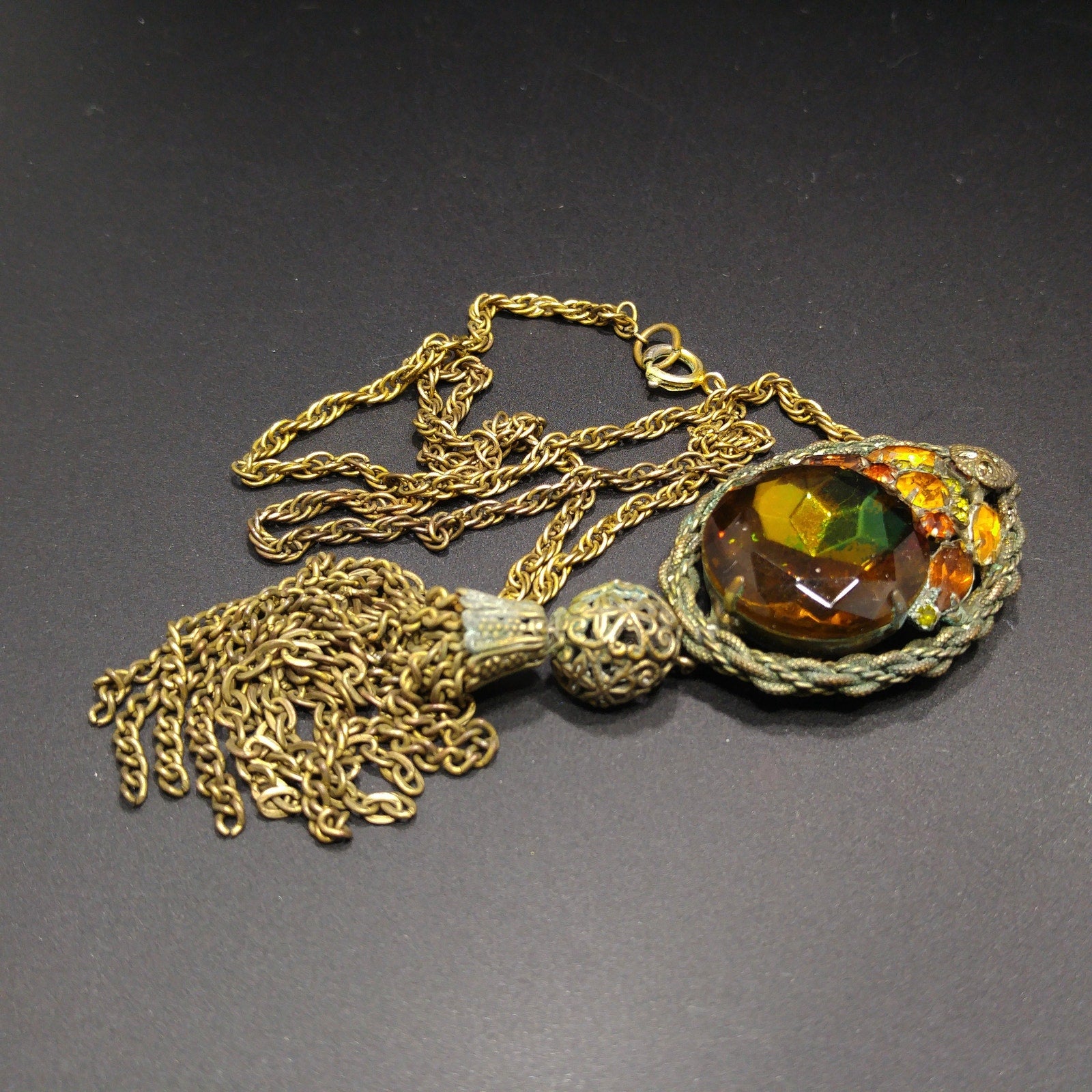 *Description: This is a beautiful antique large purple glass necklace with hints of green in the light and accented with yellow orange topaz rhinestones; all set with a rope design and added chain tassel from around the 1920s. The spring ring clasp is large and may be a little newer than the necklace. Brass does have patina after many years which may be cleaned if you choose. The glass rhinestones are prong set and all in place. The back has the pendant bail and the large glass stone is completely encased in the back. If you are looking for an old antique necklace, this may be the one for you. This would be a great addition to your vintage jewelry collection or make a great vintage gift!