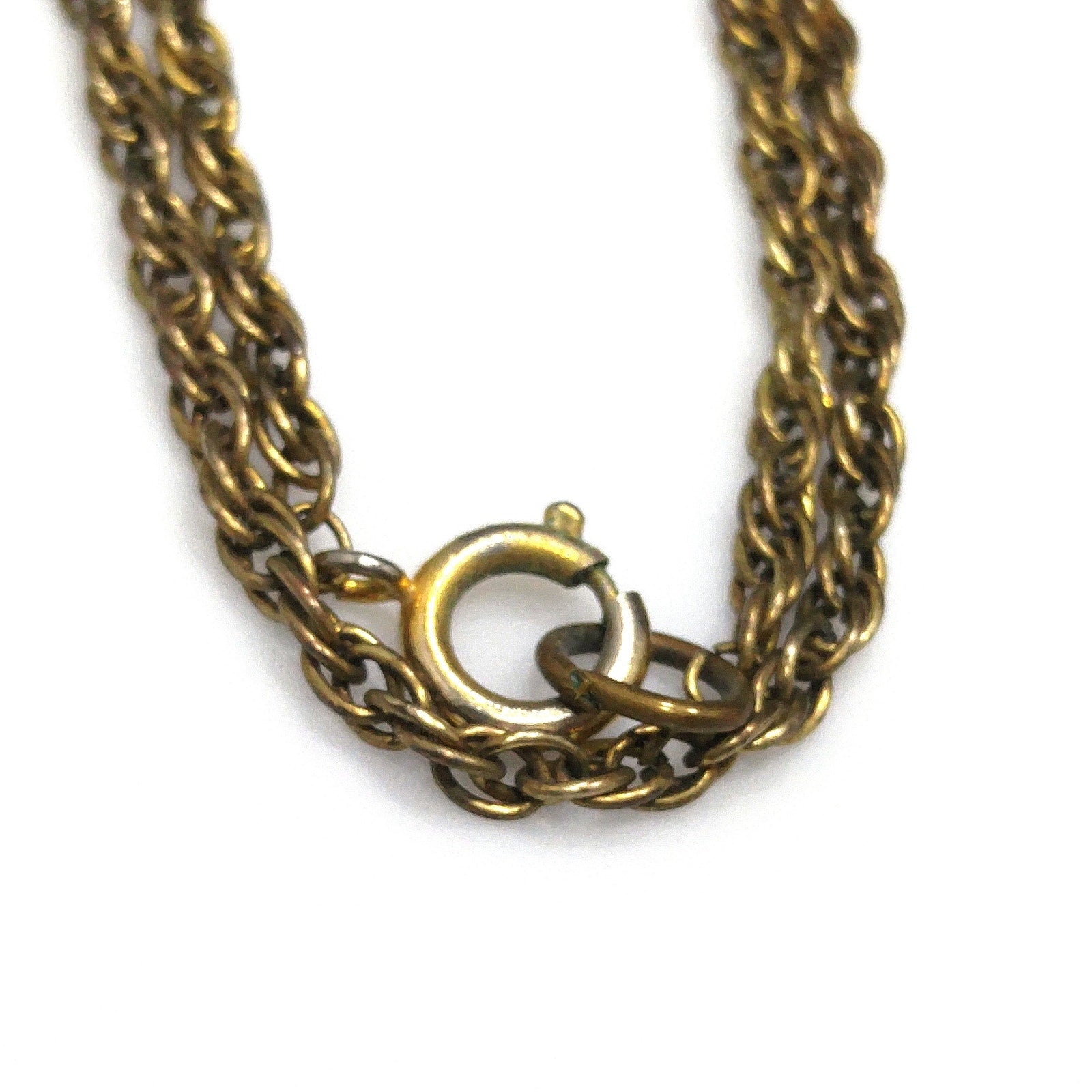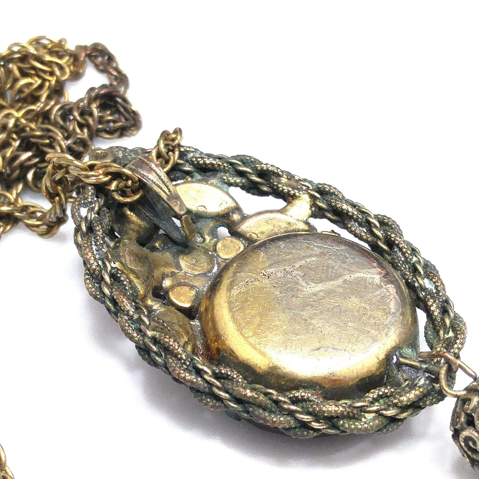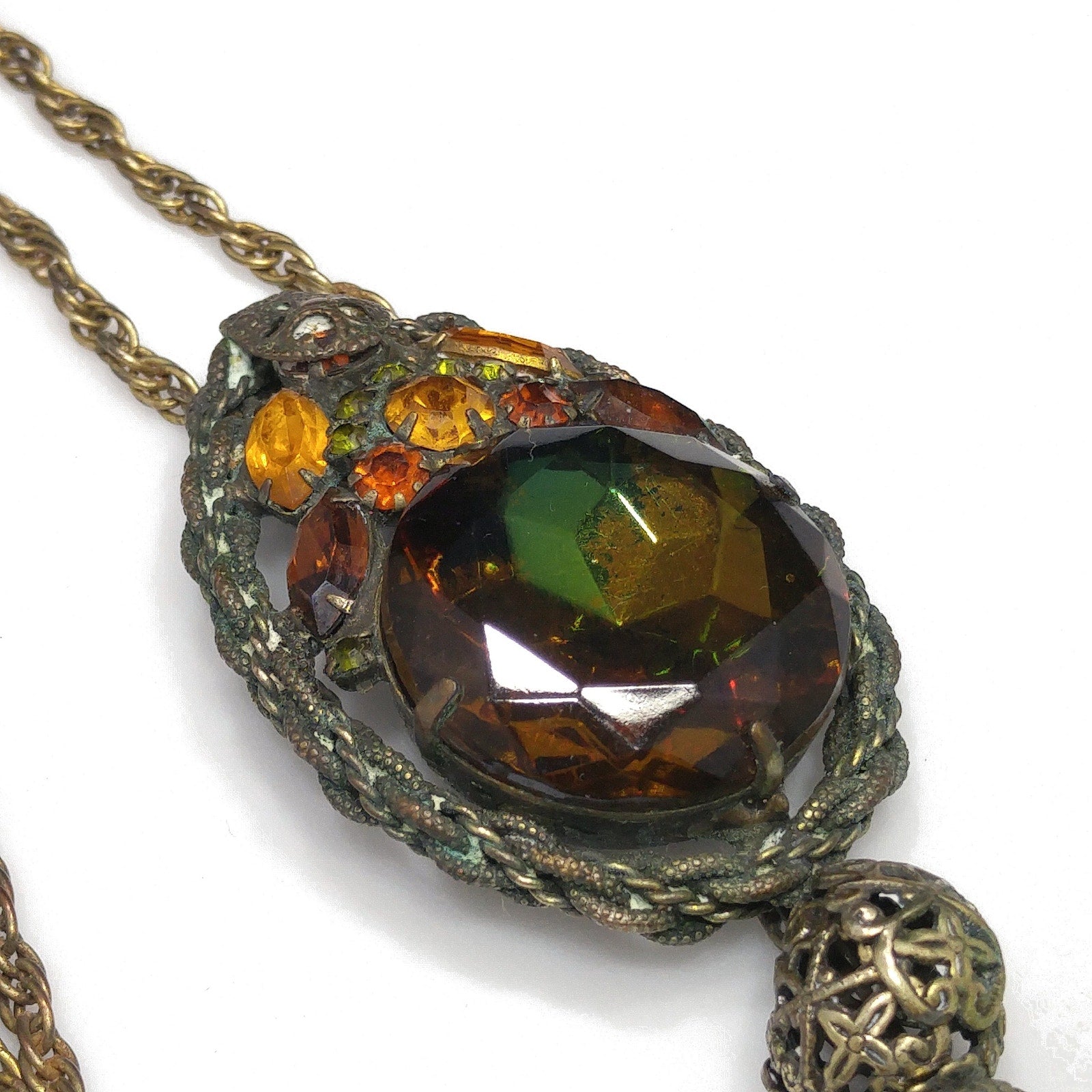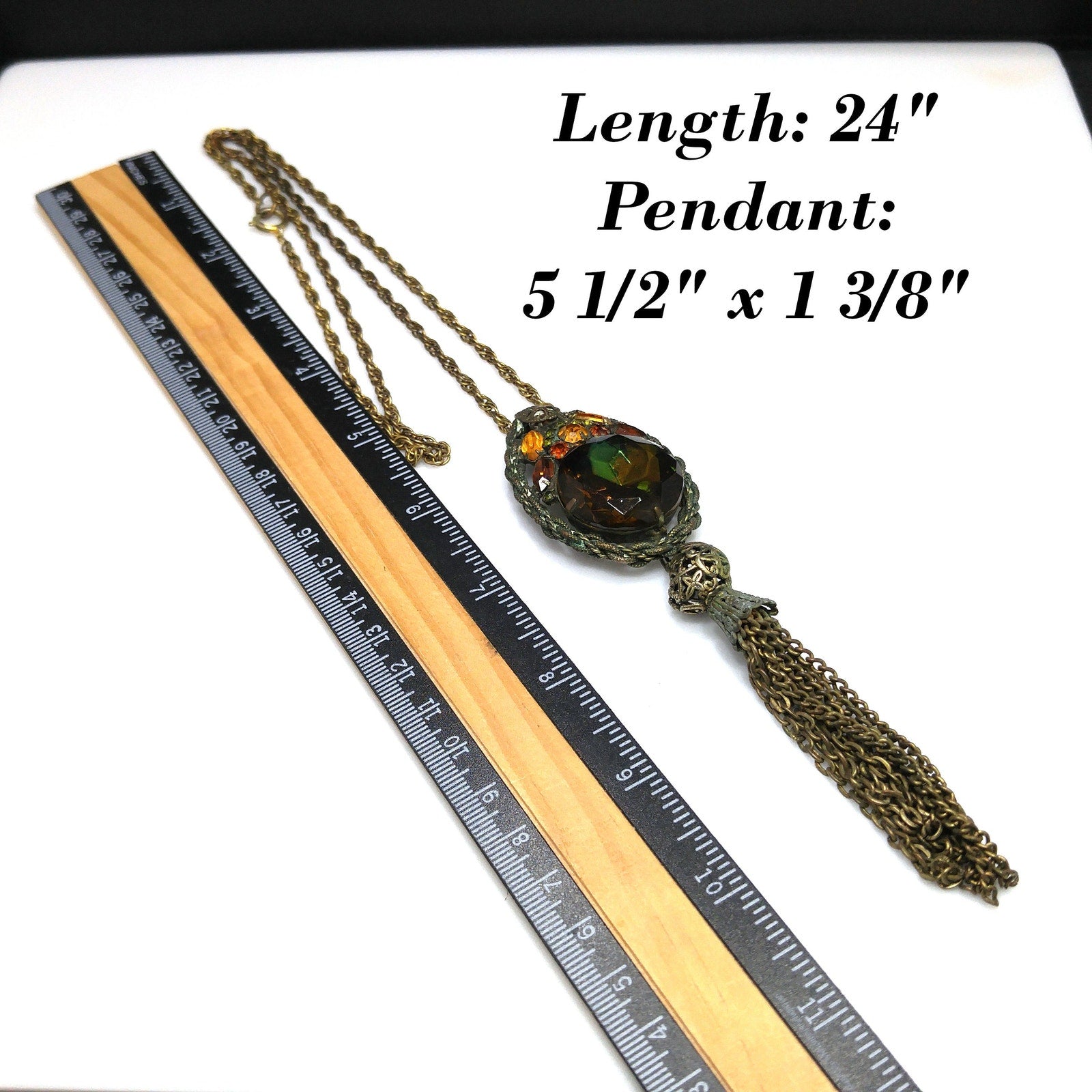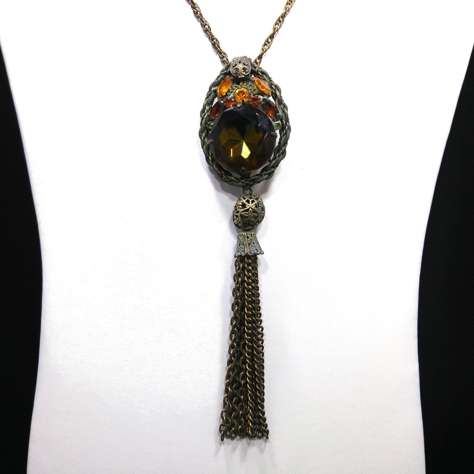 *Description: This is a beautiful antique large purple glass necklace with hints of green in the light and accented with yellow orange topaz rhinestones; all set with a rope design and added chain tassel from around the 1920s. The spring ring clasp is large and may be a little newer than the necklace. Brass does have patina after many years which may be cleaned if you choose. The glass rhinestones are prong set and all in place. The back has the pendant bail and the large glass stone is completely encased in the back. If you are looking for an old antique necklace, this may be the one for you. This would be a great addition to your vintage jewelry collection or make a great vintage gift!