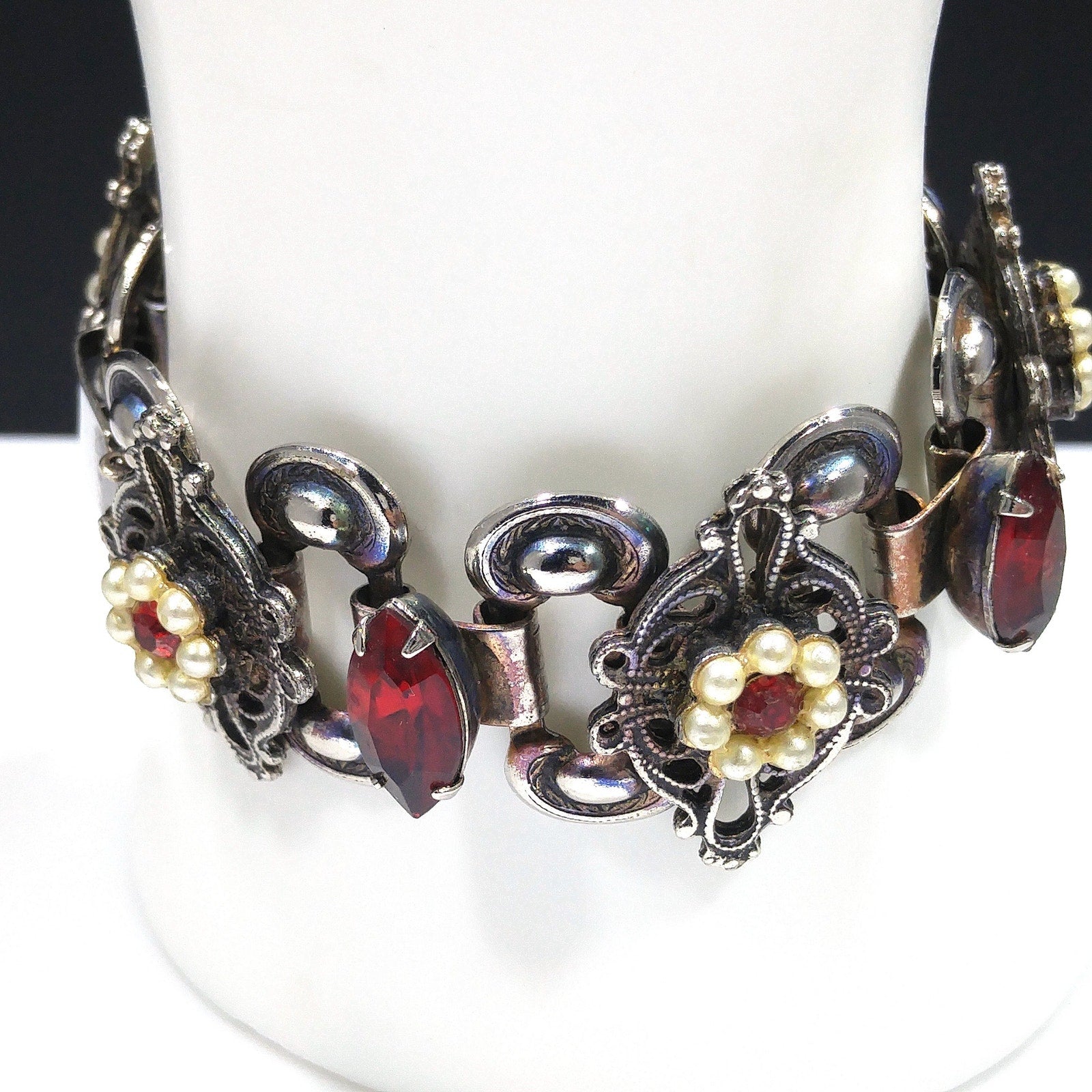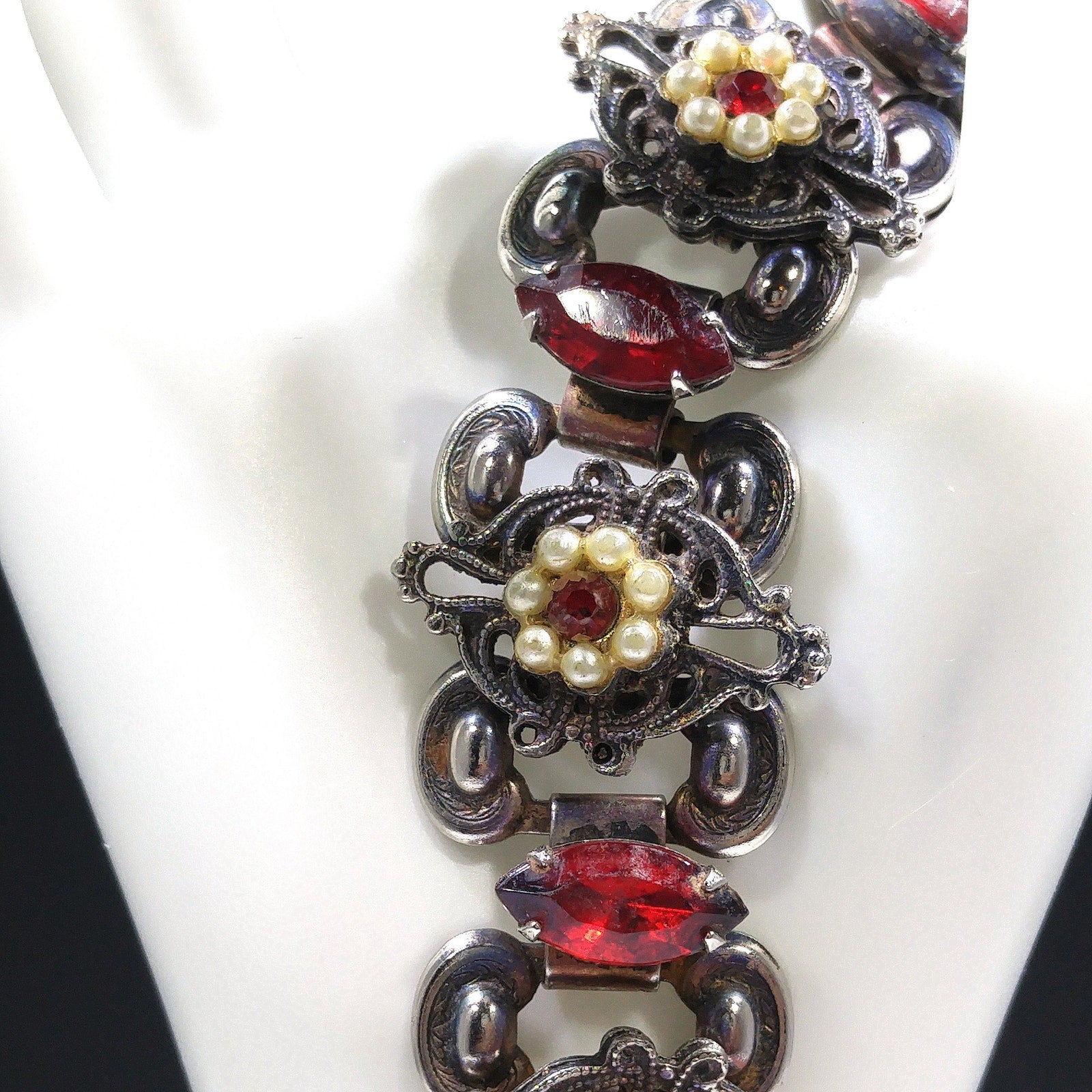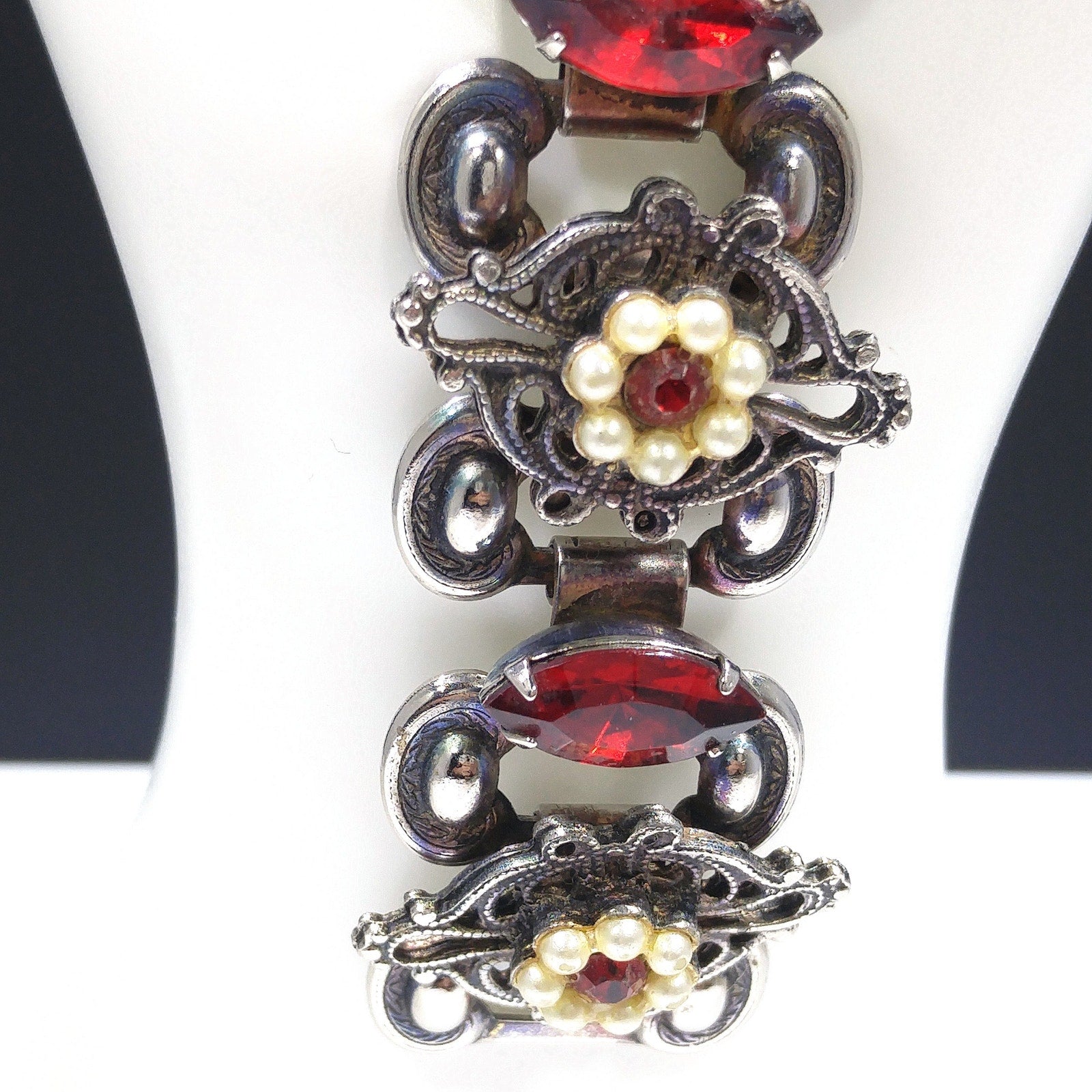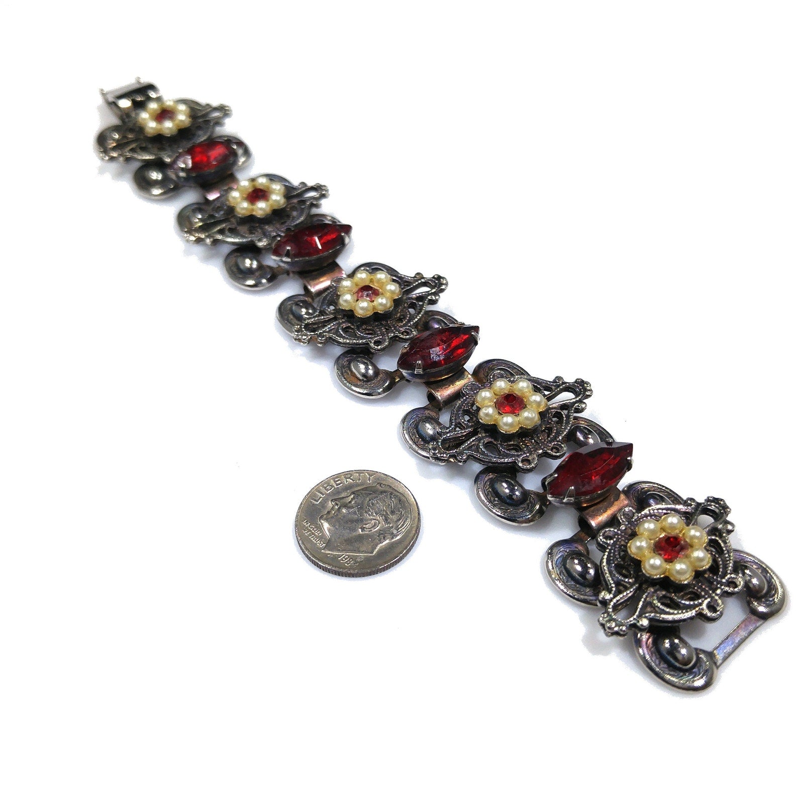Victorian Red Rhinestone Book Chain Bracelet, Faux Pearl Flowers, 1940s Vintage Jewelry