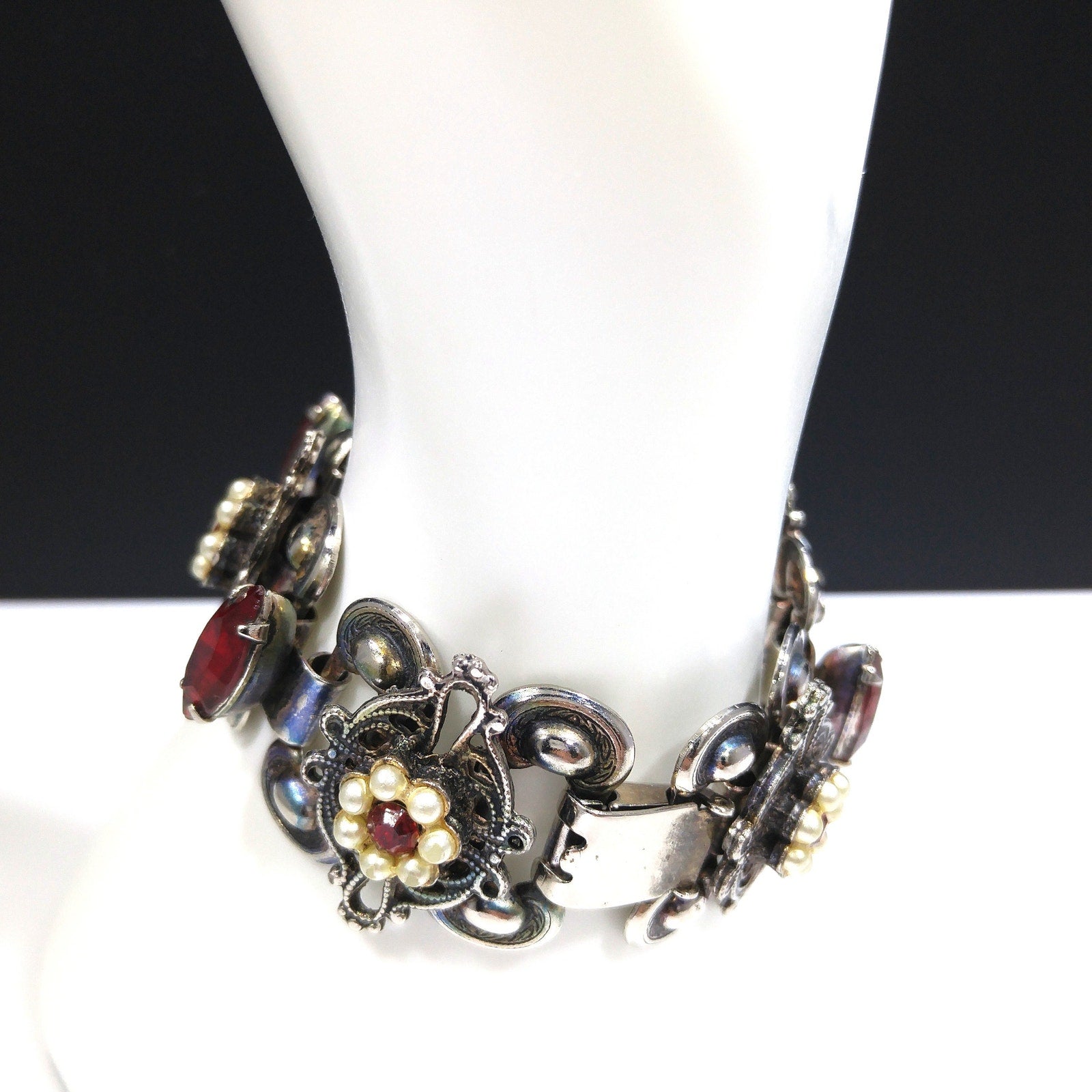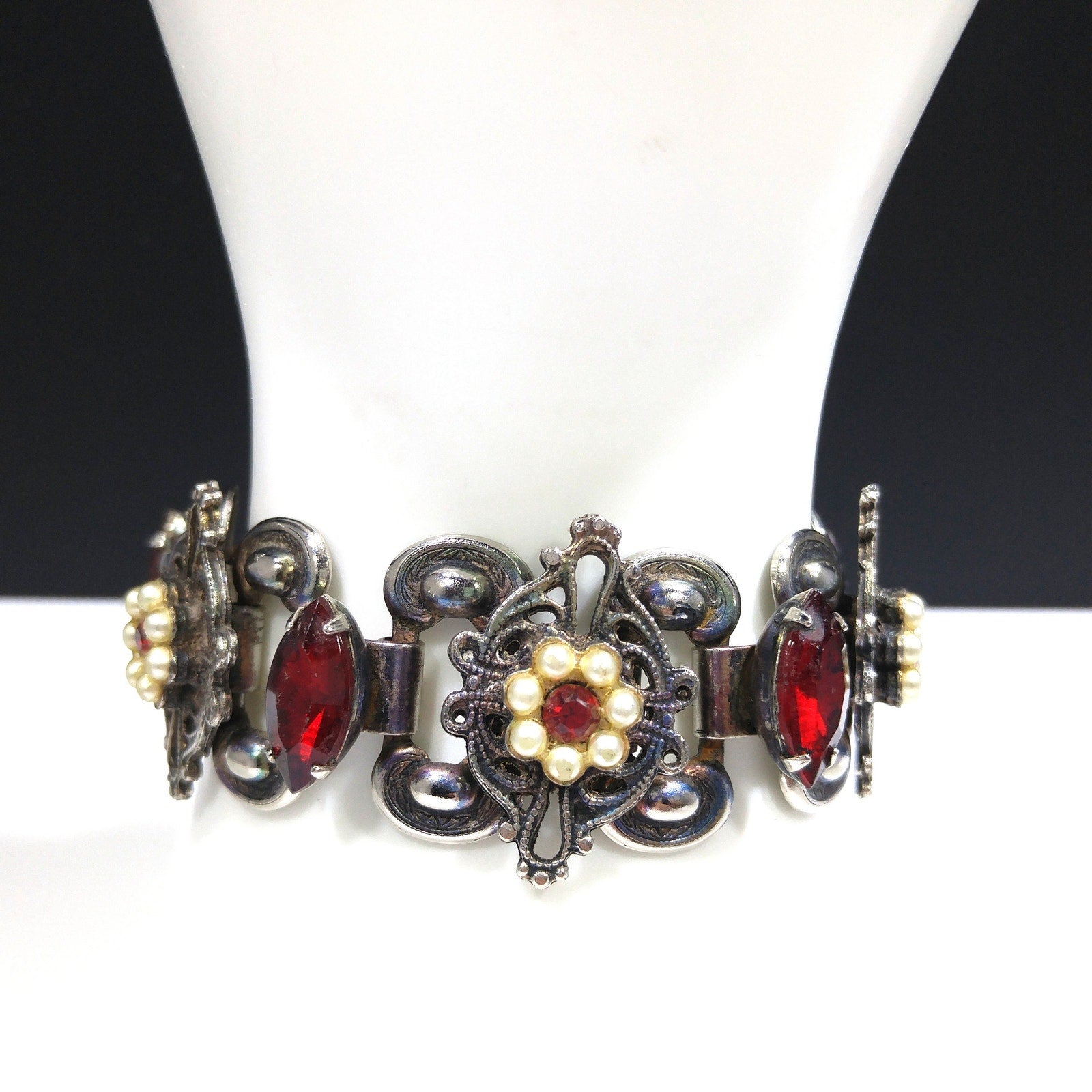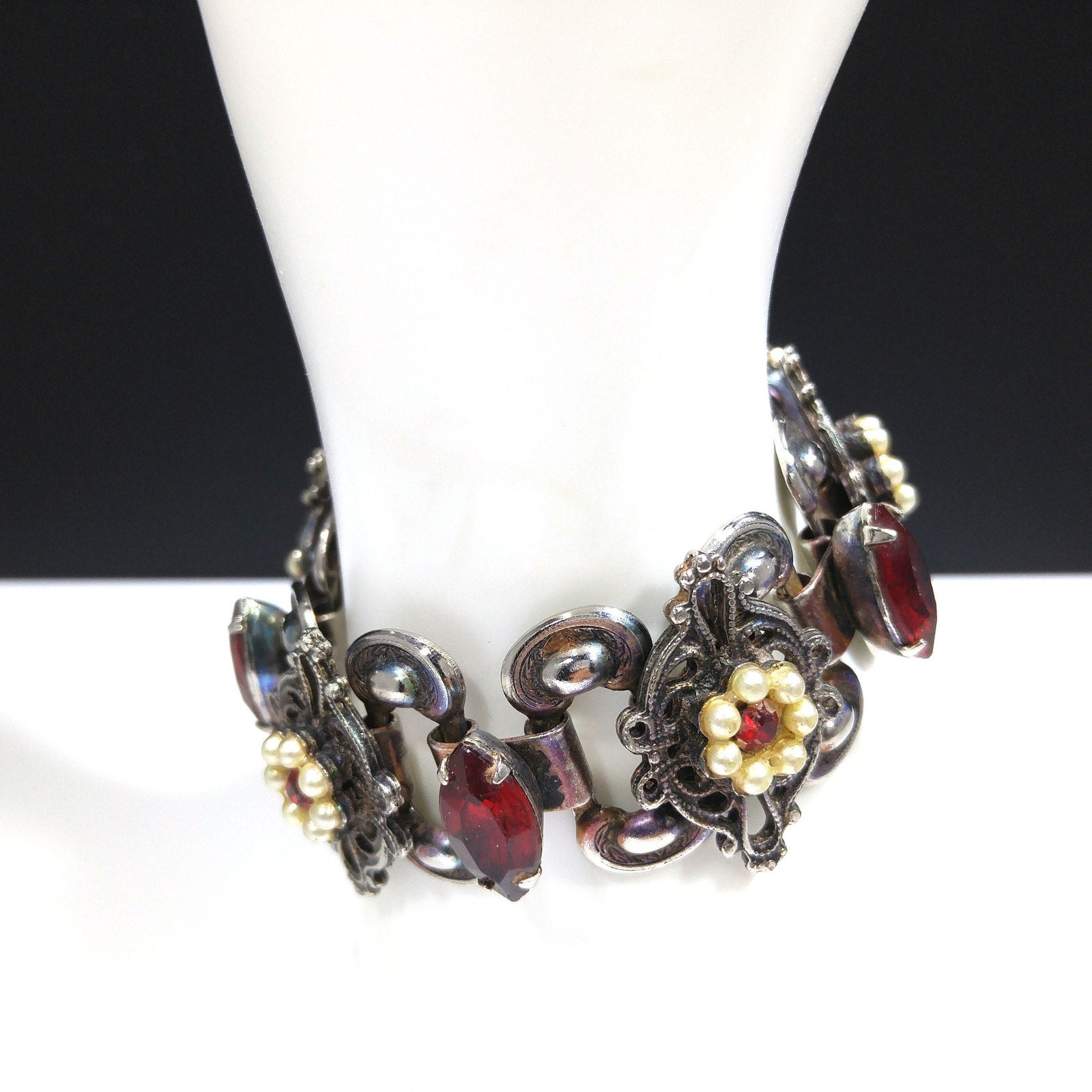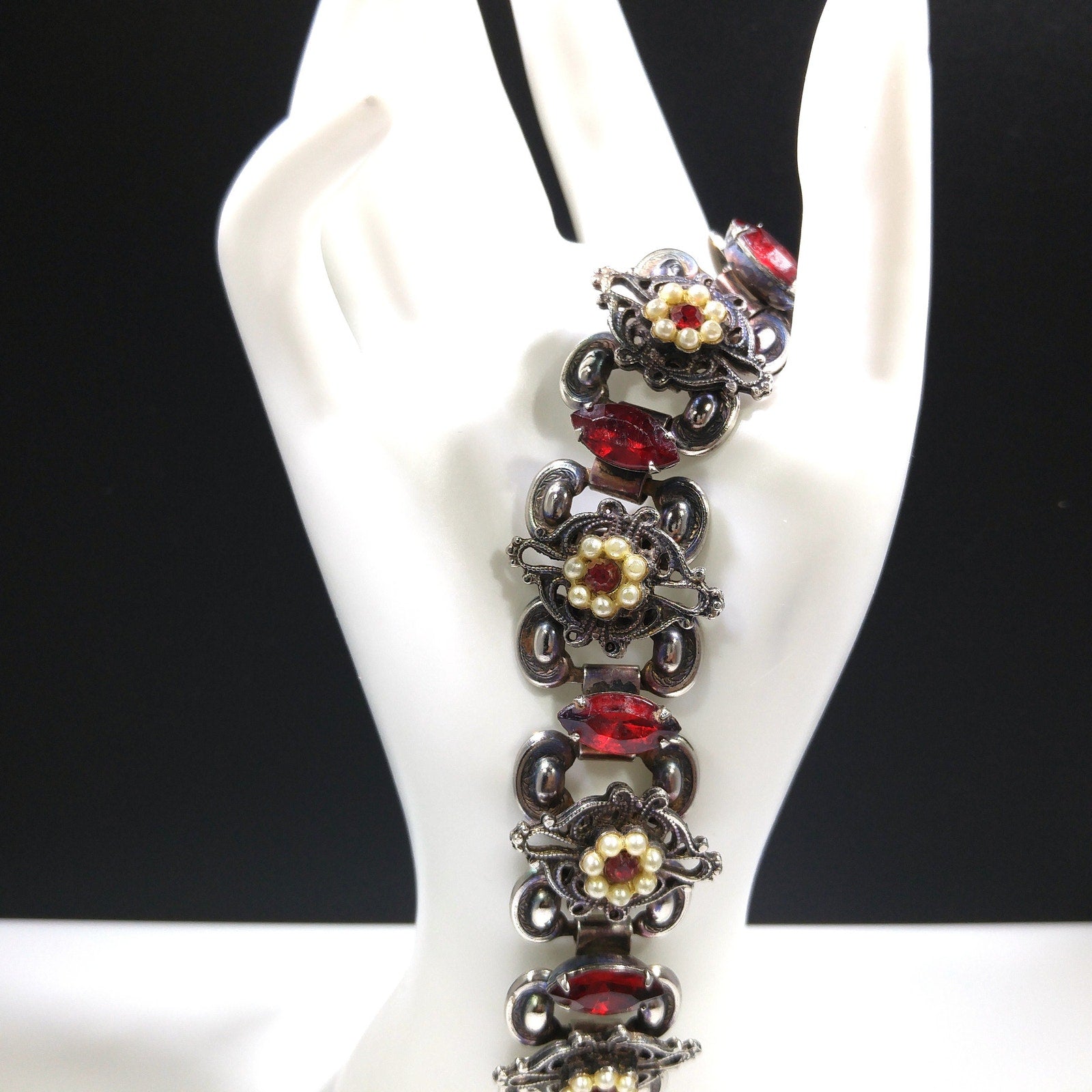 Victorian Red Rhinestone Book Chain Bracelet, Faux Pearl Flowers, 1940s Vintage Jewelry