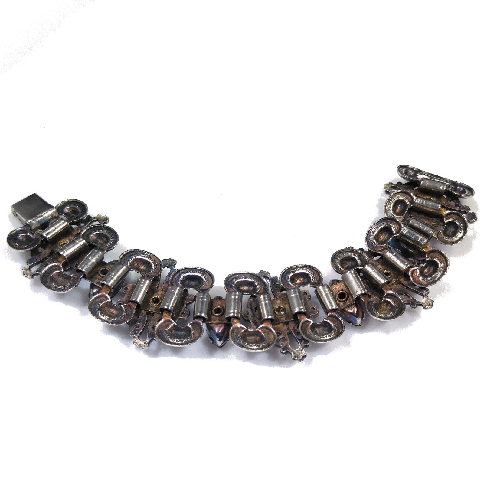 *Description: This is a great red rhinestone floral book chain bracelet from the 1940s. The bracelet has a faux pearl flower with a red rhinestone center on each link. It has a fold over clasp. Book chain bracelets are becoming more difficult to find and this one is in very good condition. This would be a great addition to your vintage jewelry collection or make a great vintage gift!