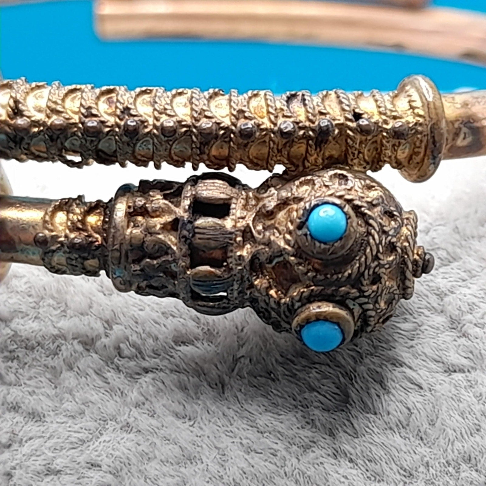 This bracelet is crafted with ornate gold-tone filigree and detailed textured snake bodies, each crowned with a serpent head set with turquoise bead eyes. As expected with true antiques, one turquoise bead is missing—evidence of its authentic age and journey through time.