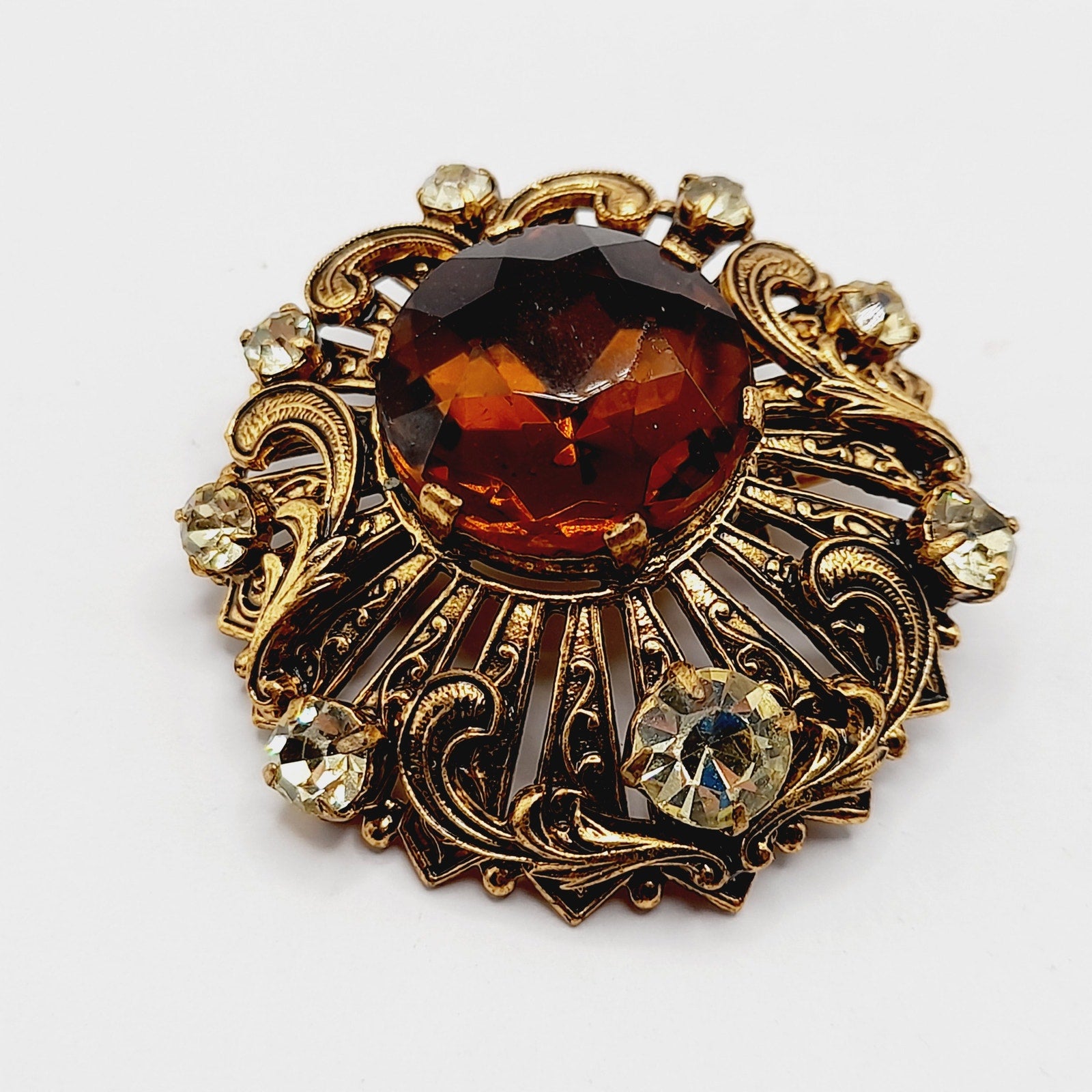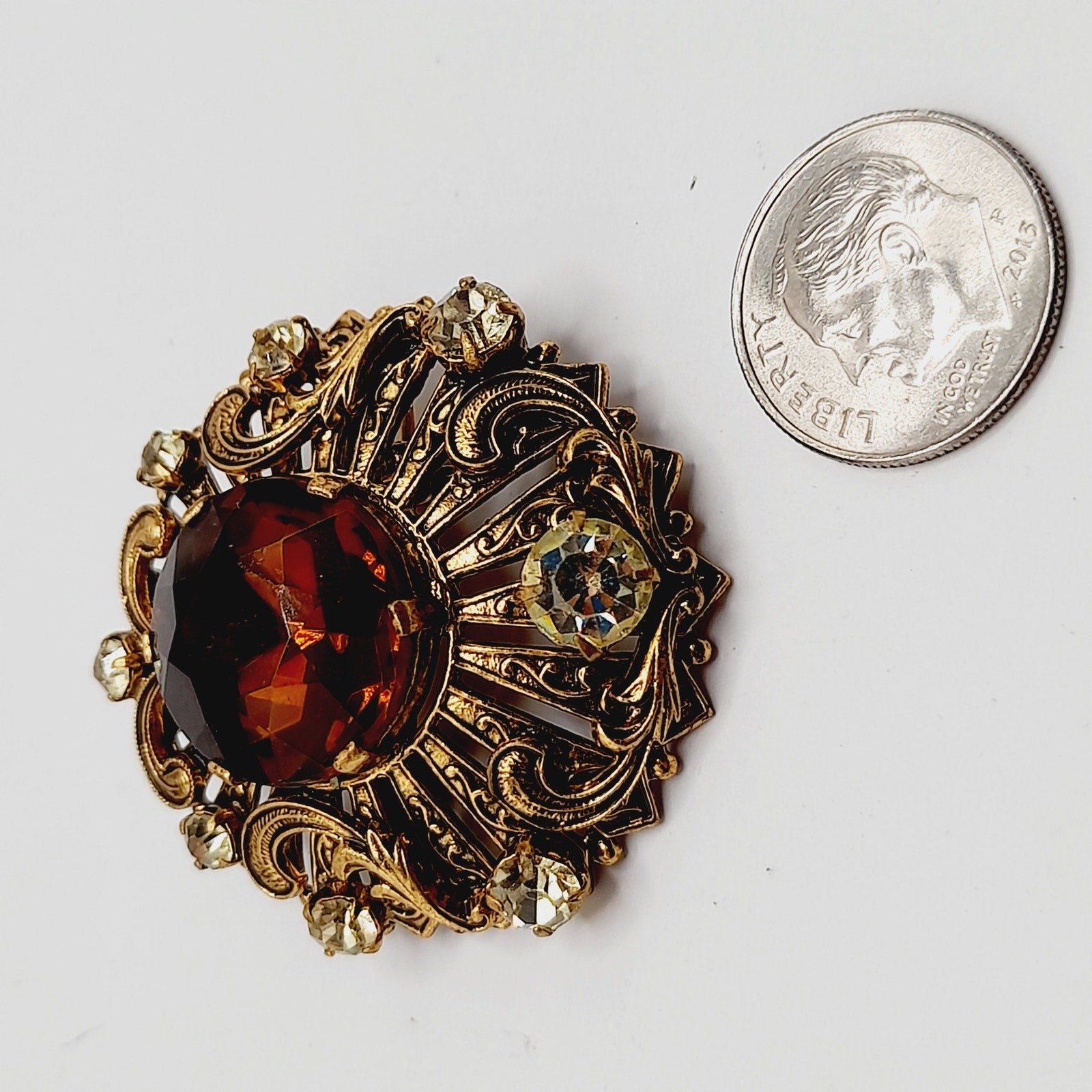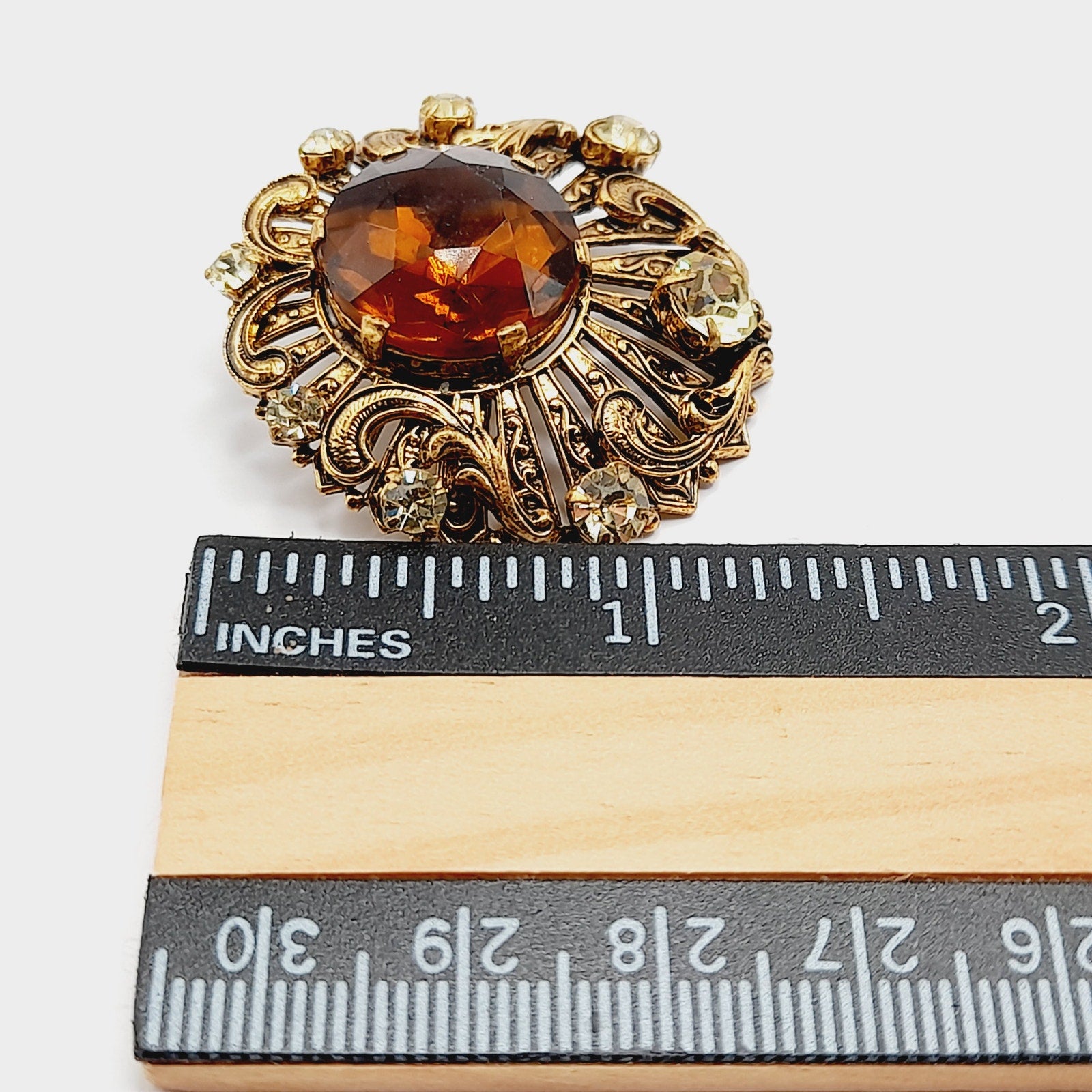 Vintage 1940s Topaz Rhinestone Filigree Brooch West Germany Style - 1 3/8 Inches
