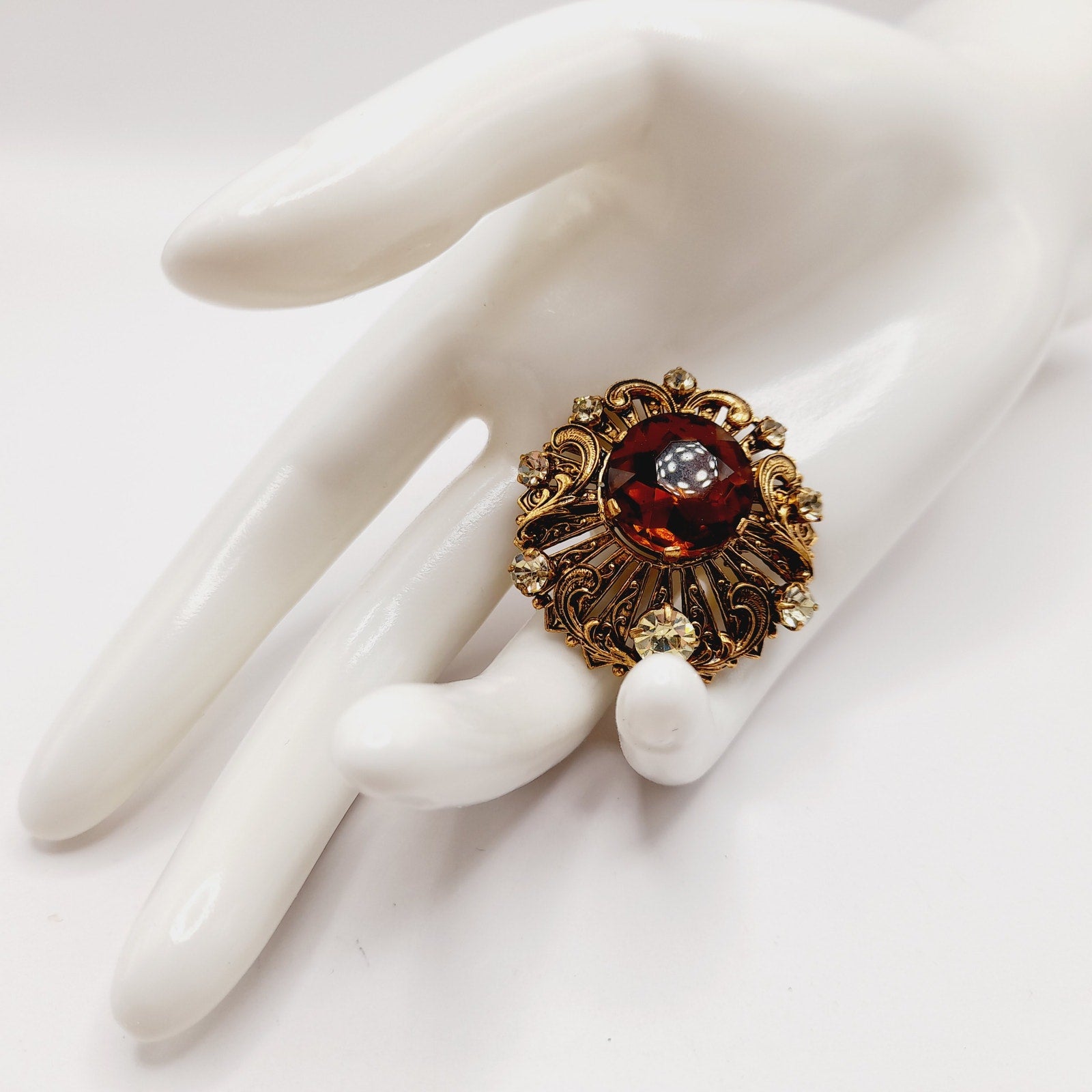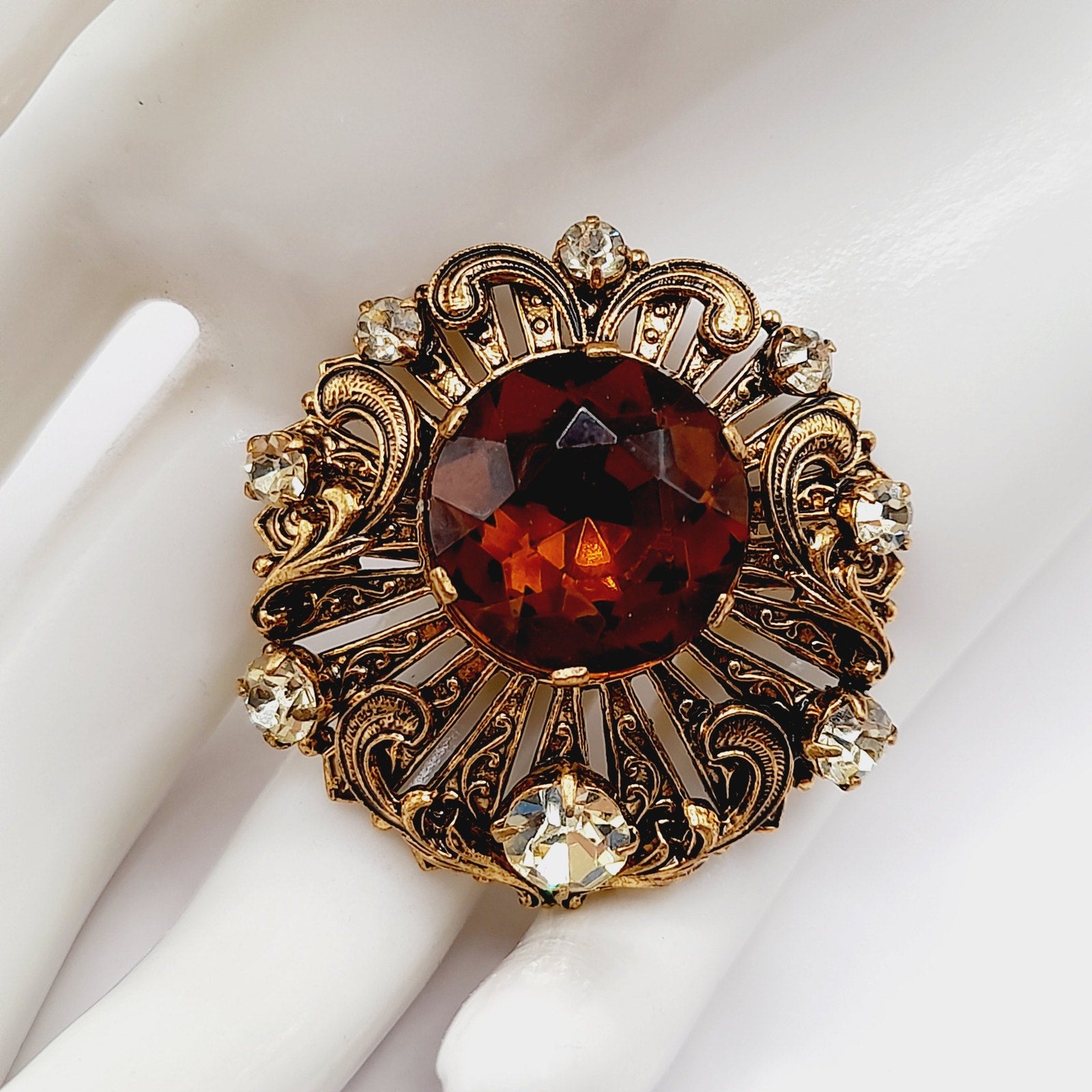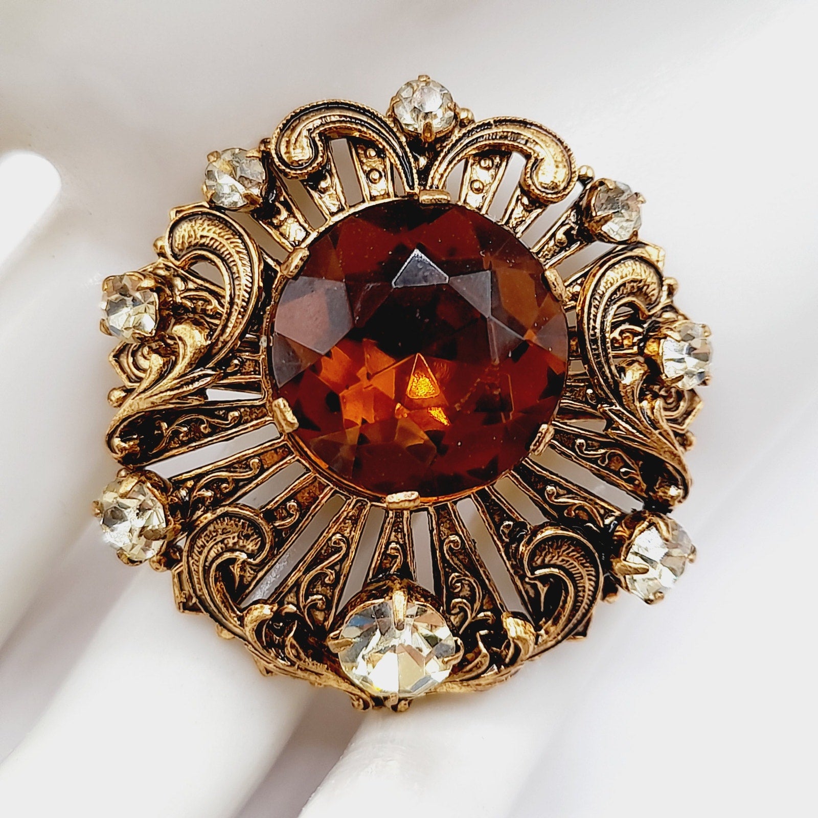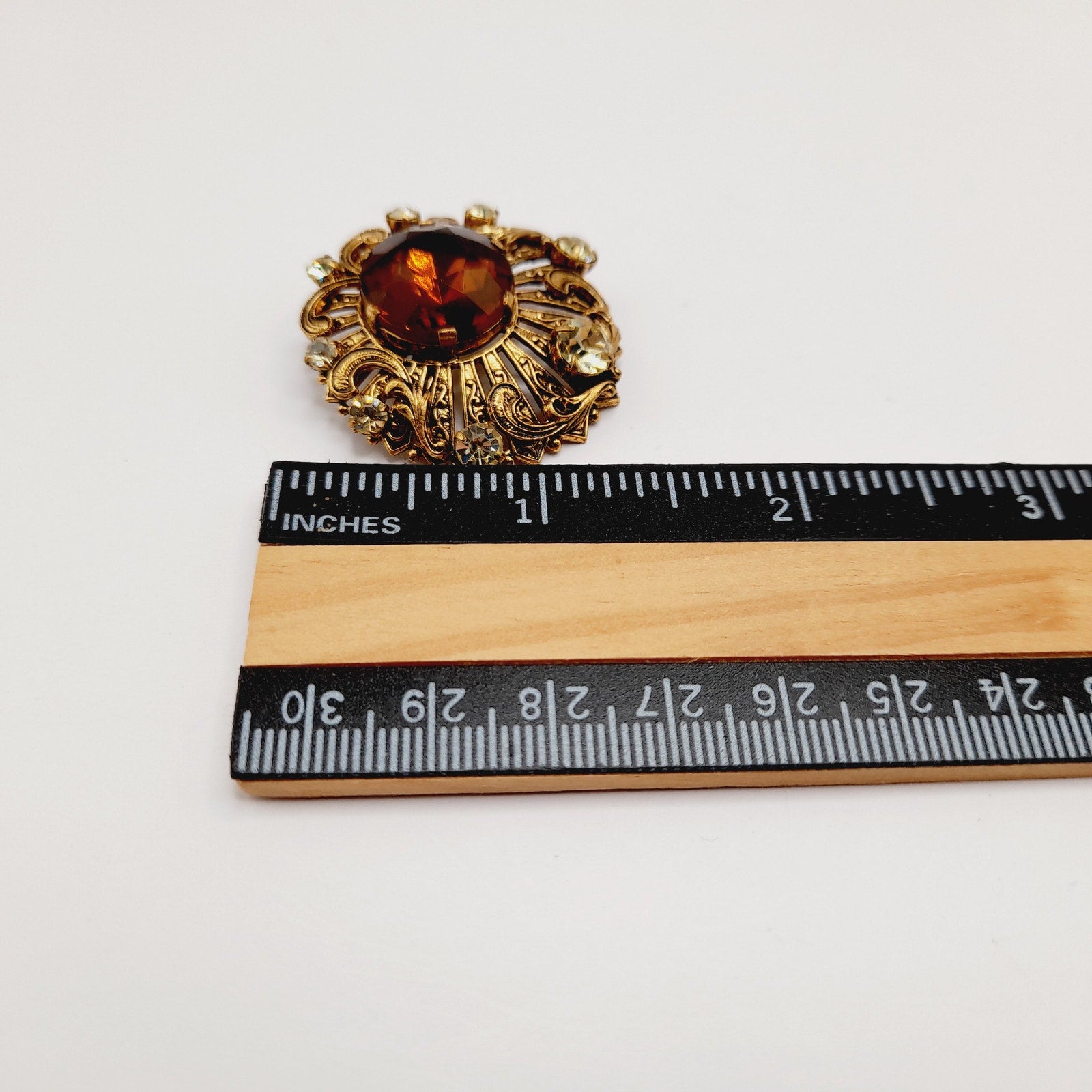 Vintage 1940s Topaz Rhinestone Filigree Brooch West Germany Style - 1 3/8 Inches