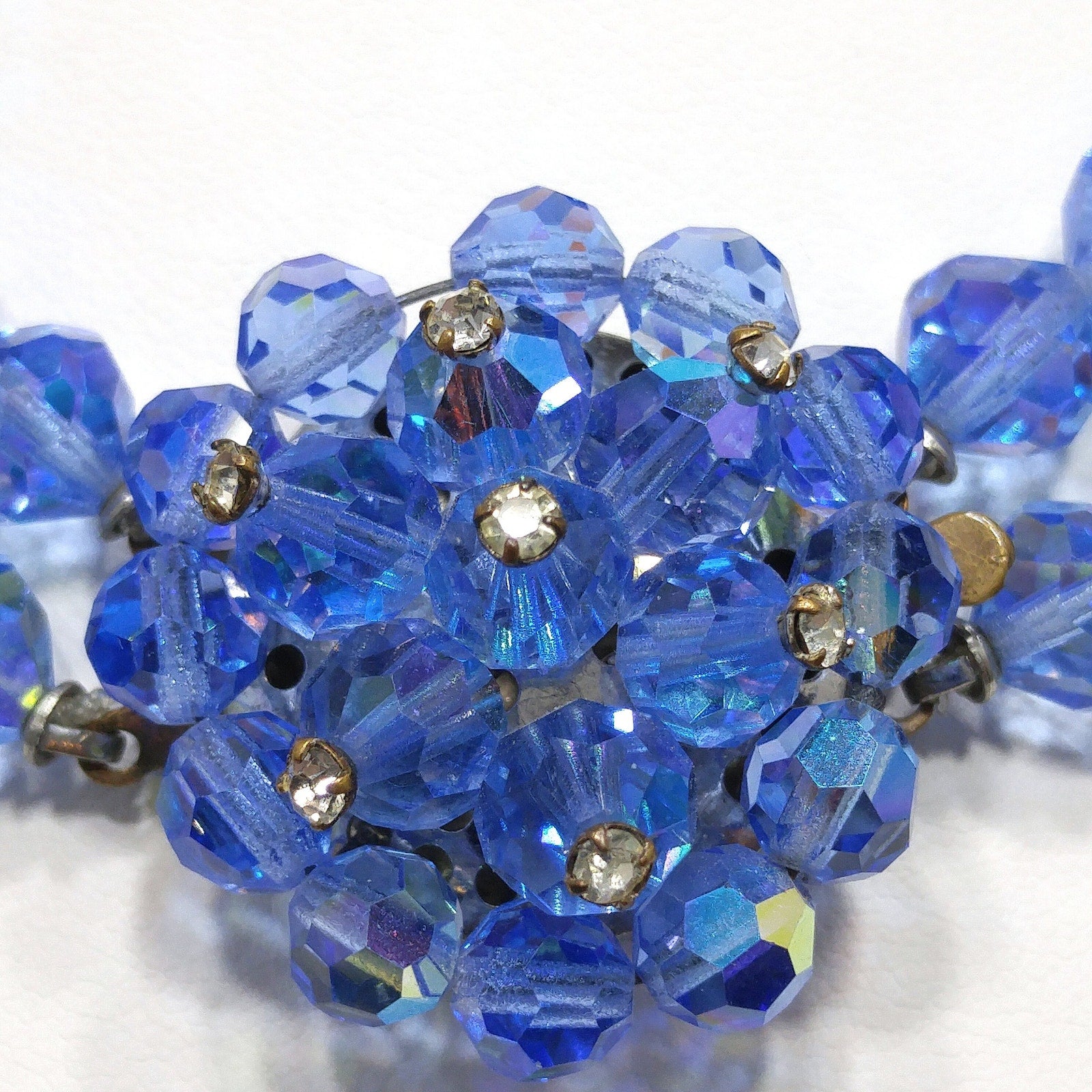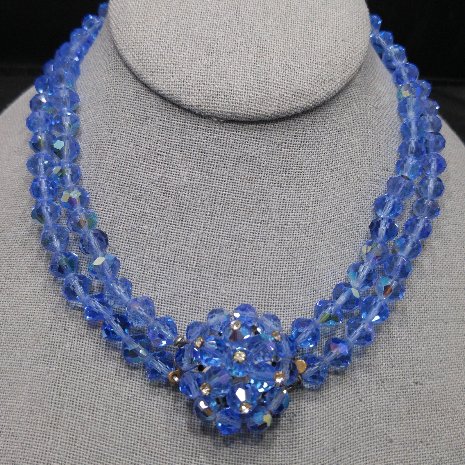 Vintage 1950s Aurora Borealis Blue Crystal Beaded Two-Strand Choker Necklace – Rhinestone Clasp