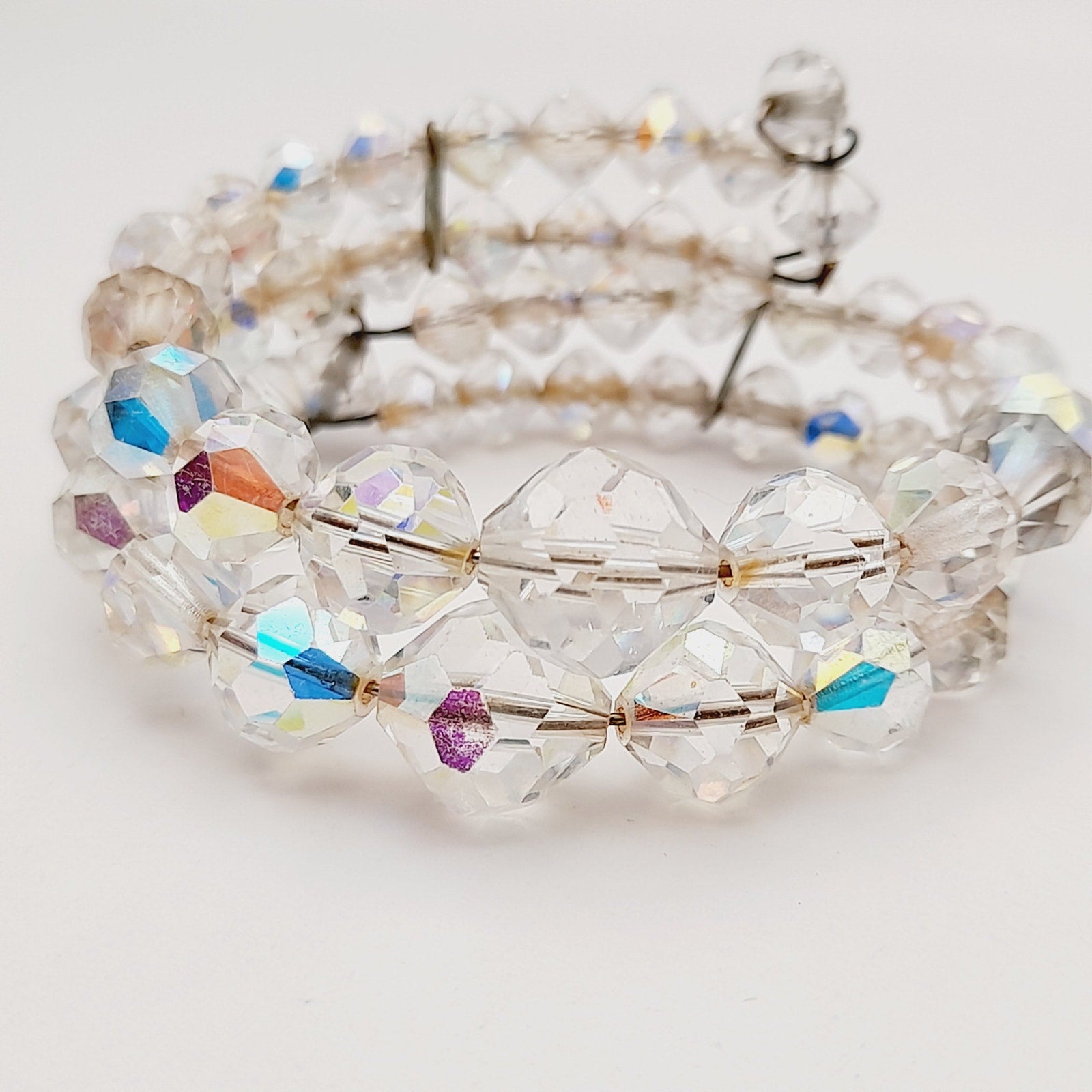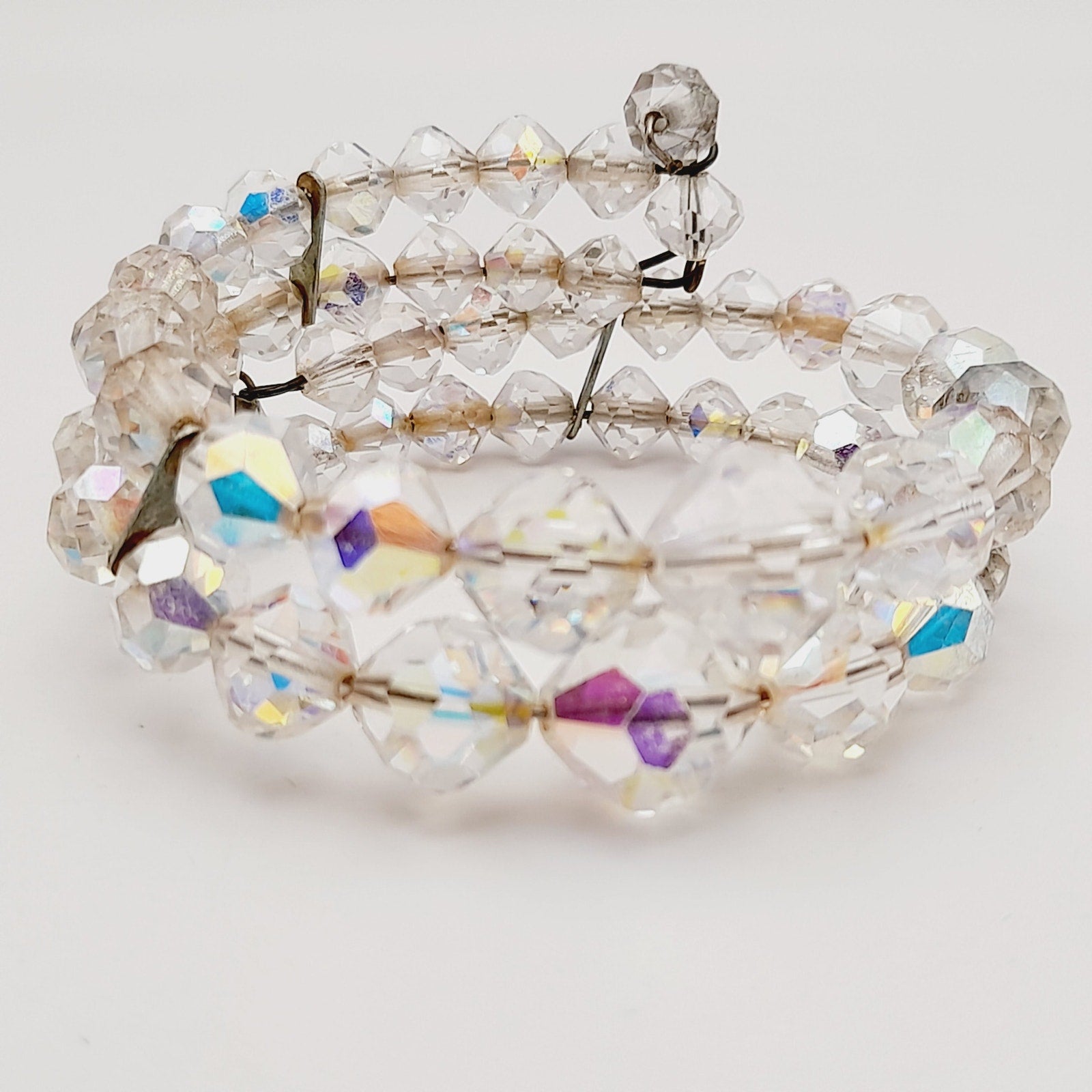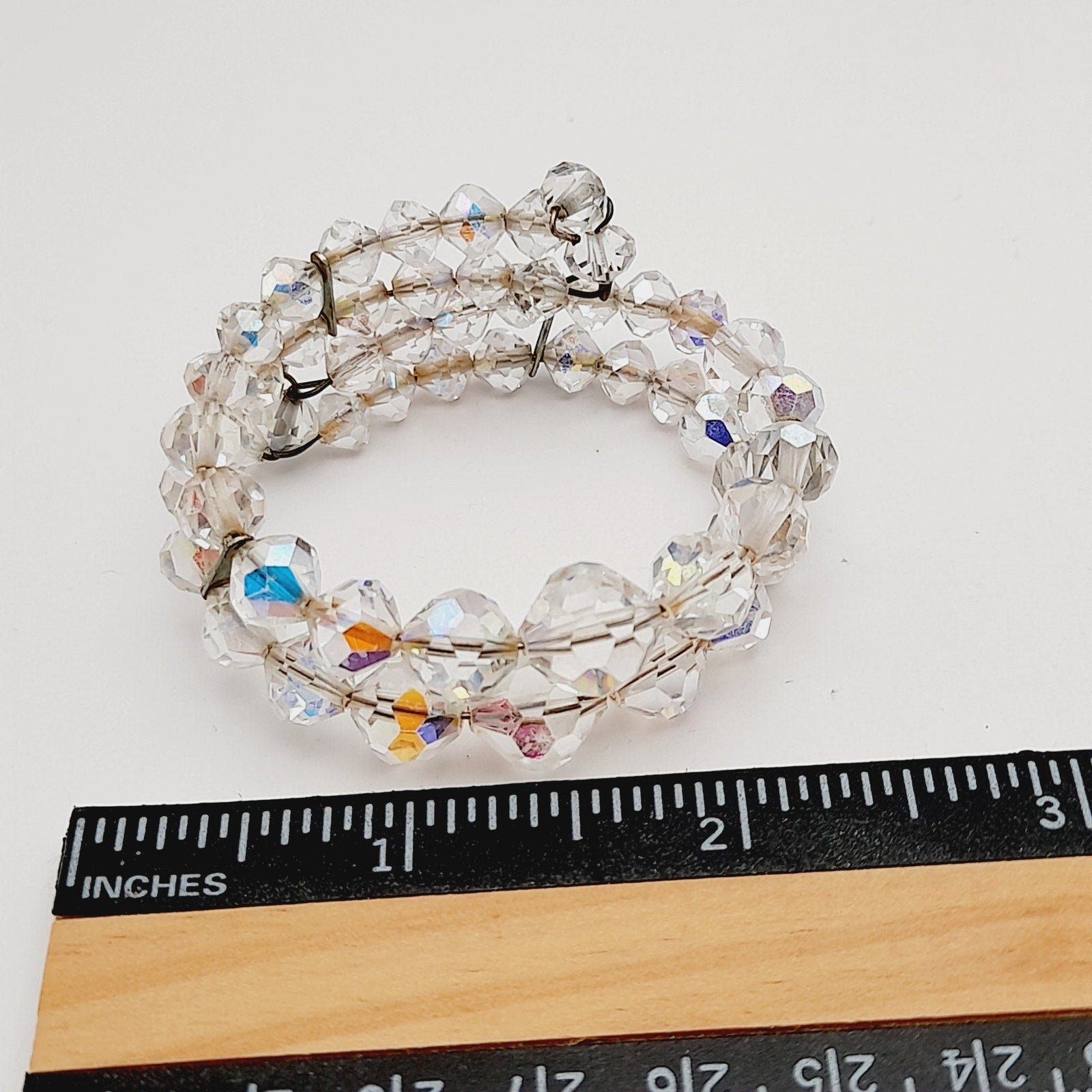 Bring the elegance of the 1950s to your jewelry collection with this dazzling vintage memory wire bracelet. Featuring two strands of clear crystals with a radiant Aurora Borealis finish, this bracelet captures and reflects light beautifully for a touch of timeless sparkle. The coiled memory wire allows for a flexible, easy fit, and the 6 3/4-inch size is perfect for small to average wrists.